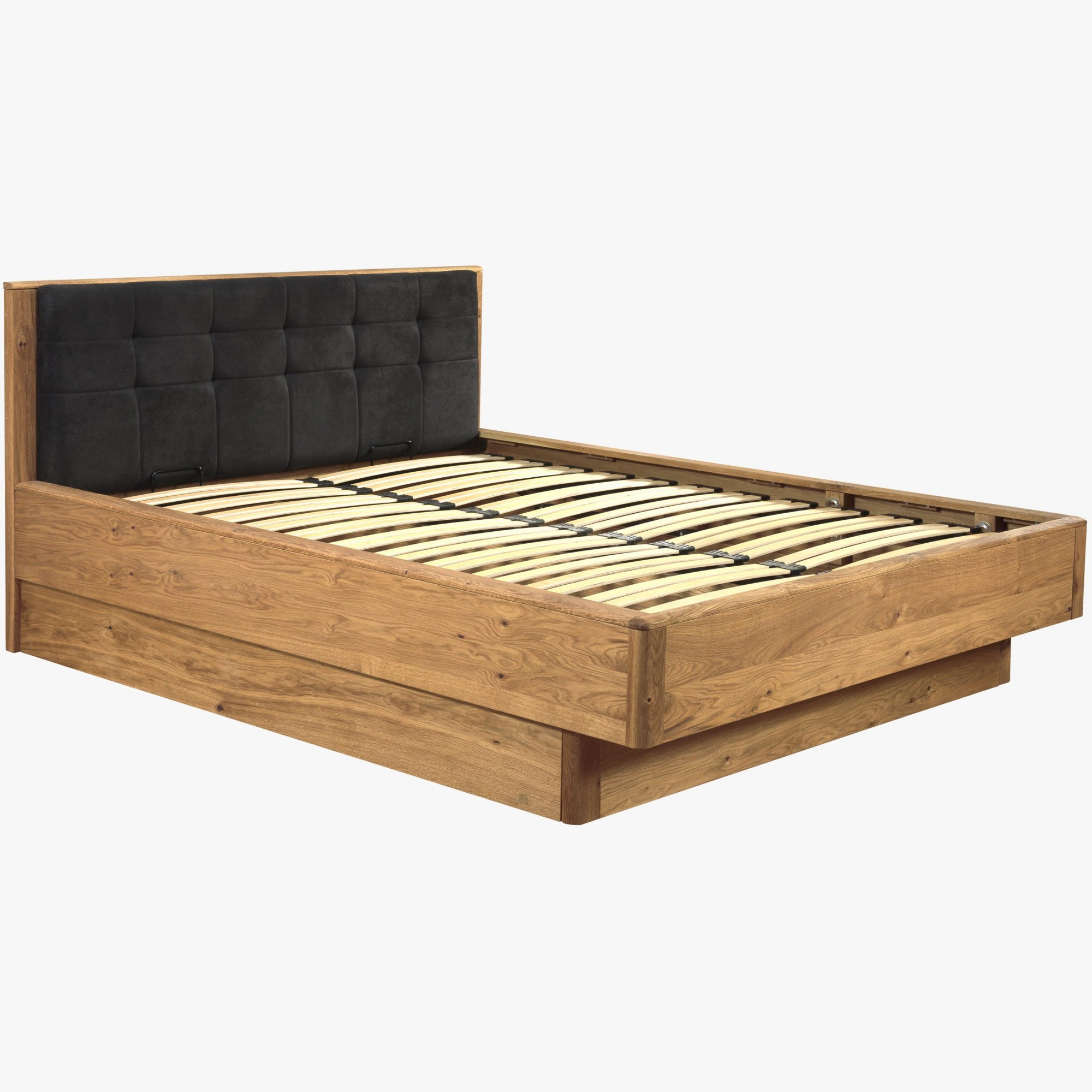 Luxusný kúsok do spálne, dubová posteľ Texas s úložným priestorom vyklápacím spredu. Posteľ Texas je dostupná v šírke matraca 140, 160 a 180 cm. Výhodou je veľký úložný priestor, ktorý sa otvára spredu postele, ideálne tak aj do menších spální. Manželská posteľ sa dodáva v demonte s podrobným montážnym návodom, v cene je už aj lamelový rošt, skladajúci sa z 32 lamiel vhodných ku každému typu matracov.