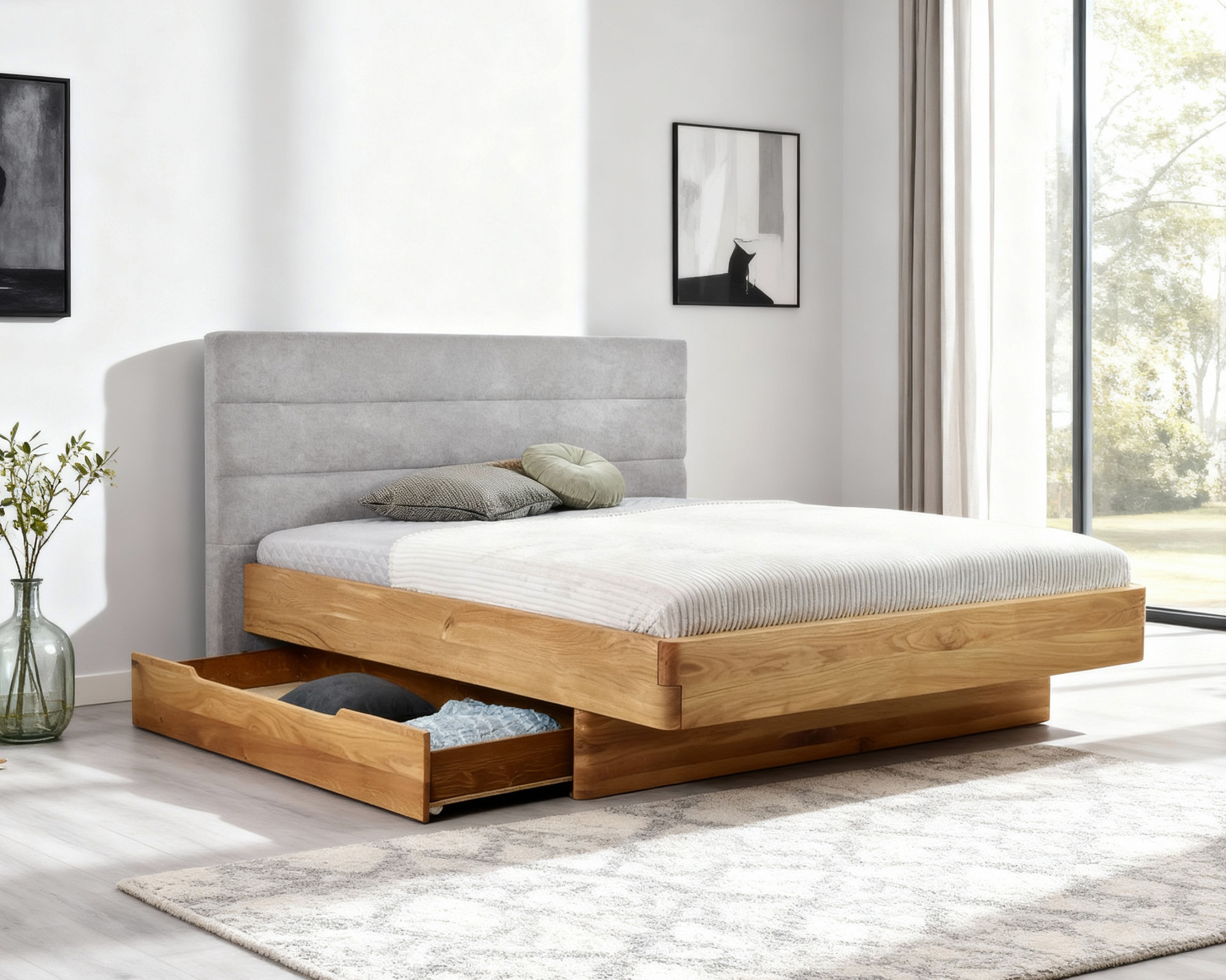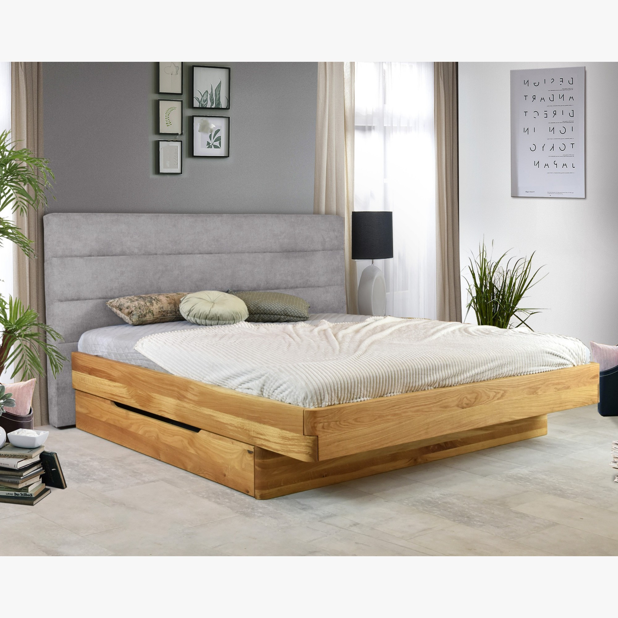 Táto dubová manželská posteľ Dominika je ideálna pre tých, ktorí hľadajú spojenie prírodného materiálu a moderného dizajnu. Posteľ má rozmery 180 x 200 cm, čo poskytuje dostatok priestoru pre pohodlný spánok. Vyrobená je z 100% masívneho dubového dreva a doplnená o jemné sivé látkové čelo, ktoré je príjemné na dotyk a odolné voči opotrebeniu.