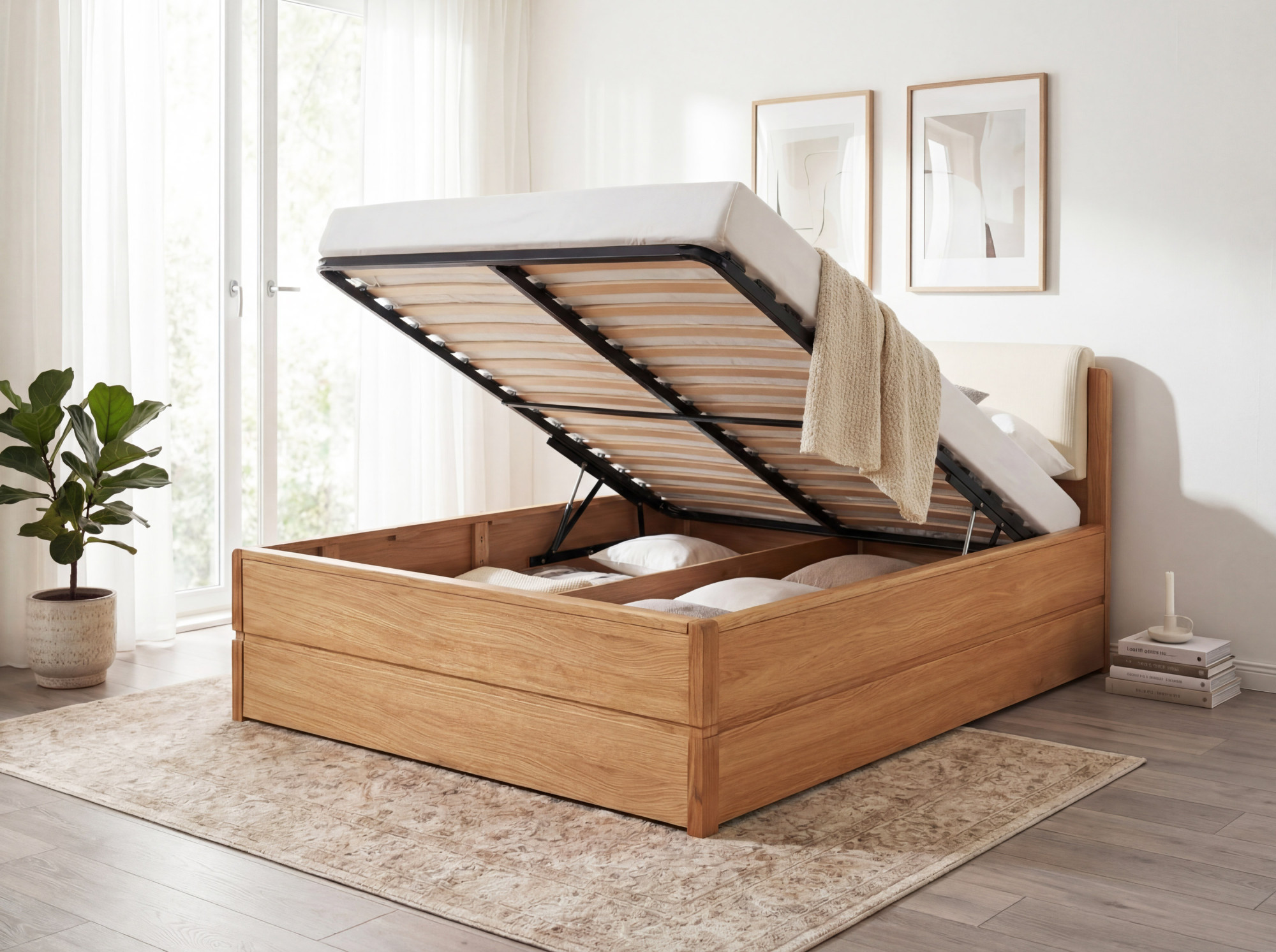 Súčasťou dodávky je kvalitný lamelový rošt s 34 lamelami. Matraca si môžete dokúpiť samostatne podľa vašich preferencií a potrieb. - Ako funguje úložný priestor?