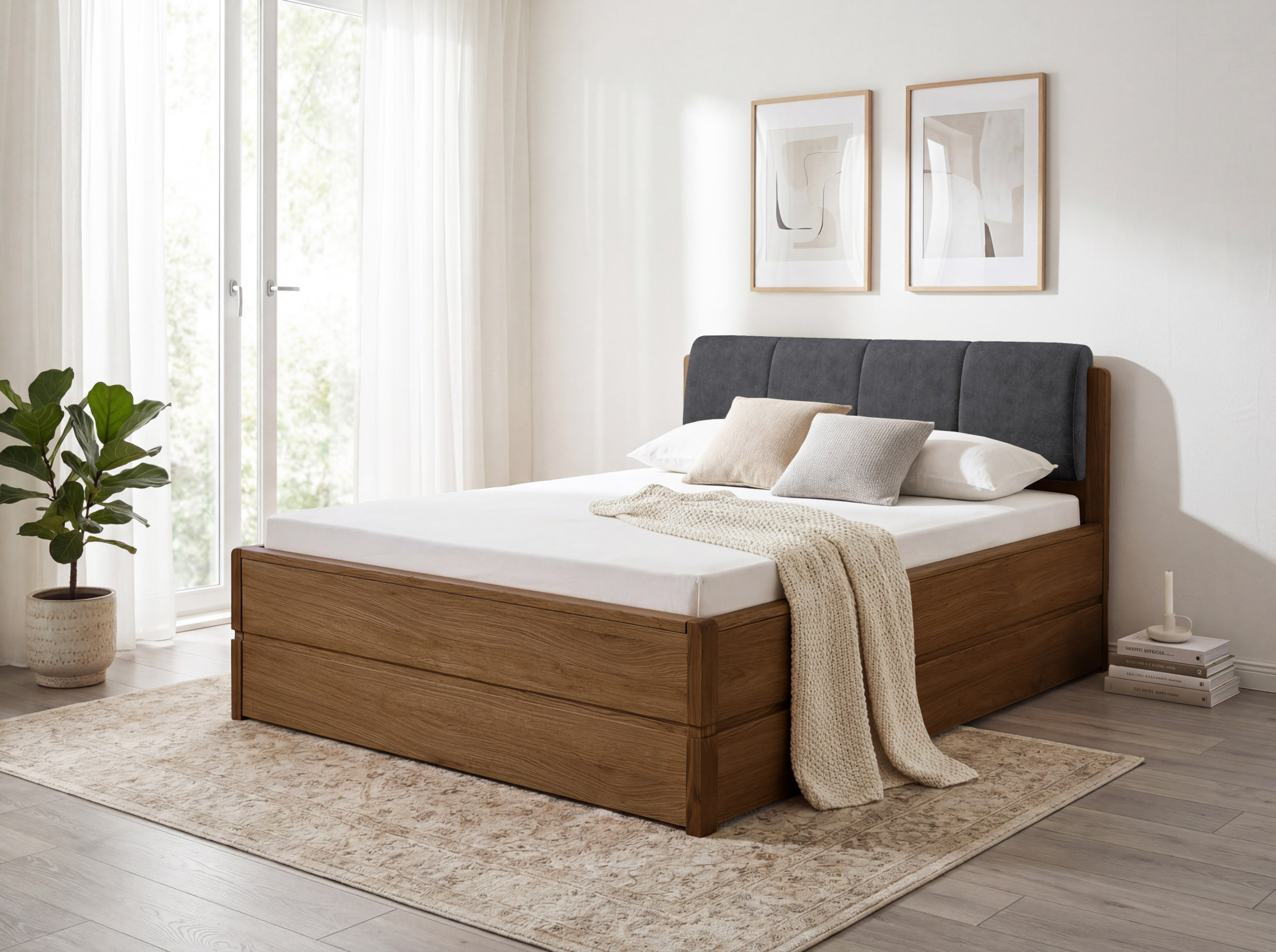 Všetky nosné časti postele – rám, nohy a konštrukčné prvky – sú vyrobené z masívneho dubového dreva, čo zaručuje maximálnu stabilitu a dlhú životnosť. Výplňové časti, ako sú boky a čelá, sú zhotovené z dubovej dyhy, ktorá krásne zvýrazňuje prirodzenú kresbu dreva a zachováva jednotný vzhľad celej postele. Zadné čelo je čalúnené príjemnou látkou, – zjemňuje robustný charakter dubového dreva a poskytuje mäkkú oporu pri čítaní alebo sledovaní televízie. Jemne zaoblené hrany dodávajú posteli nadčasový a harmonický vzhľad. Súčasťou dodávky je kvalitný lamelový rošt s celkom 34 lamelami, takže stačí len dokúpiť matrac a vaša posteľ je kompletná.
