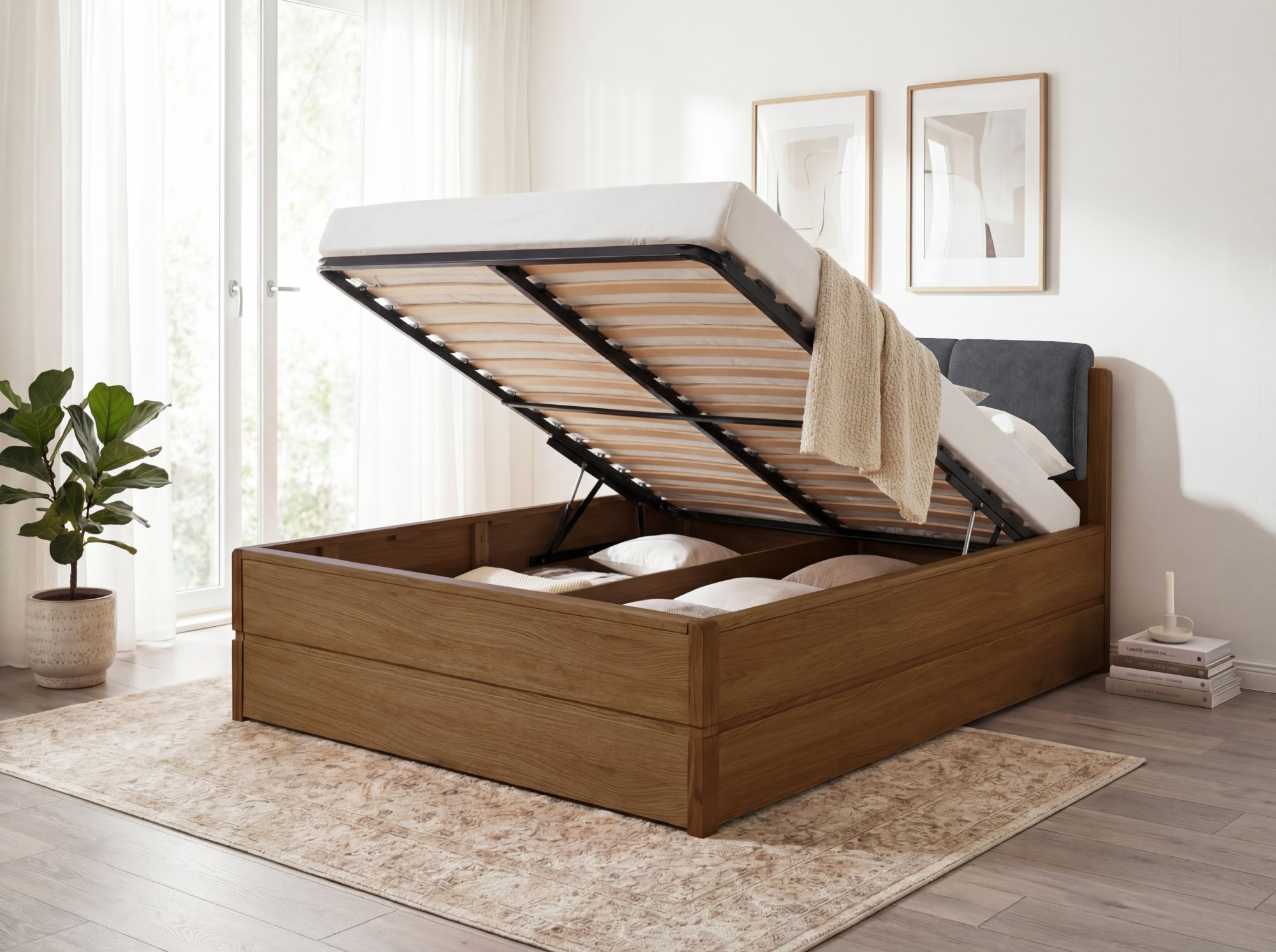 Súčasťou dodávky je kvalitný lamelový rošt s 34 lamelami. Matraci si môžete dokúpiť osobitne podľa vašich preferencií a potrieb. - Ako funguje úložný priestor?