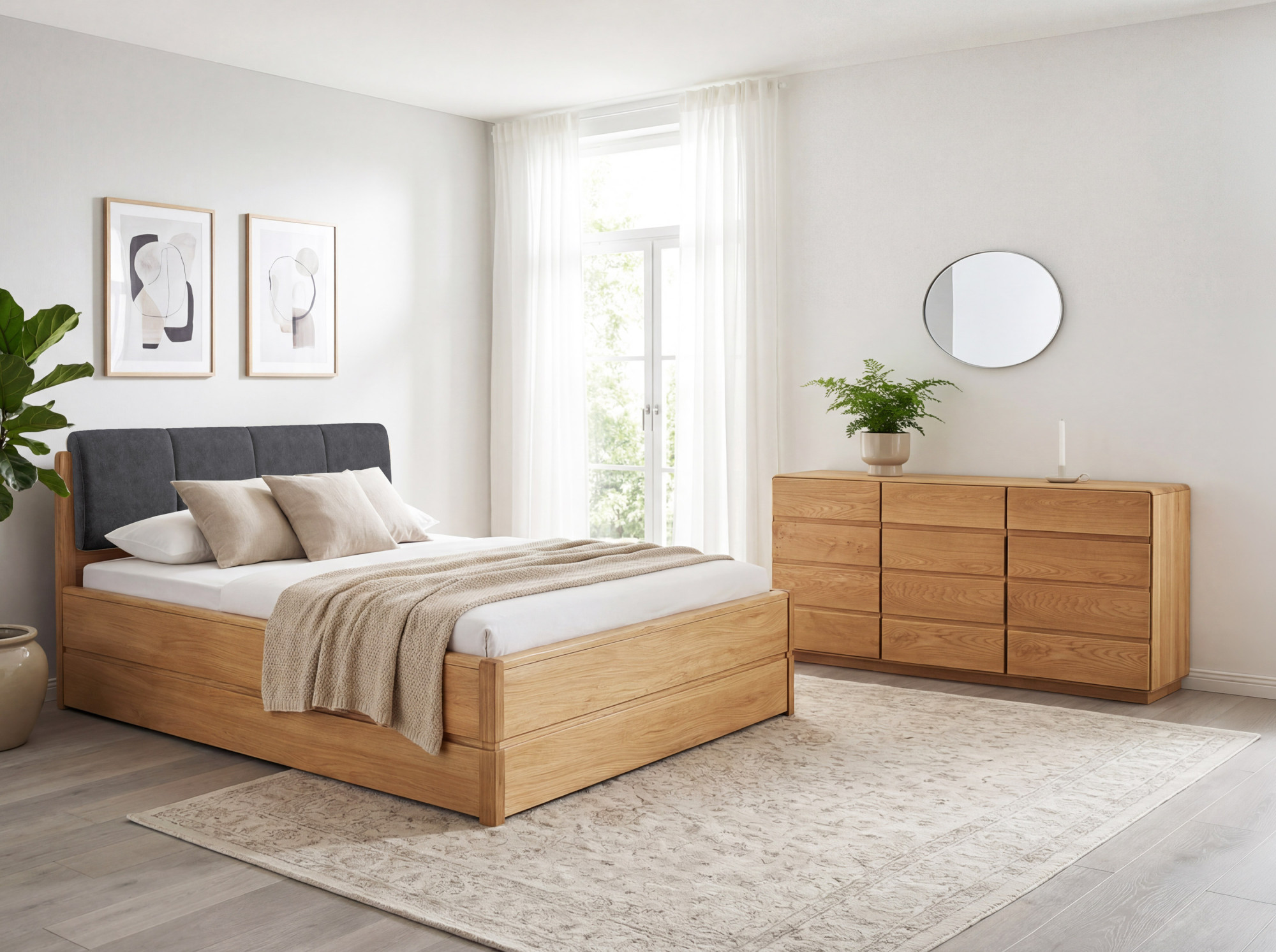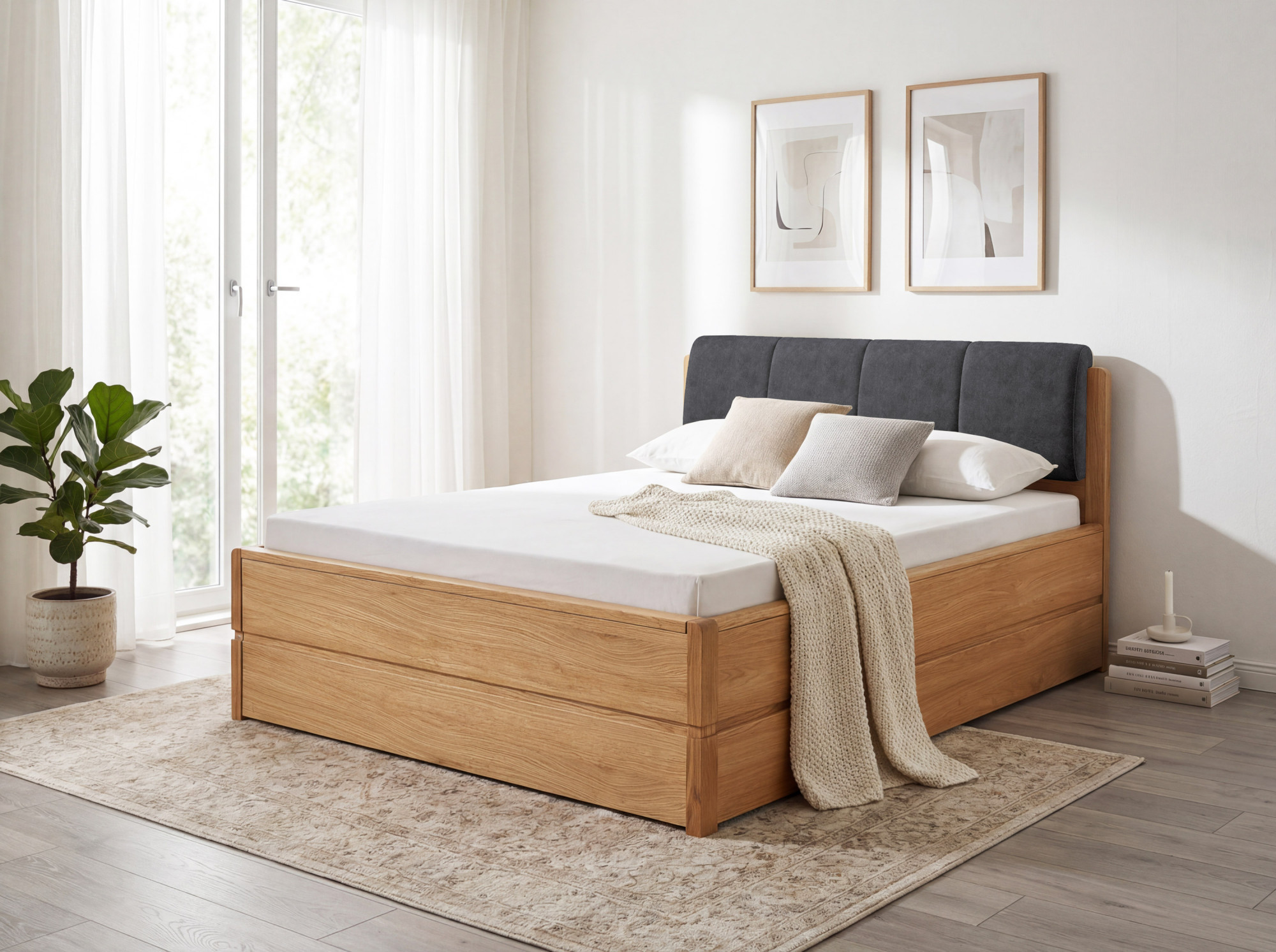 Všetky nosné časti postele – rám, nohy a konštrukčné prvky – sú vyrobené z masívneho dubového dreva, čo zaručuje maximálnu stabilitu a dlhú životnosť. Výplňové časti, ako sú boky a čelá, sú zhotovené z dubovej dyhy, ktorá krásne zvýrazňuje prirodzenú kresbu dreva a zachováva jednotný vzhľad celej postele. Zadné čelo je čalúnené semišovou látkou D'oro 5110 z kolekcie Emotivero – ide o moderný poťahový materiál zo 100 % polyesteru, ktorý je na dotyk extrémne jemný a príjemný. Látka je navyše odolná proti žmolkovaniu a oderu a je šetrná k zvieratám. Jemne zaoblené hrany dodávajú posteli nadčasový a harmonický vzhľad. Súčasťou dodávky je kvalitný lamelový rošt, takže stačí iba dokúpiť matrac a vaša posteľ je kompletná.