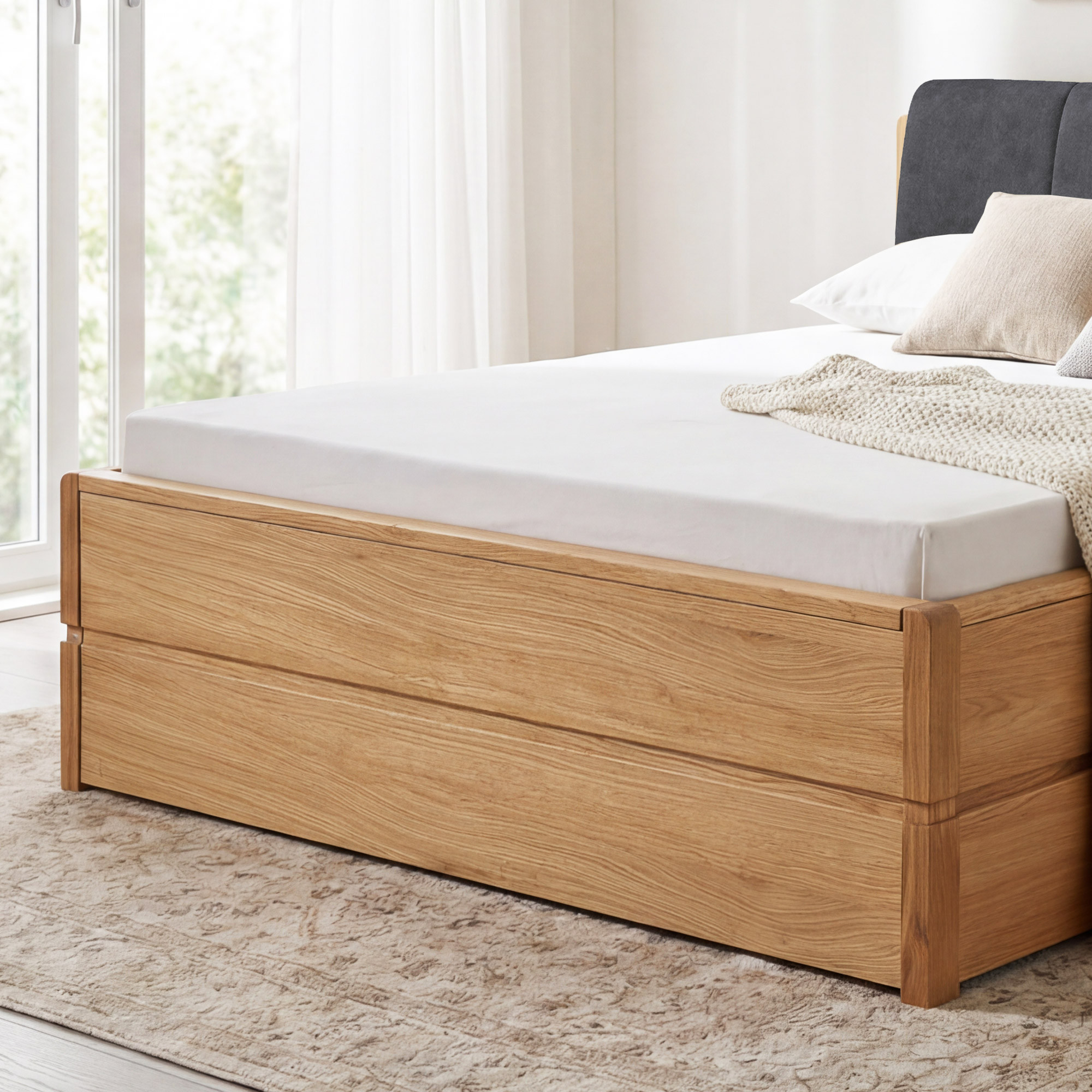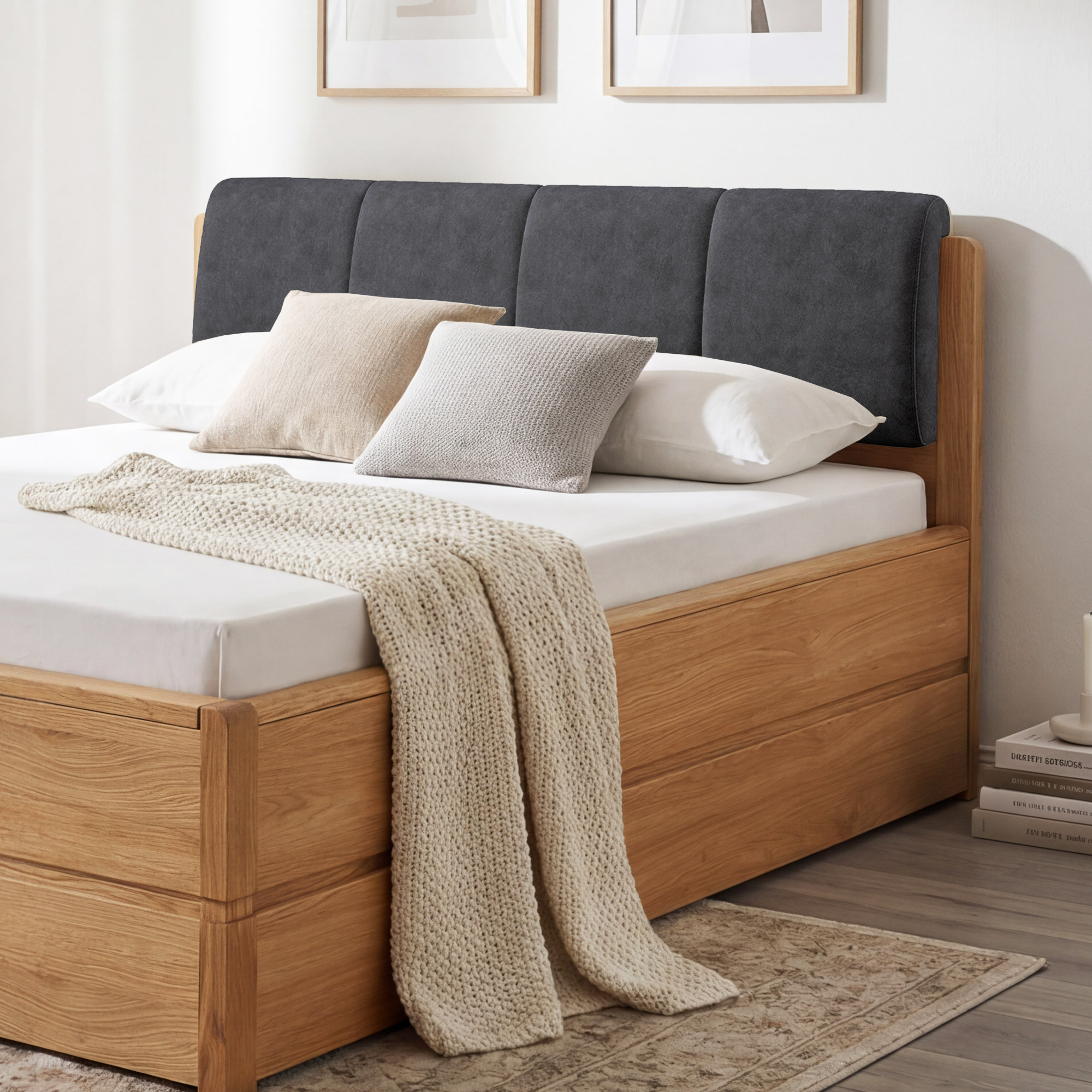 Dopršte si maximálny komfort s dubovou posteľou Helsinki v nadštandardnom rozmere 200 x 200 cm, ktorá spája robustnú kvalitu kartáčovaného dubového dreva s mäkkým látkovým čelom D'oro 5110. Posteľ je vyrobená z kartáčovaného masívu divokého dubu – špeciálnou úpravou povrchu je odstránená mäkšia časť dreva, čím vynikne výrazná prirodzená štruktúra a charakteristické kresba letokruhov. Kartáčované drevo je nielen vizuálne výnimočné, ale aj tvrdšie a odolnejšie voči bežnému opotrebovaniu. Tento veľkorysý rozmer poskytuje dostatok priestoru aj pre tých najnáročnejších spáčov. Pod lôžkovou plochou sa navyše ukrýva priestranný úložný priestor, kam ľahko uložíte posteľnú bielizeň, prikrývky či sezónne oblečenie.