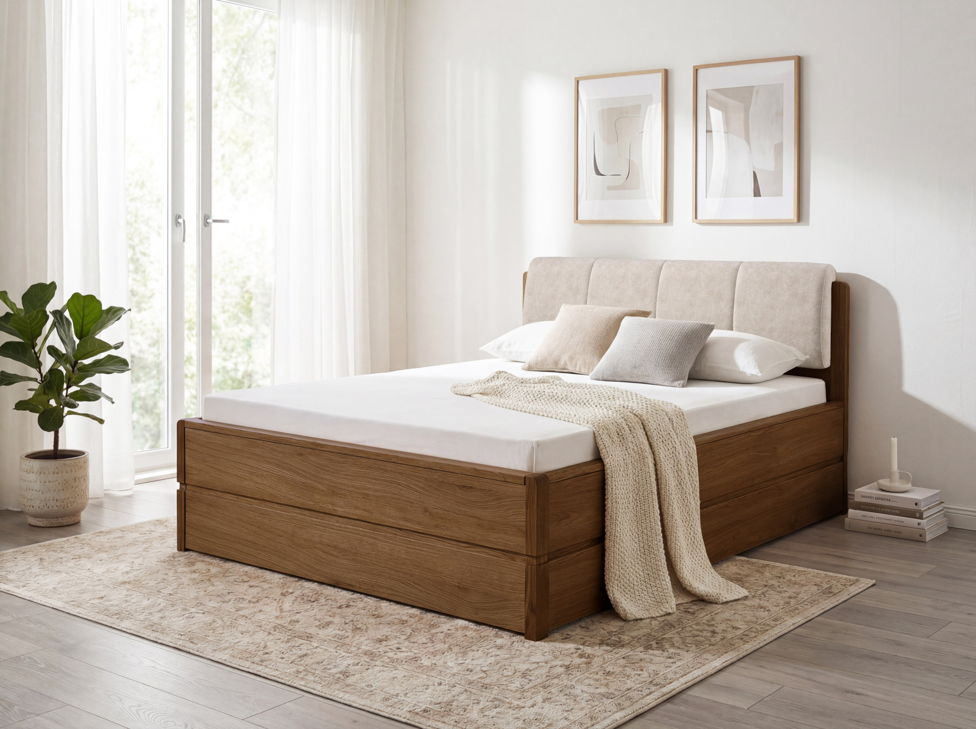 Ide o špeciálne upravené dubové drevo, pri ktorom je pomocou kartáčov odstránená mäkšia časť povrchu. Výsledkom je výrazná prirodzená štruktúra, ktorá je badateľná aj na dotyk. Drevo je vďaka tomu aj tvrdšie a odolnejšie. - Z akých materiálov je posteľ vyrobená?
