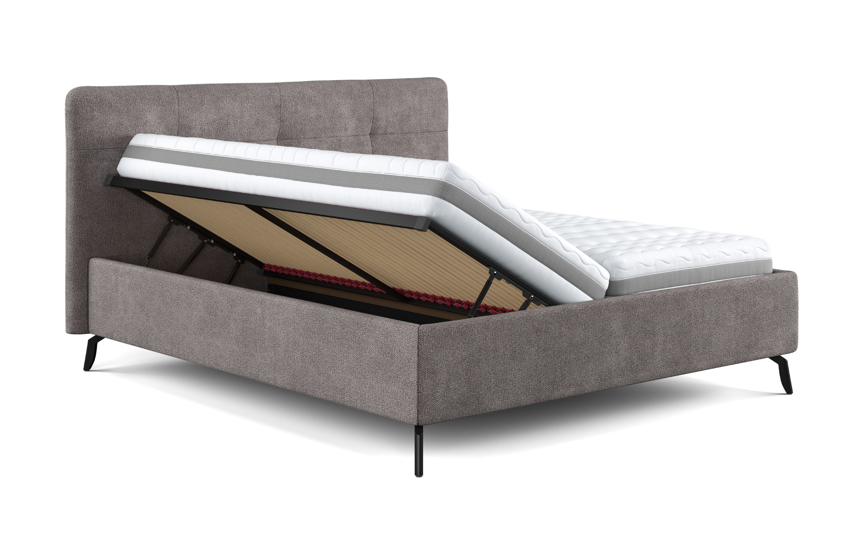Spodný rám postele je pevný a doplnený o čierne kovové nohy, ktoré podčiarkujú moderný charakter nábytku a zabezpečujú vysokú stabilitu. Nosné časti konštrukcie sú vyrobené z masívneho dreva, zatiaľ čo nenosné časti tvoria kvalitná drevotrieska. Veľkou výhodou je praktický úložný priestor s otváraním do strán, ktorý ponúka dostatok miesta na posteľnú bielizeň, vankúše či sezónne oblečenie.