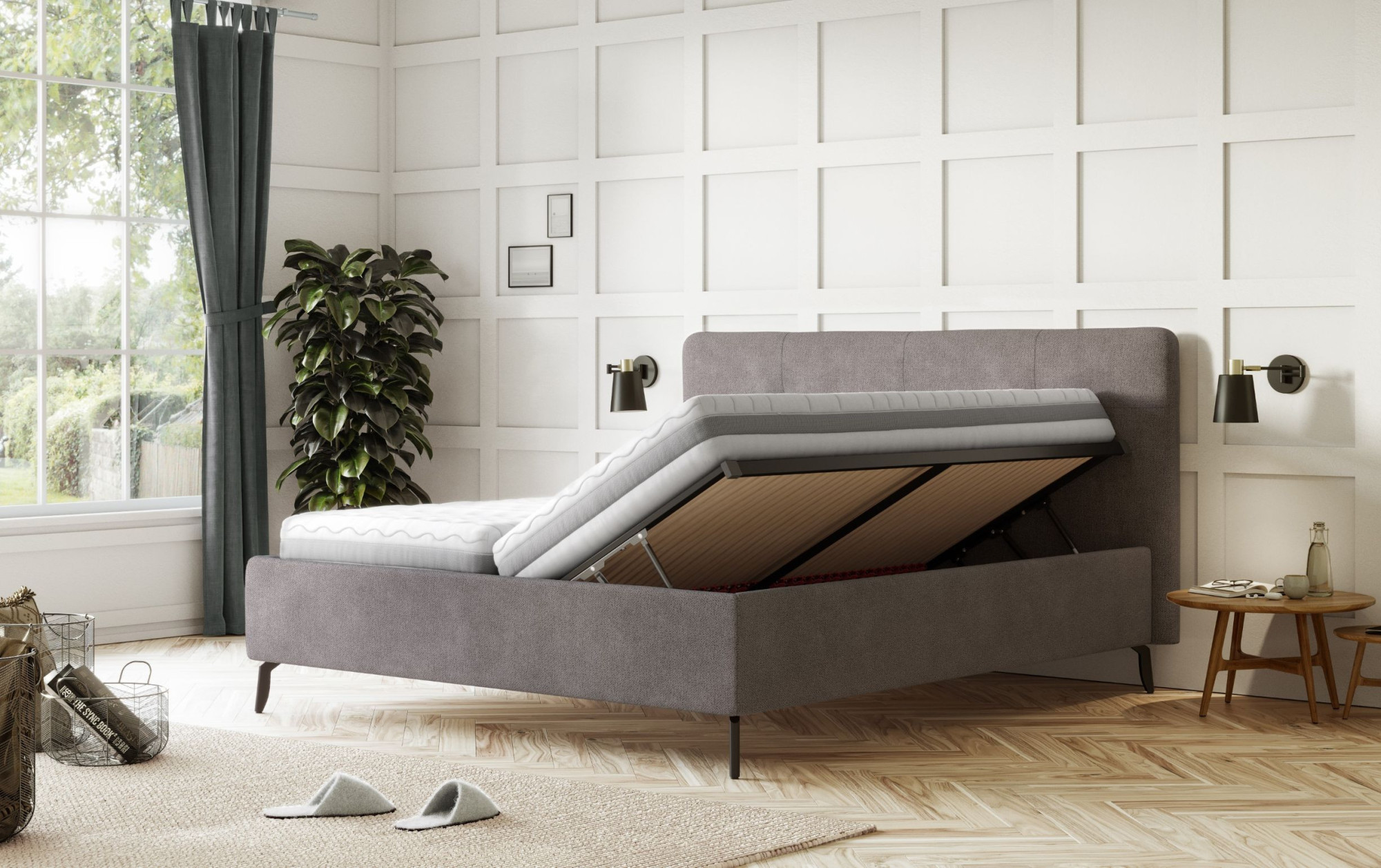 Hľadáte ideálnu manželskú posteľ, ktorá spája elegantný dizajn, prvotriedne pohodlie a šikovne riešený úložný priestor? Potom je táto sivá čalúnená posteľ presne to, čo potrebujete! Pomyslite na spálňu, kde sa prebúdzať svieži a oddýchnutí, a kde má každá vec svoje miesto. Naša posteľ v rozmere 160x200 cm vám tento sen splní.