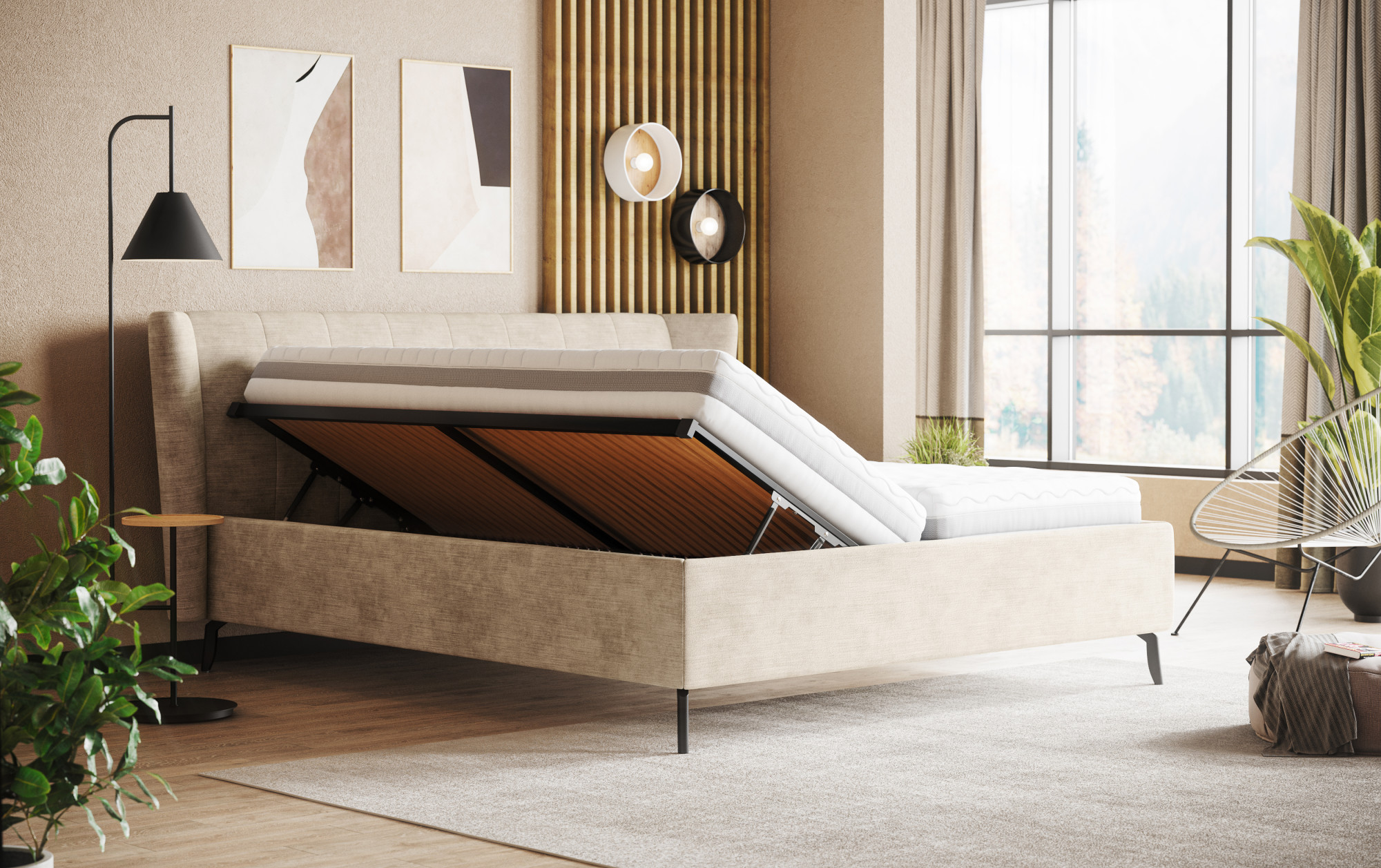Súčasťou postele je pevná konštrukcia z masívneho dreva, 28-lamelový rošt z tvrdého dreva so stredovým pásom a praktický odvetrávaný úložný priestor. Za príplatok je možnosť voľby typov nožičiek (kovové alebo dubové masívne).