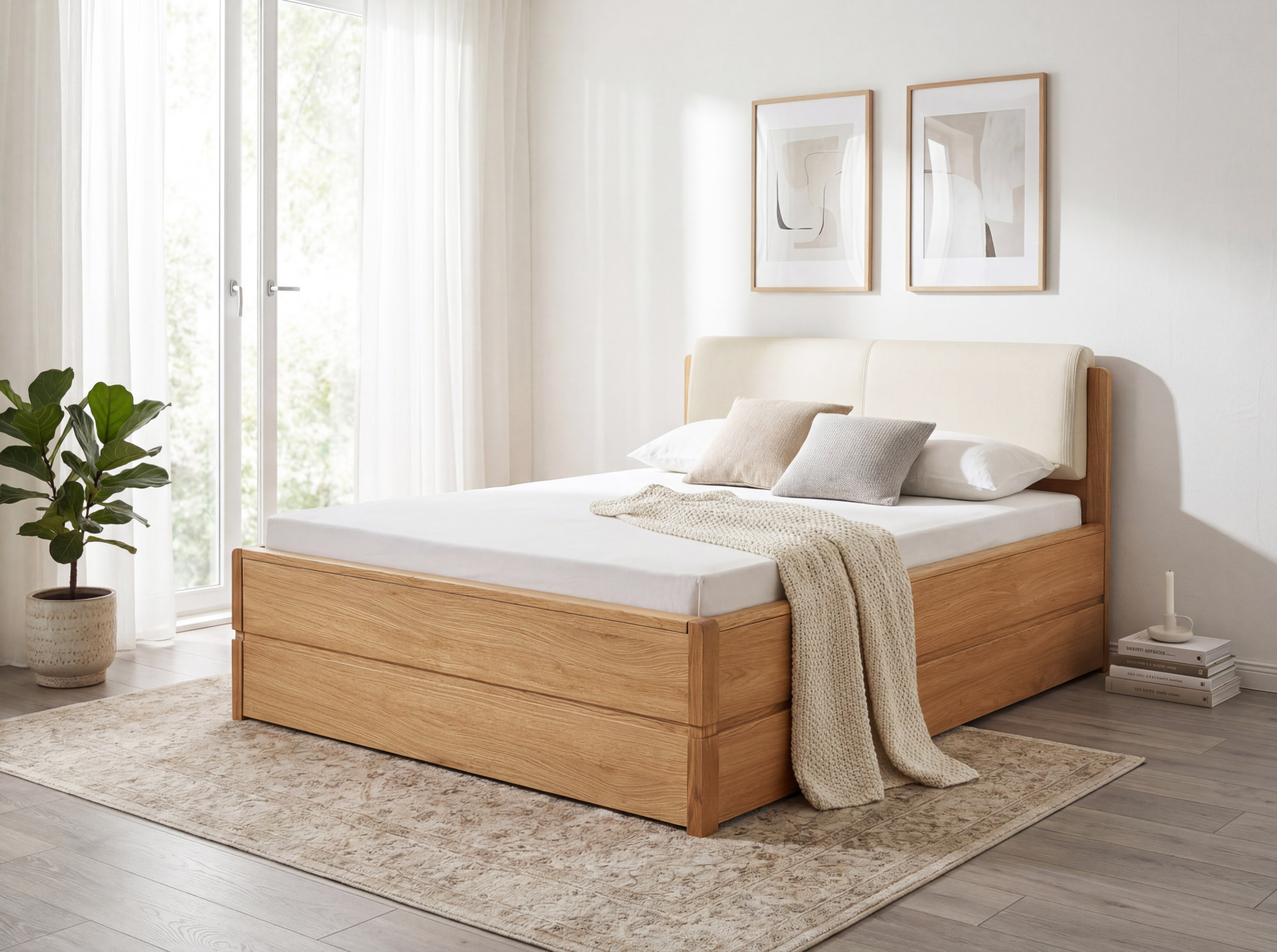 Hľadáte manželskú posteľ z masívneho dubu, ktorá spája elegantný dizajn, prvotriednu kvalitu spracovania a praktický úložný priestor? Dubová posteľ Helsinki v rozmere 180 x 200 cm je presne to, čo vaša spálňa potrebuje. Posteľ je vyrobená z kartáčovaného masívu divokého dubu, ktorého povrch je špeciálne upravený – mäkšia časť dreva je odstránená kartáčovaním, čím vynikne výrazná prirodzená štruktúra a charakteristická kresba letokruhov. Vďaka tomuto procesu je drevo nielen vizuálne atraktívne, ale aj tvrdšie a odolnejšie voči každodennému používaniu. Pod lôžkovou plochou sa ukrýva priestranný úložný priestor, kam pohodlne uložíte posteľnú bielizeň, prikrývky či sezónne oblečenie.