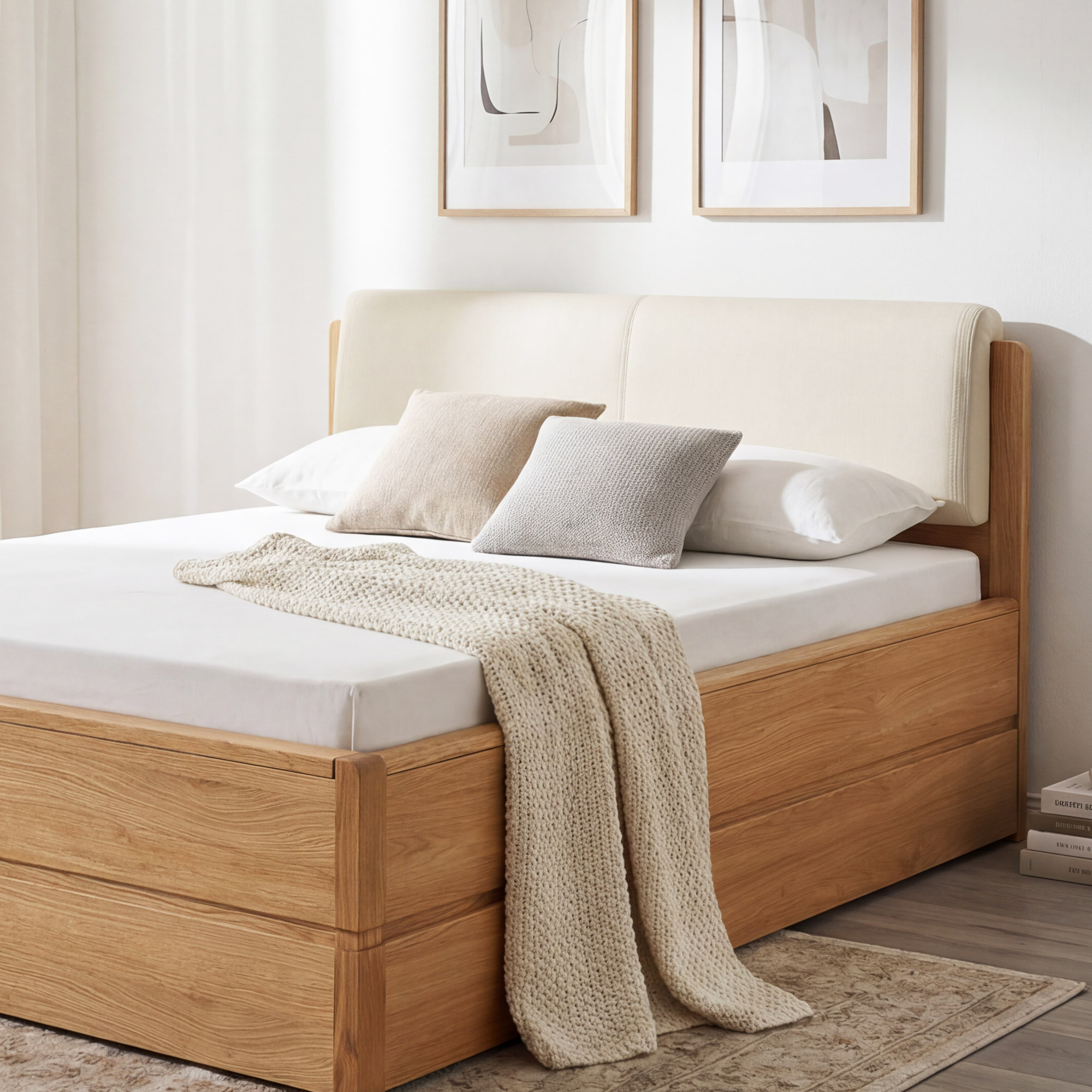 Všetky nosné časti postele – rám, nohy a konštrukčné prvky – sú vyrobené z masívneho dubového dreva, čo zaručuje maximálnu stabilitu a dlhú životnosť. Výplňové časti, ako sú boky a čelá, sú zhotovené z dubovej dyhy, ktorá krásne zvýrazňuje prirodzenú kresbu dreva a zachováva jednotný vzhľad celej postele. Zadné čelo je navyše čalúnené príjemnou ekokožou, ktorá zjemňuje robustný charakter dubového dreva a poskytuje mäkkú oporu pri čítaní alebo sledovaní televízie. Jemne zaoblené hrany dodávajú posteli nadčasový a harmonický vzhľad. Súčasťou dodávky je kvalitný lamelový rošt s celkovo 34 lamelami, takže stačí len dokúpiť matrac a vaša posteľ je kompletná.