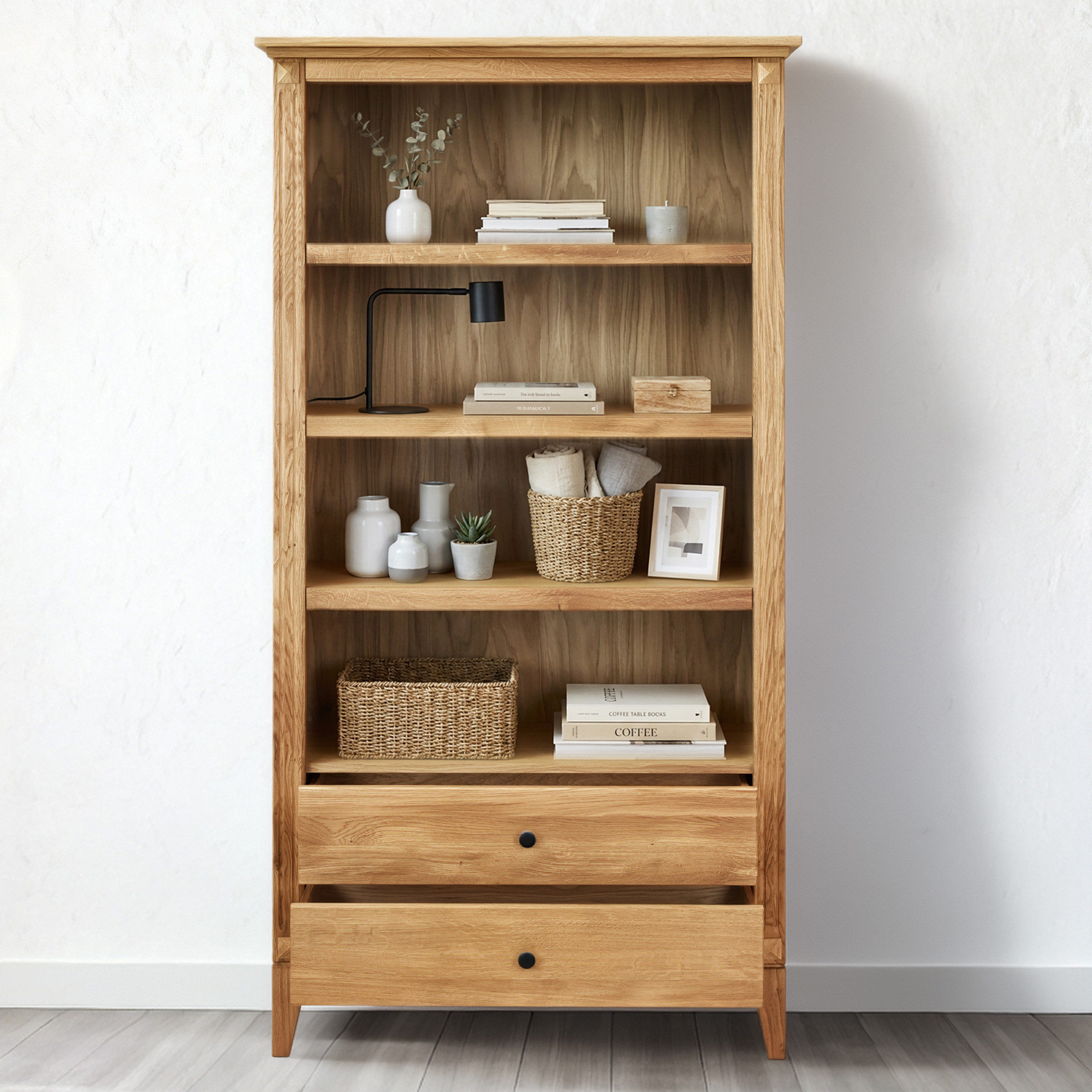 Regál z masívneho dubu je dokonalým spojením estetiky a funkčnosti – otvorené police umožňujú efektné vystavenie vašich kníh, fotografií a dekorácií, zatiaľ čo zásuvky skryjú všetko, čo nepotrebujete mať na očiach. Kolekcia Gaja prináša nadčasový severský dizajn a prvotriedne spracovanie, ktoré vydrží generácie. Naša spoločnosť pôsobí na trhu od roku 1993 a ročne obslúžime viac než 50 000 spokojných zákazníkov po celej EÚ. Disponujeme vlastnou prepravou – nábytok nakladáme v našom sklade a vykladáme priamo u vás doma. Bežne doručujeme do SK, CZ, HU, AT a PL, za príplatok zabezpečíme aj vynášku do poschodia. Zaobstarajte si regál, ktorý skrášli váš domov – objednajte ešte dnes!