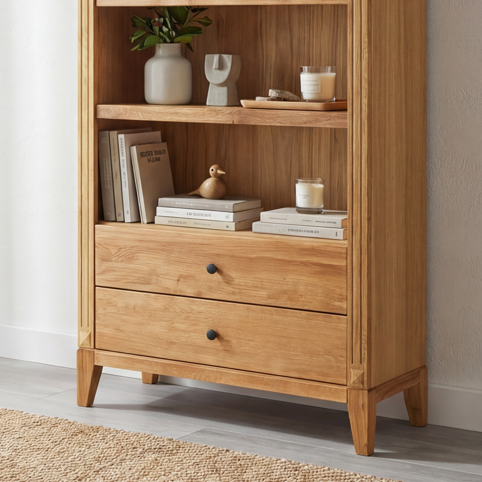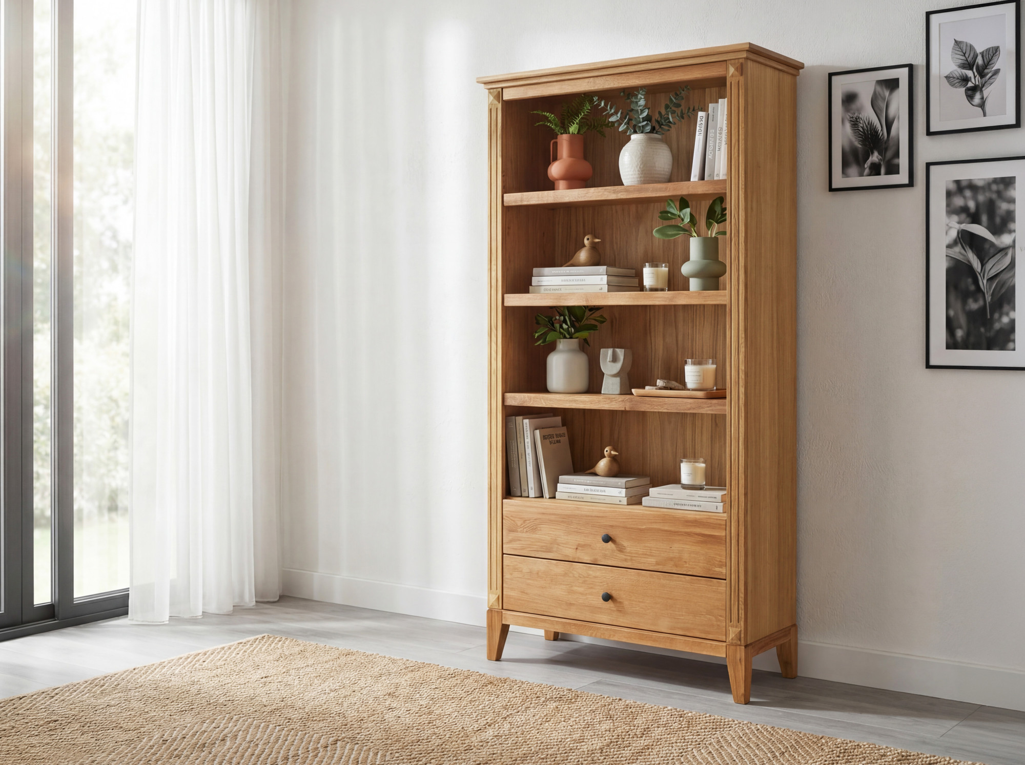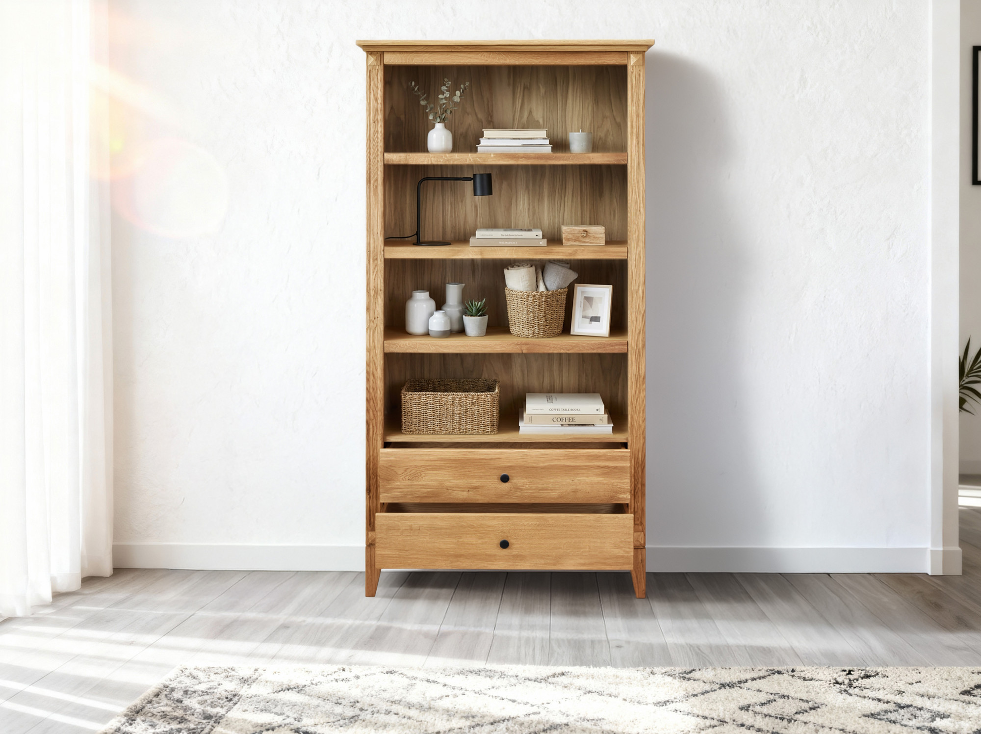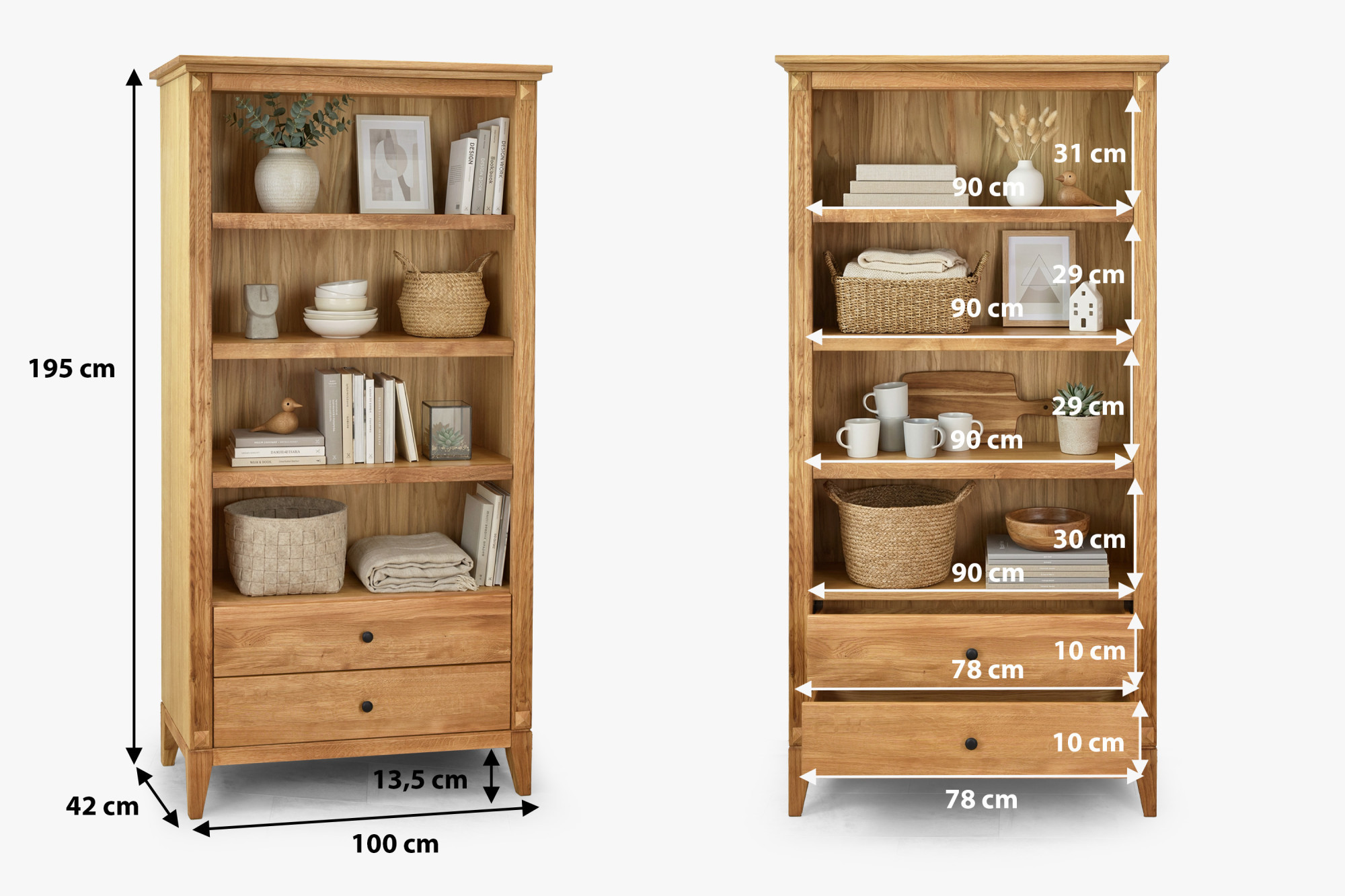 Hľadáte priestranný dubový regál, ktorý spája otvorený úložný priestor s praktickými zásuvkami? Regál z kolekcie Gaja je ideálnou voľbou pre všetkých milovníkov prírodného dreva a škandinávskeho dizajnu. Tento regál z masívneho dubu v rustikálnom severskom štýle ponúka 3 pevné police na vystavenie kníh, dekorácií či rastlín a 2 zásuvky v spodnej časti na uloženie vecí, ktoré chcete mať skryté. S impozantnými rozmermi 100 × 195 × 42 cm sa drevený regál stane dominantou vášho obývacieho izby, pracovného priestoru či spálne a ponúkne dostatok miesta pre všetky vaše obľúbené predmety.