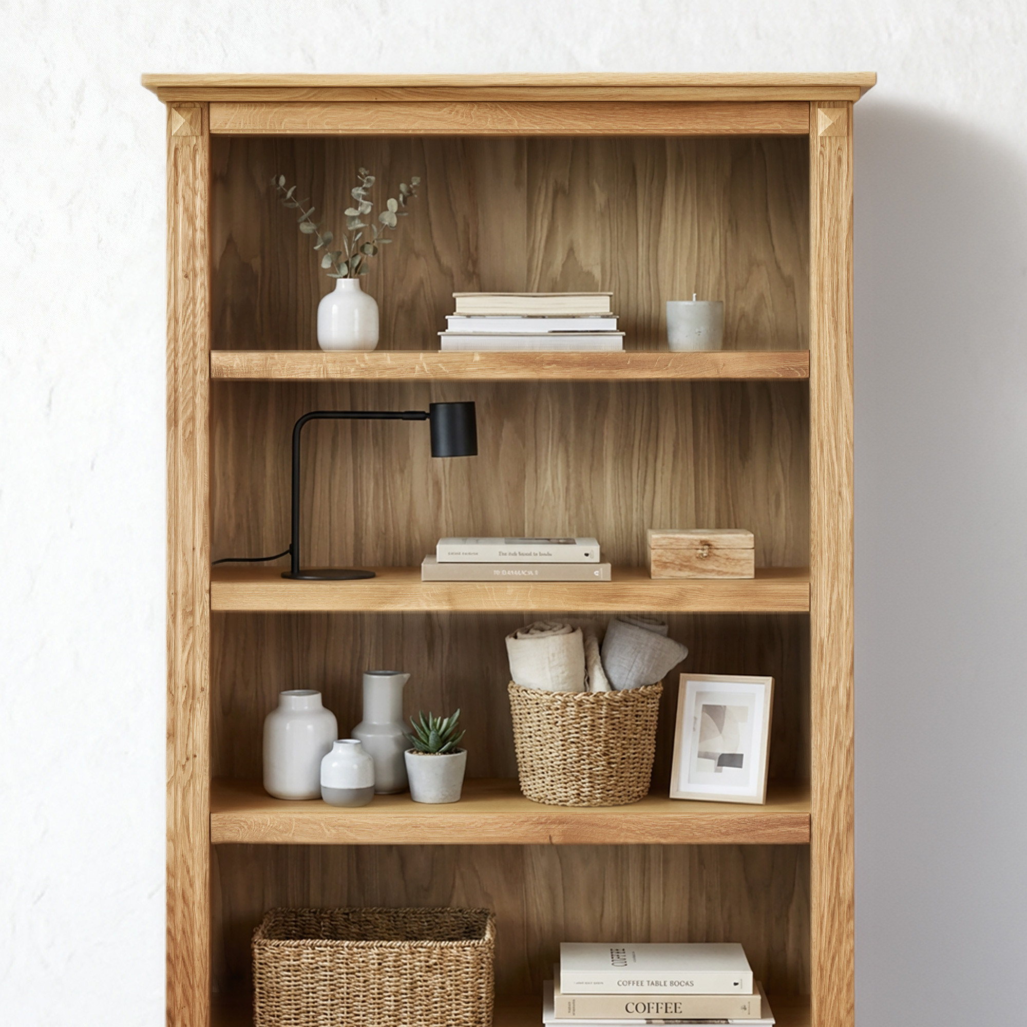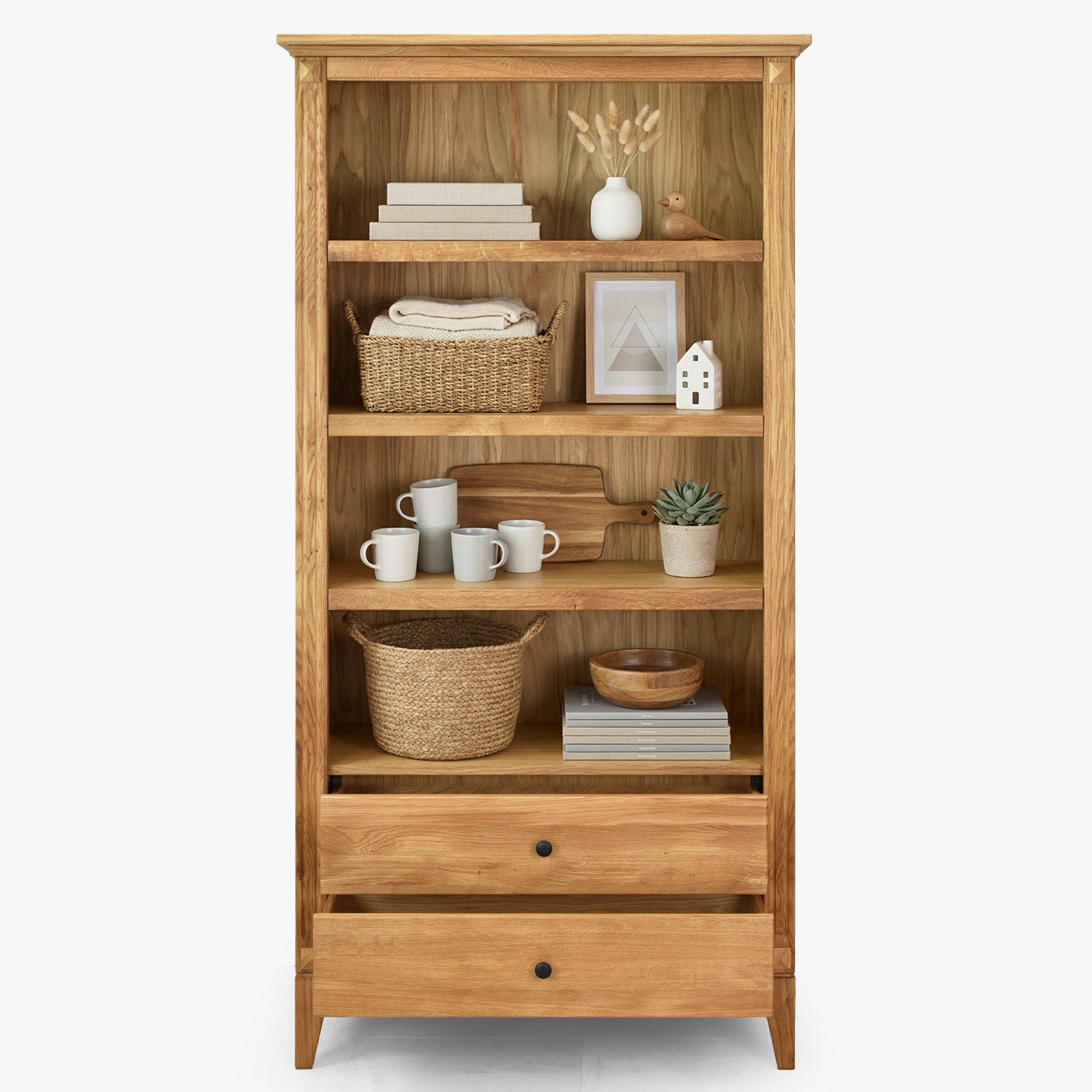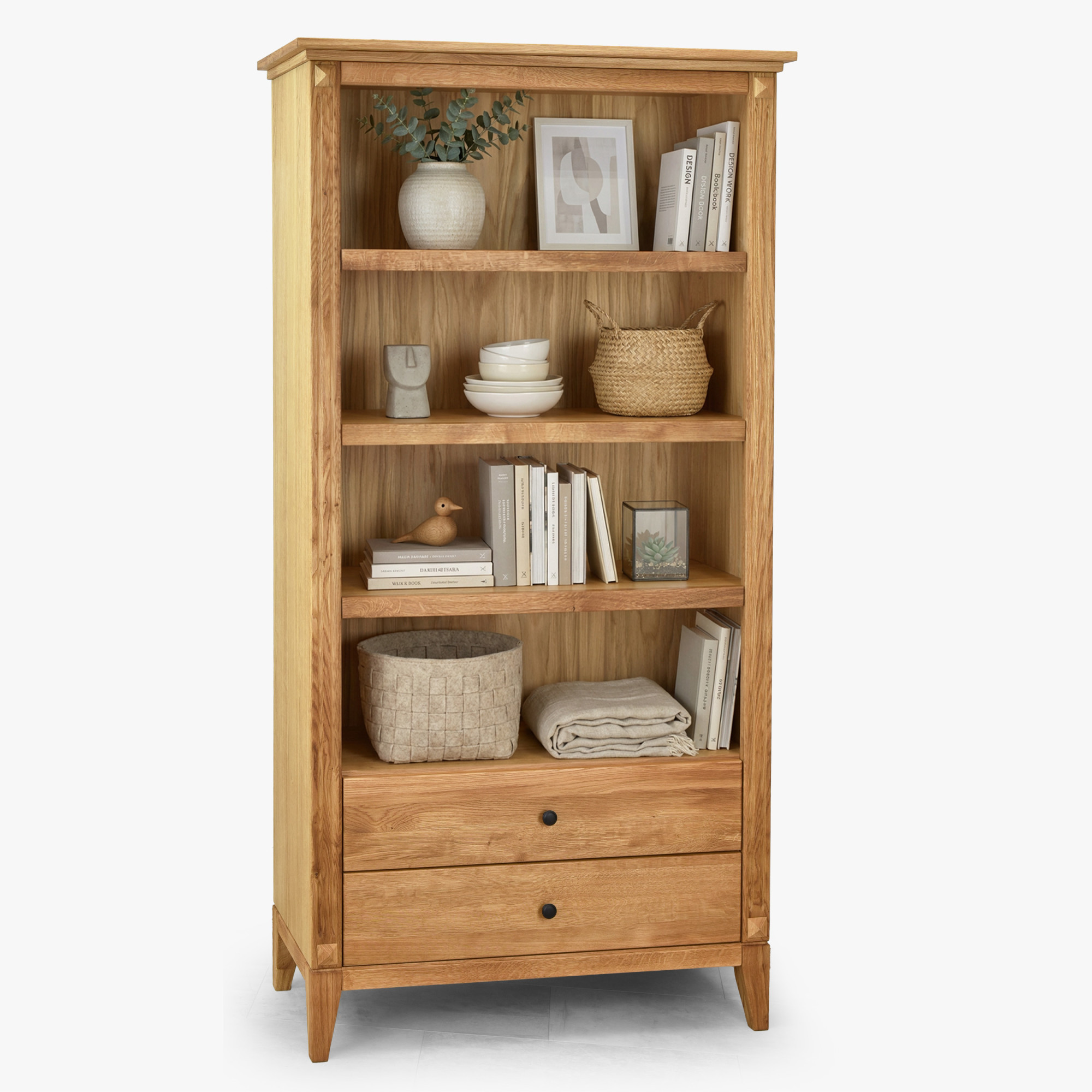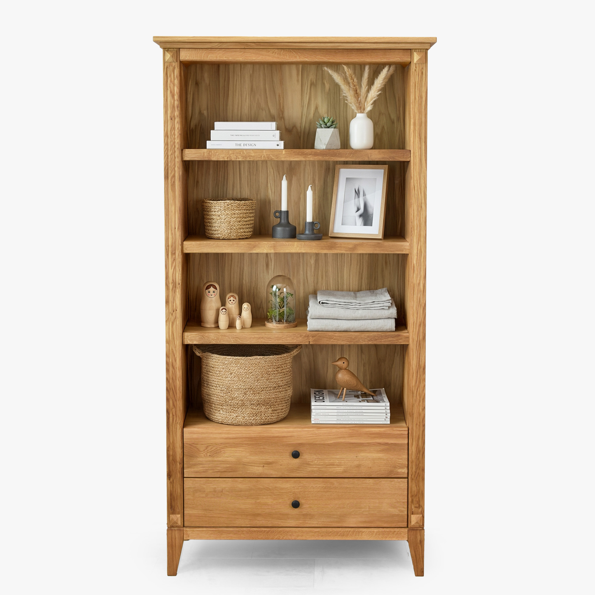Police a vrchná doska sú vyrobené z masívneho dubového dreva, zatiaľ čo boky a korpus tvoria kvalitná dubová dyha. Povrch je dôkladne ošetrený dánskym olejom Livos, ktorý chráni drevo a zvýrazňuje jeho prirodzenú kresbu. Zásuvky sú vybavené soft-close mechanizmom pre tiché a plynulé zatváranie. Minimalistické kovové úchytky v čiernej farbe dodávajú regálu moderný akcent. Charakteristické jemné frézovanie po bokoch čelnej strany podčiarkuje rustikálny charakter v čistých líniách severského dizajnu. Knihovna z dubu stojí na elegantných dubových nožičkách, je dodávaná kompletne zmontovaná a krásne ladí s ďalšími kúskami z kolekcie Gaja.