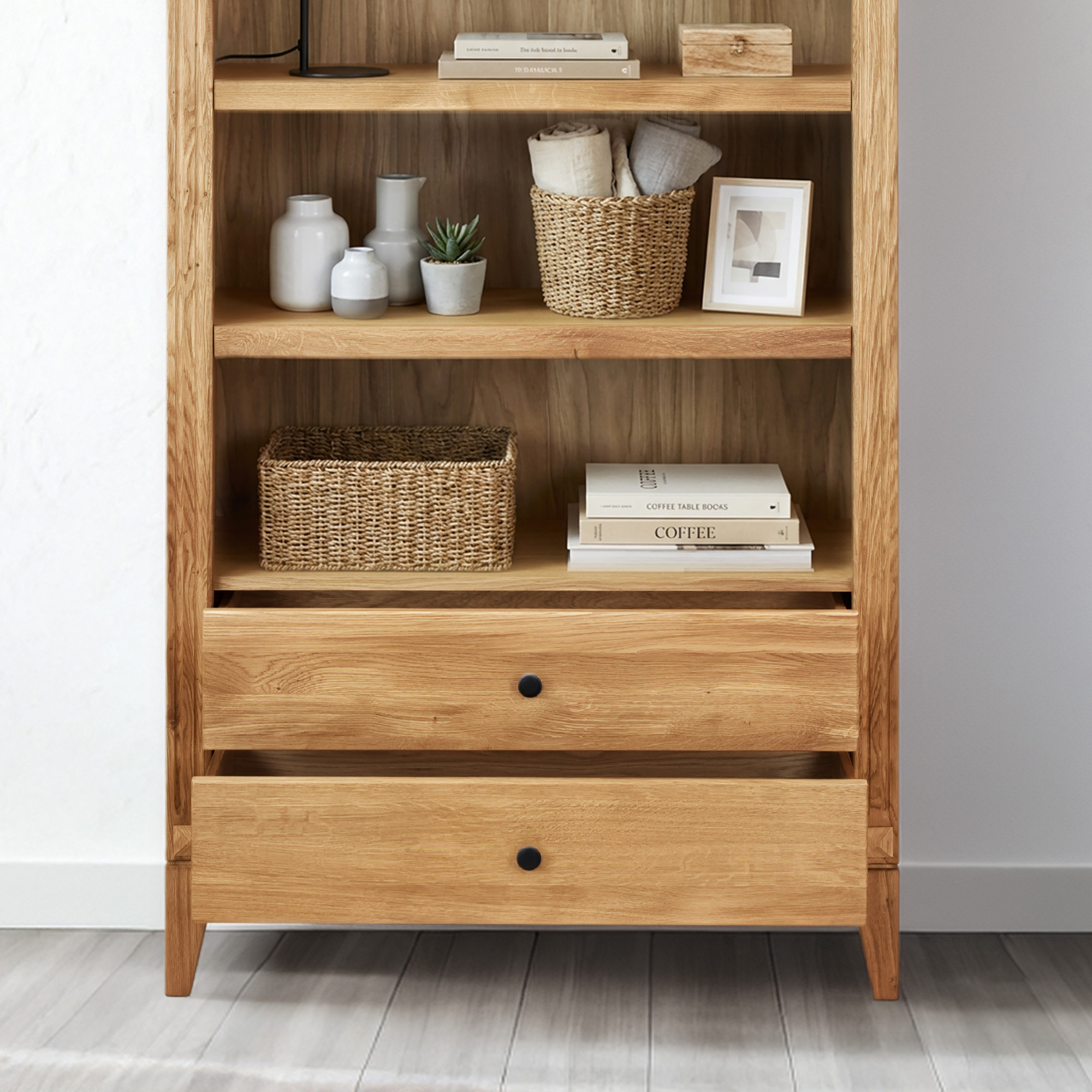 Dubový regál Gaja 100 cm – regál s policami a zásuvkami z masívneho dubu v severskom štýle