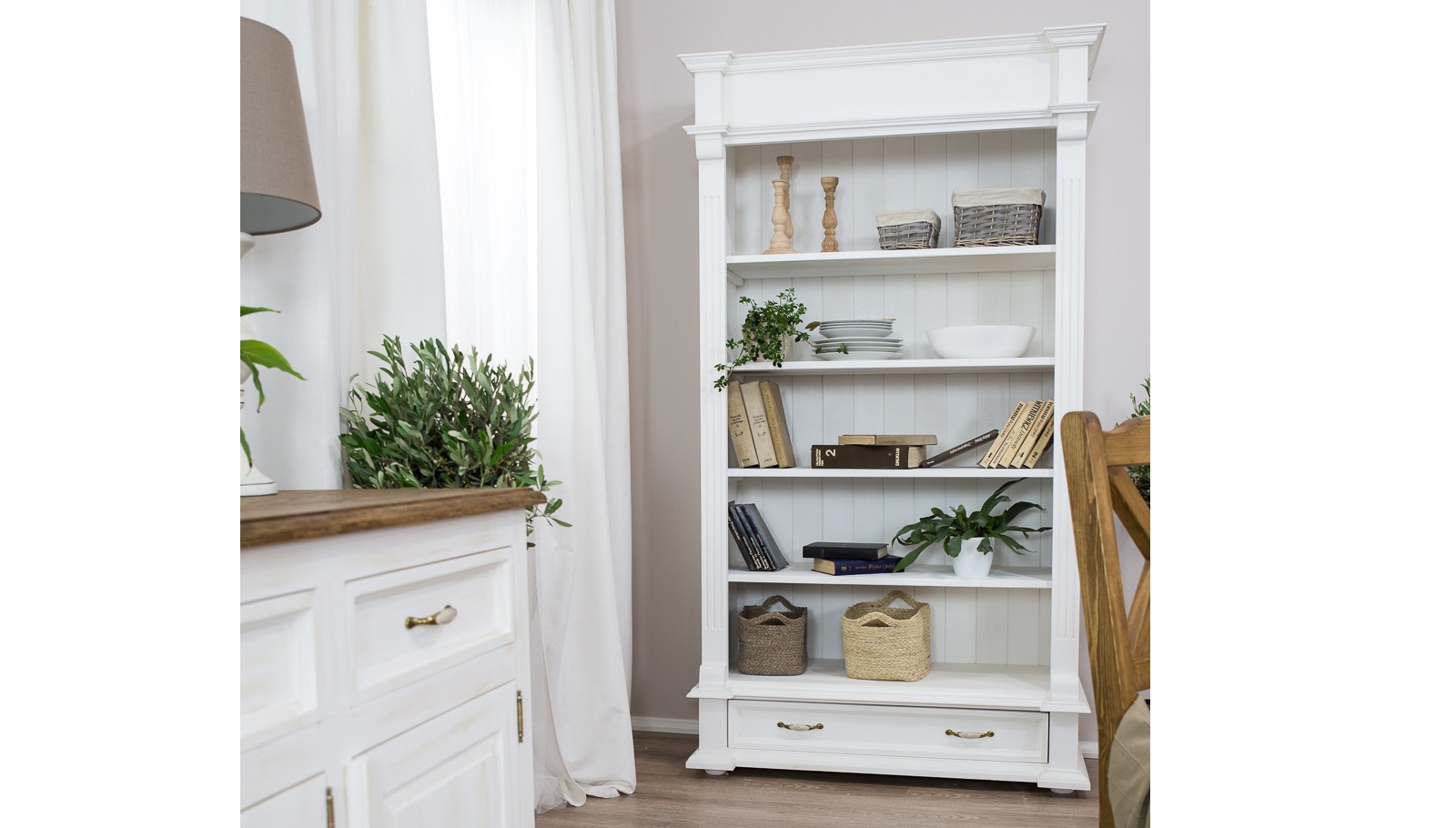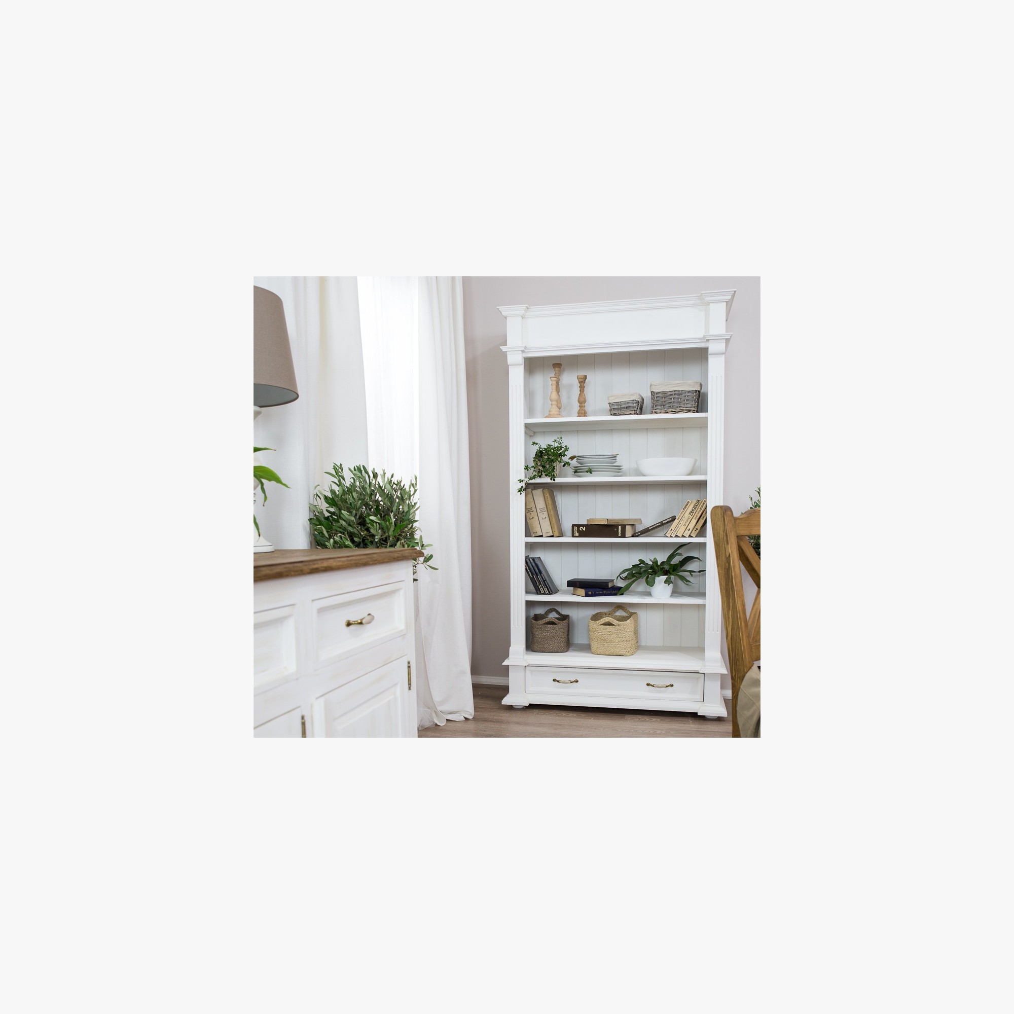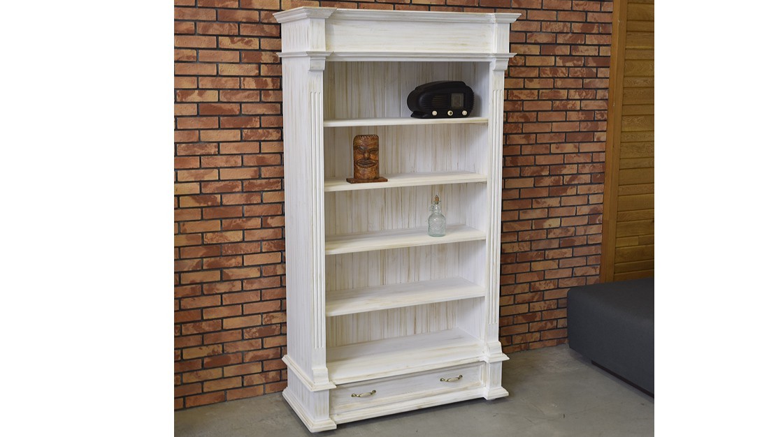 Knižnica rozžiari každý interiér svojím očarujúcim dizajnom! Každý kus má úplne originálny vzhľad, s každým kúskom si do interiéru zaobstaráte unikátny nábytok, ktorý vám vďaka svojim kvalitám vydrží slúžiť dlhú radu rokov! Zadná stena knižnice je drevená a má jedinečný vzhľad. Prémiové prevedenie s profilovanými lištami a tvarovaným čelom zásuvky dokonale imitujú štýl vidieckeho francúzskeho bývania! Regál Provence ponúkame hneď v dvoch farebných prevedeniach. Biela varianta využíva bielu ekologickú farbu. Prevedenie „patina“ využíva vosk, ktorý sa nanáša na biely základ. Toto prevedenie je obľúbené pre svoj starobylý vzhľad zrelej dreviny. Toto prevedenie je oproti bielej variante o 10 % drahšie.
