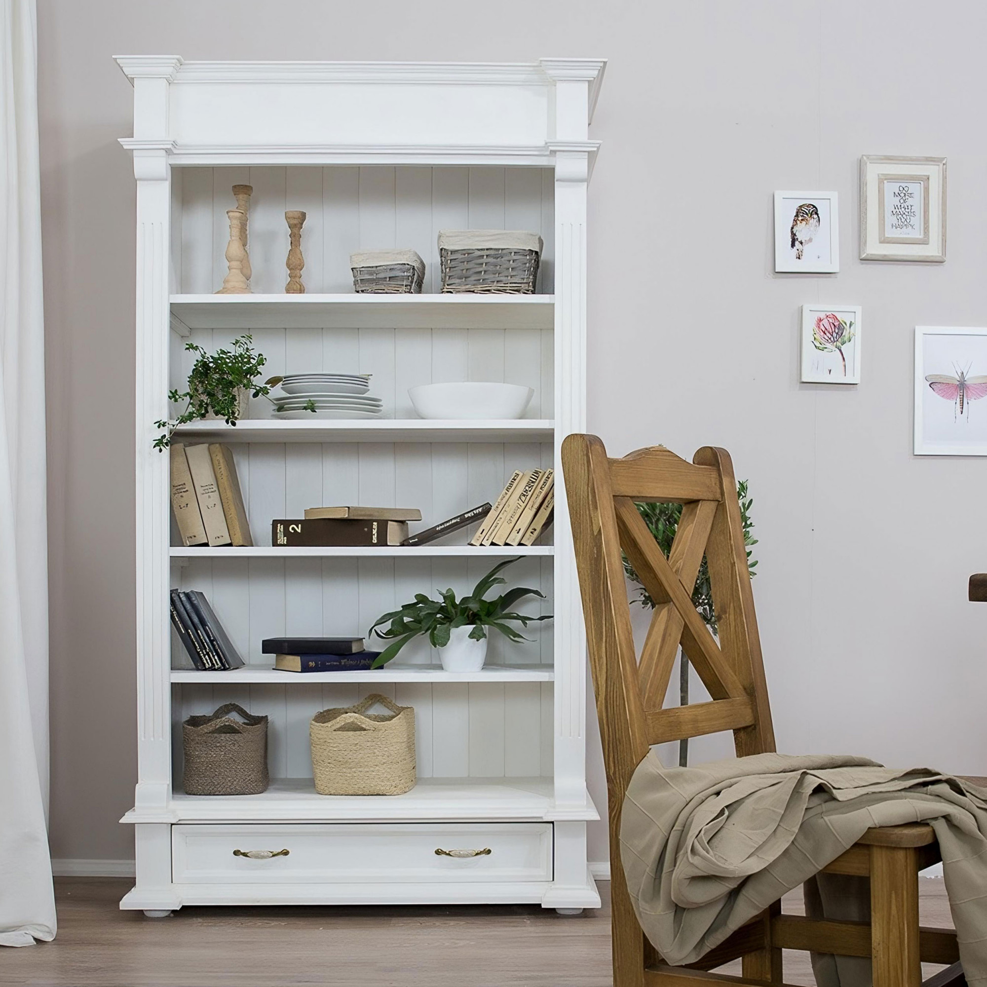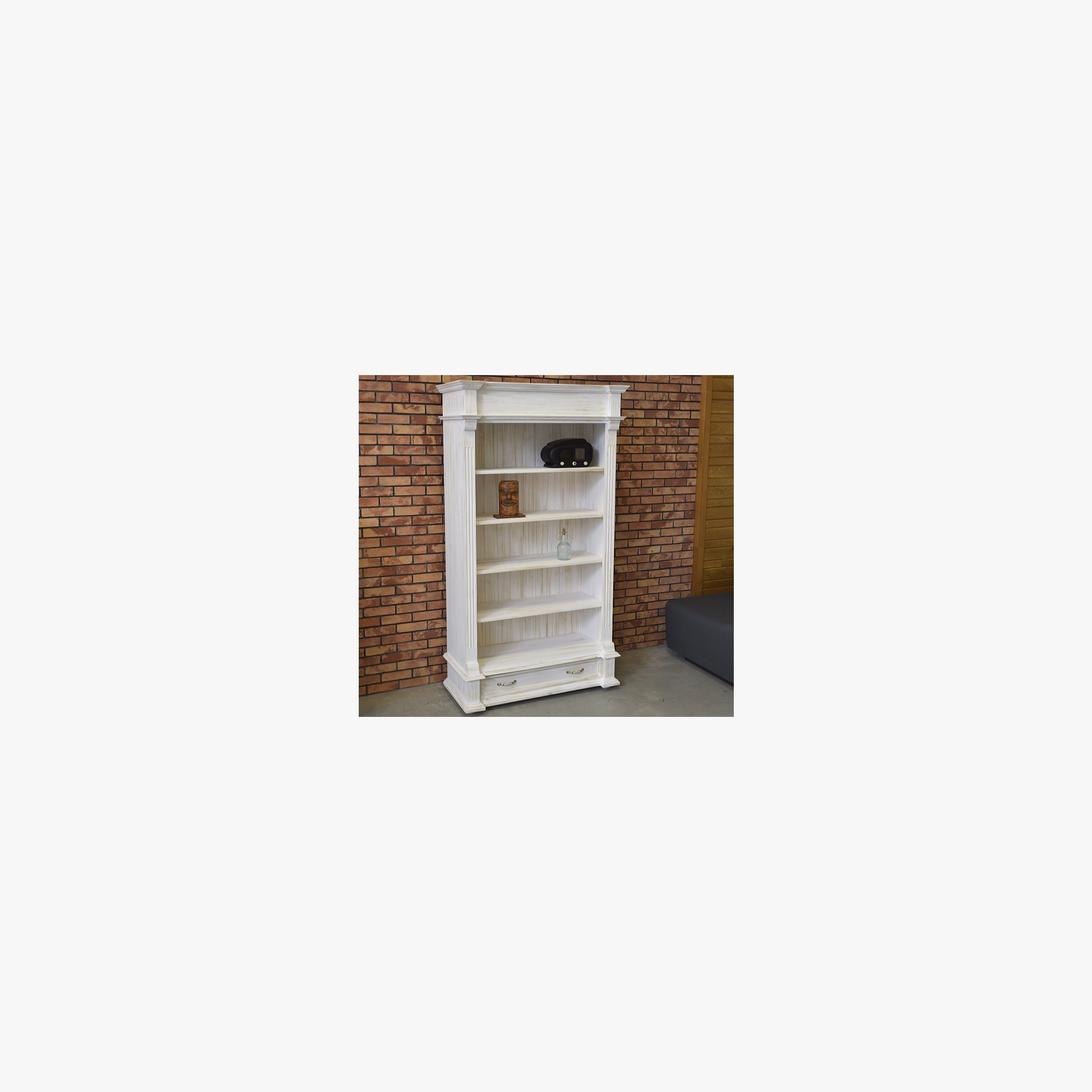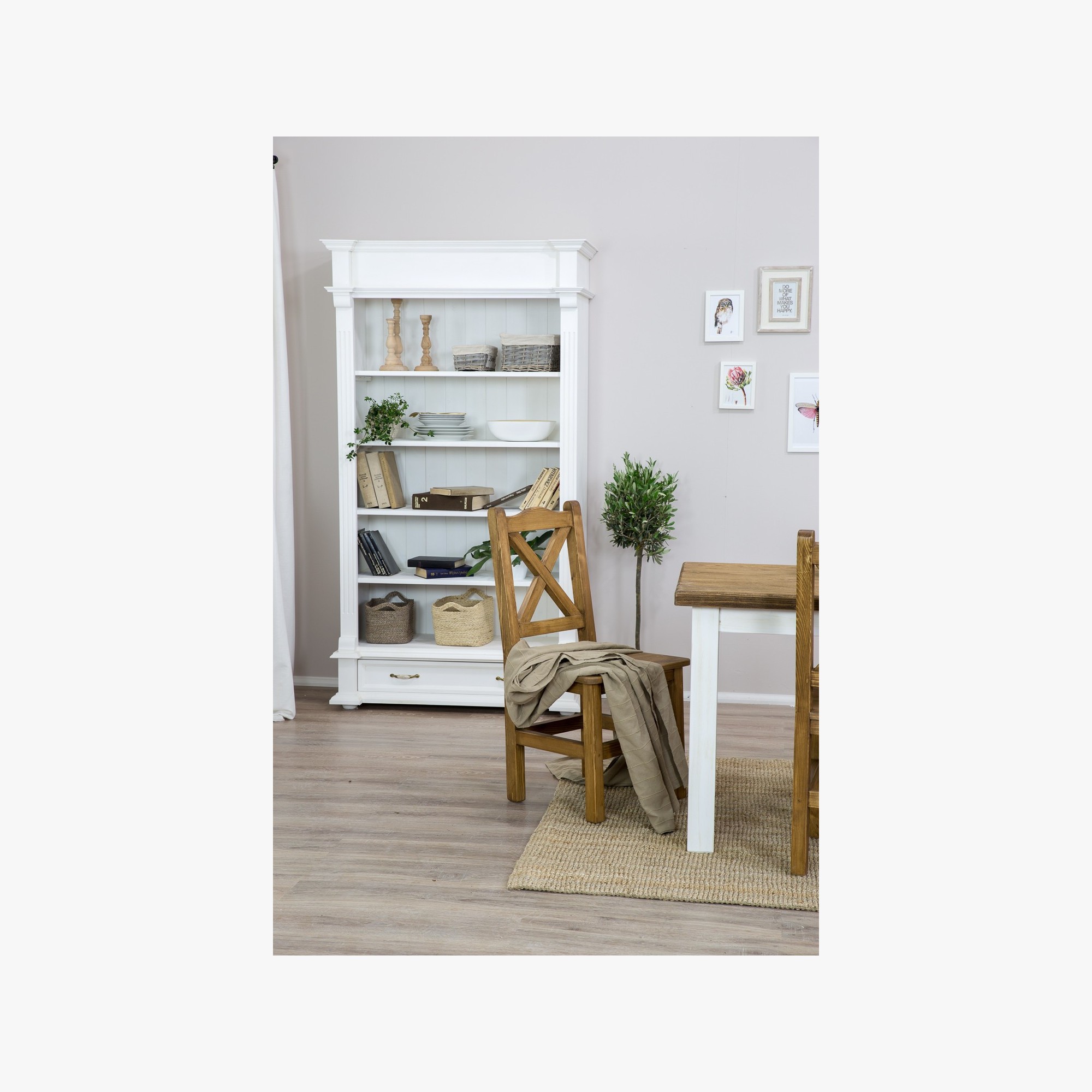 Knižnica rozžiari každý interiér svojím očarujúcim dizajnom! Každý kus má úplne originálny vzhľad, s každým kúskom si do interiéru zaobstaráte unikátny nábytok, ktorý vám vďaka svojim kvalitám vydrží slúžiť dlhú radu rokov! Zadná stena knižnice je drevená a má jedinečný vzhľad. Prémiové prevedenie s profilovanými lištami a tvarovaným čelom zásuvky dokonale imitujú štýl vidieckeho francúzskeho bývania! Regál Provence ponúkame hneď v dvoch farebných prevedeniach. Biela varianta využíva bielu ekologickú farbu. Prevedenie „patina“ využíva vosk, ktorý sa nanáša na biely základ. Toto prevedenie je obľúbené pre svoj starobylý vzhľad zrelej dreviny. Toto prevedenie je oproti bielej variante o 10 % drahšie.