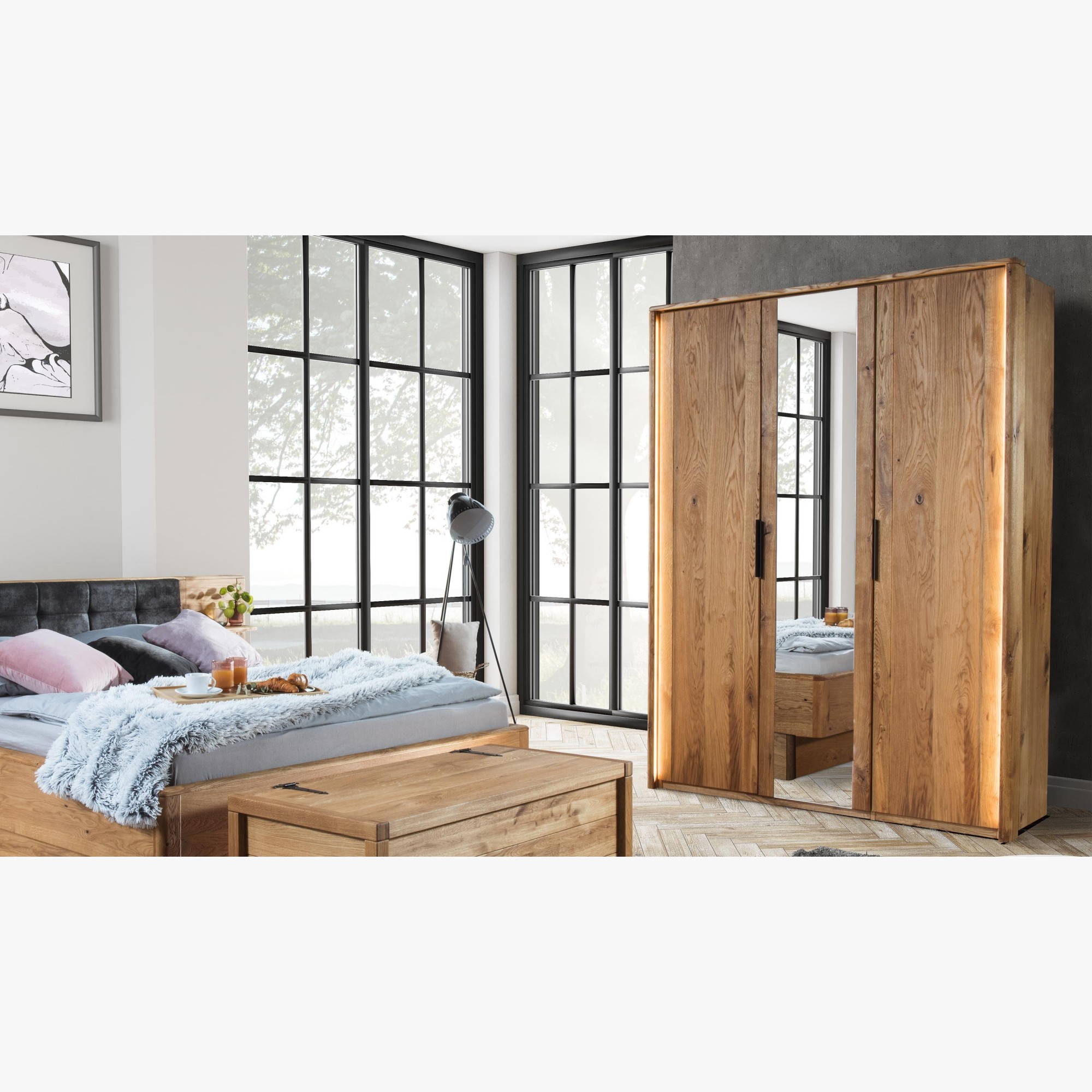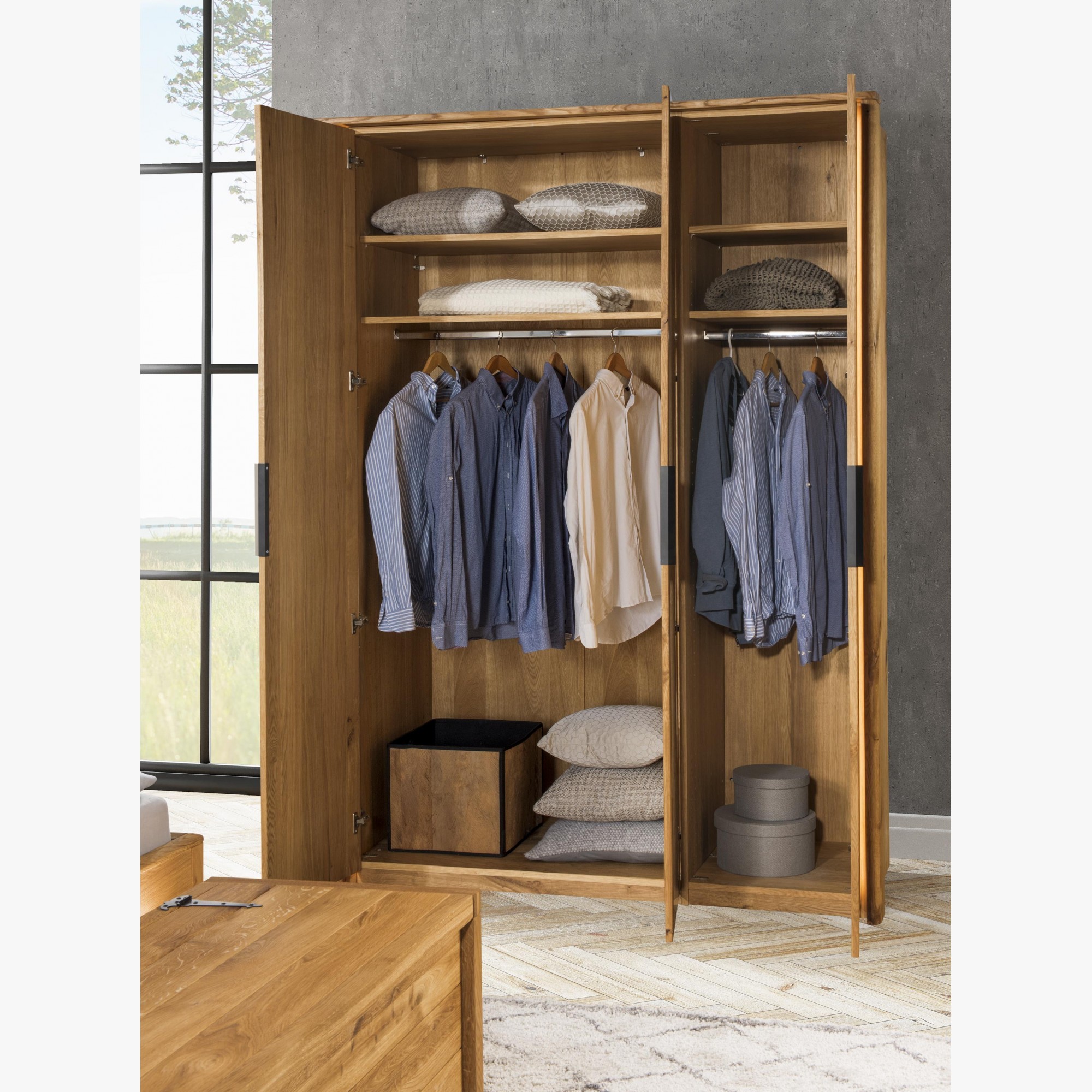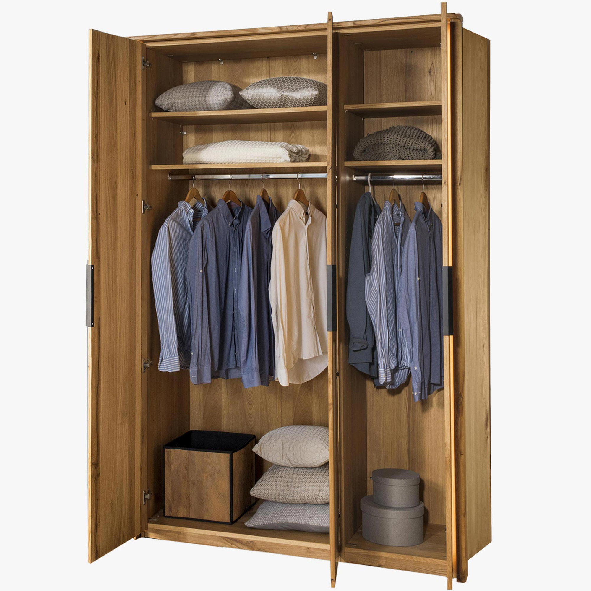 Veľká triedverová skriňa masív dub, Texas 13 skriňa z masívu dub kompozit do spálne z kolekcie nábytku Texas. Skriňa s nádherným dizajnom prírodného nábytku. Pre výrobu sa použilo exkluzívne vyberané dubové drevo, aby nábytok pôsobil autenticky a naturálne. Skriňa sa dodáva v demonte s podrobným návodom na montáž, podmienkou pre kompletnú montáž je uchytenie skrine priamo o stenu. Drevo je v farbe prírodný olej, je teda možné kombinovať aj s iným dubovým nábytkom.