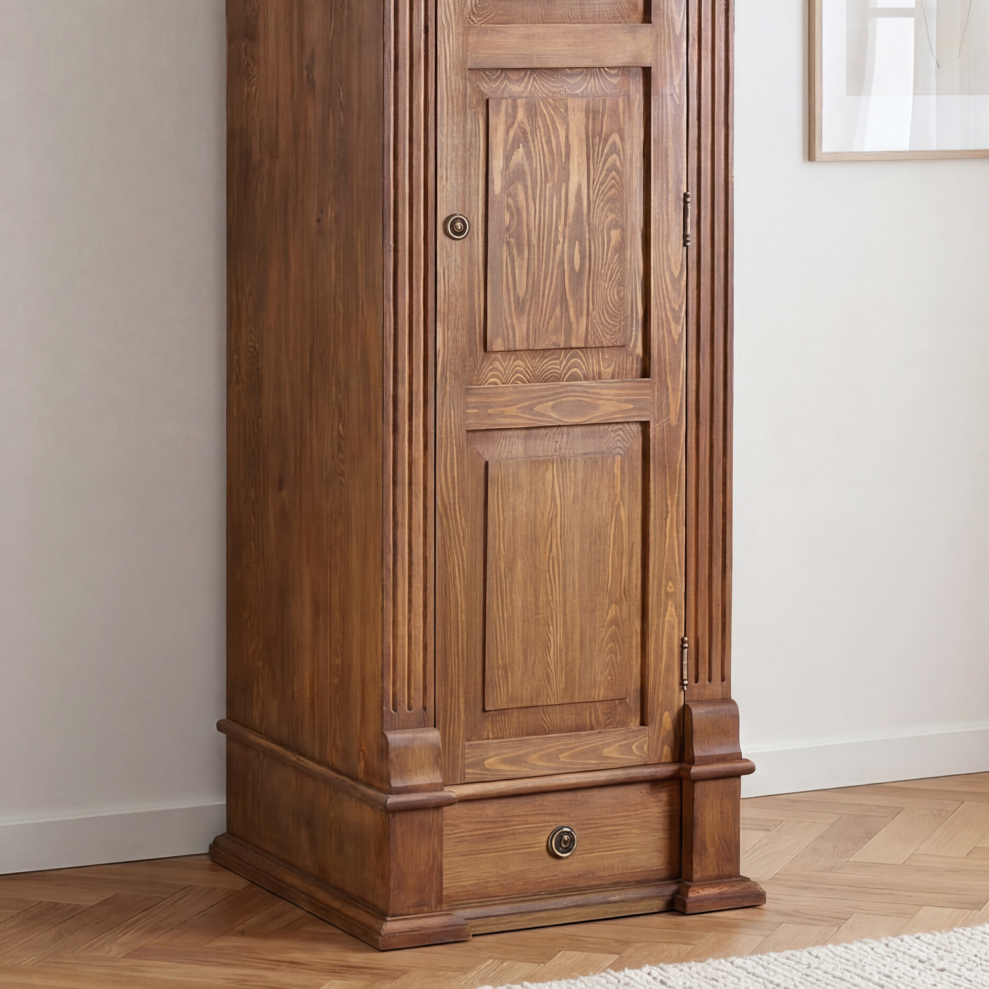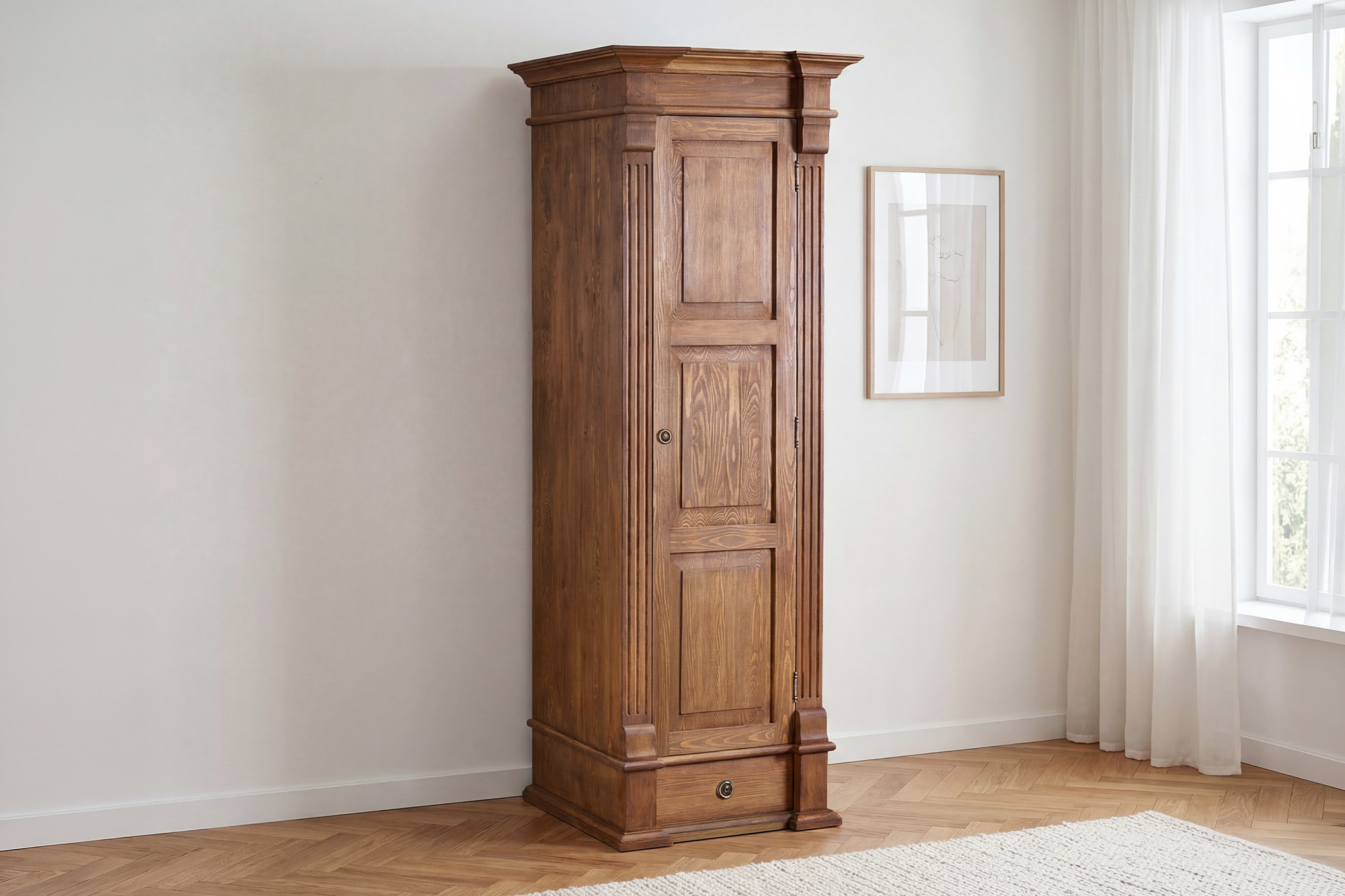 Táto jednodverová šatníková skriňa vyniká pevným prevedením, dekoratívne frézovanými dvierkami a kvalitnými detailmi, ktoré podčiarkujú jej štýlový charakter. Elegantný vzhľad dopĺňajú kovové pánty v farbe starej mosadze a originálne talianske úchyty Bosetti Marella. Povrchová úprava je riešená ručne nanášaným lakom, ktorý zvýrazňuje prirodzenú kresbu borovicového dreva a vytvára jemne starobylý, patinovaný vzhľad.