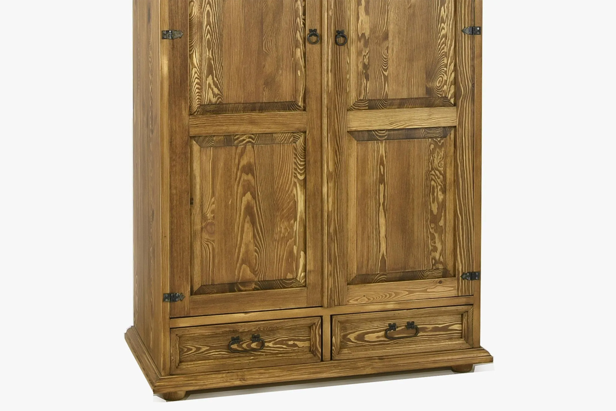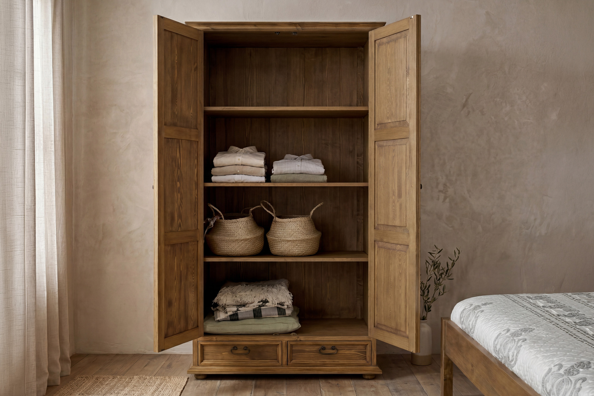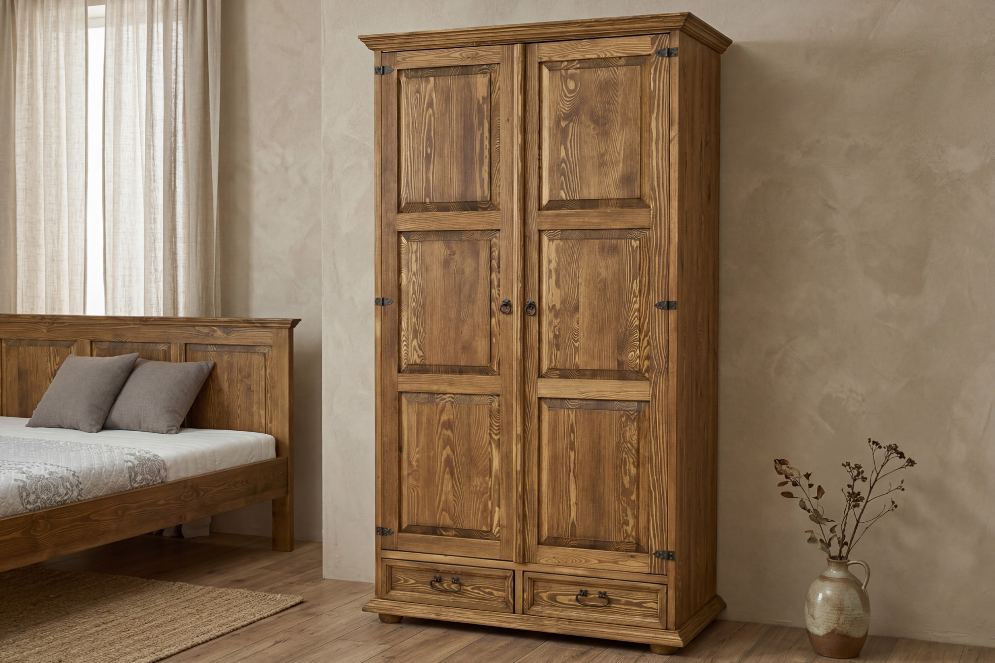 Rustikálna skriňa je dvojkrídlová a ponúka prakticky riešený úložný priestor. Vo vnútri sa nachádzajú tri police po celej šírke, ktoré vytvárajú prehľadne členený priestor na uloženie zloženého oblečenia, posteľnej bielizne, textílií aj ďalších domácich doplnkov. V spodnej časti sú umiestnené dve praktické zásuvky, ktoré skvele poslúžia na uloženie drobností, spodnej bielizne či ďalších každodenných potrieb.