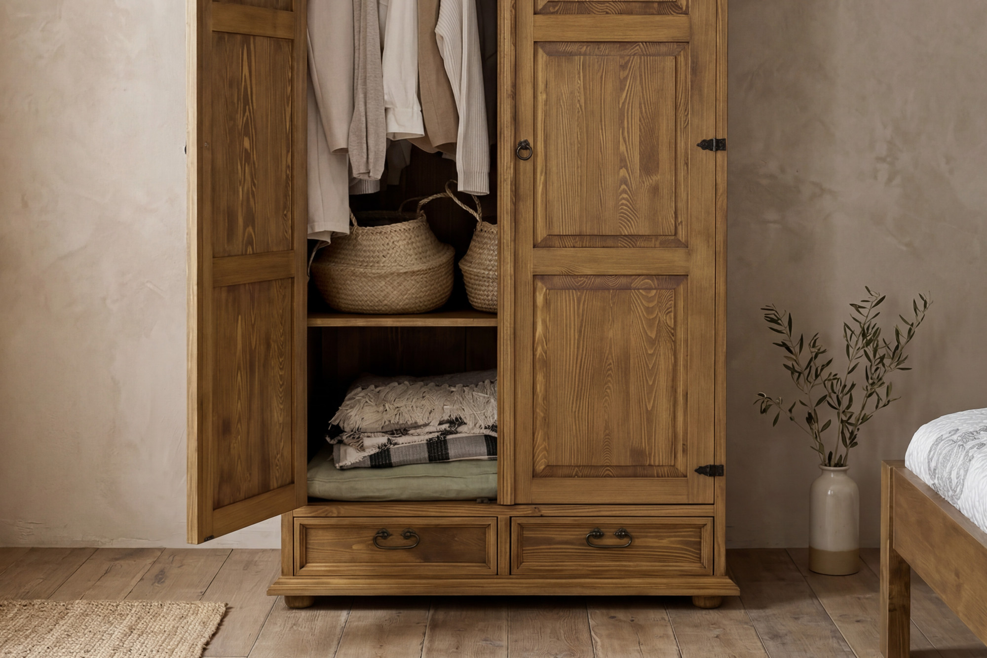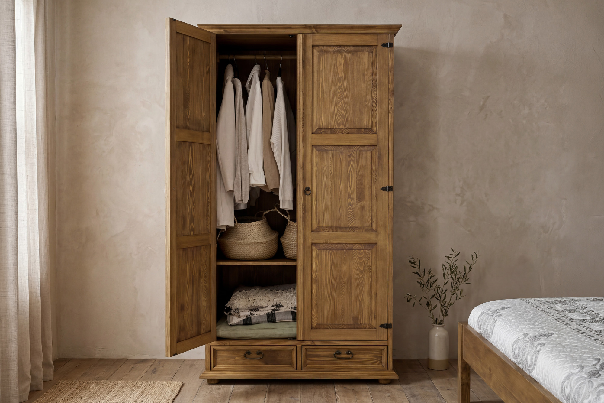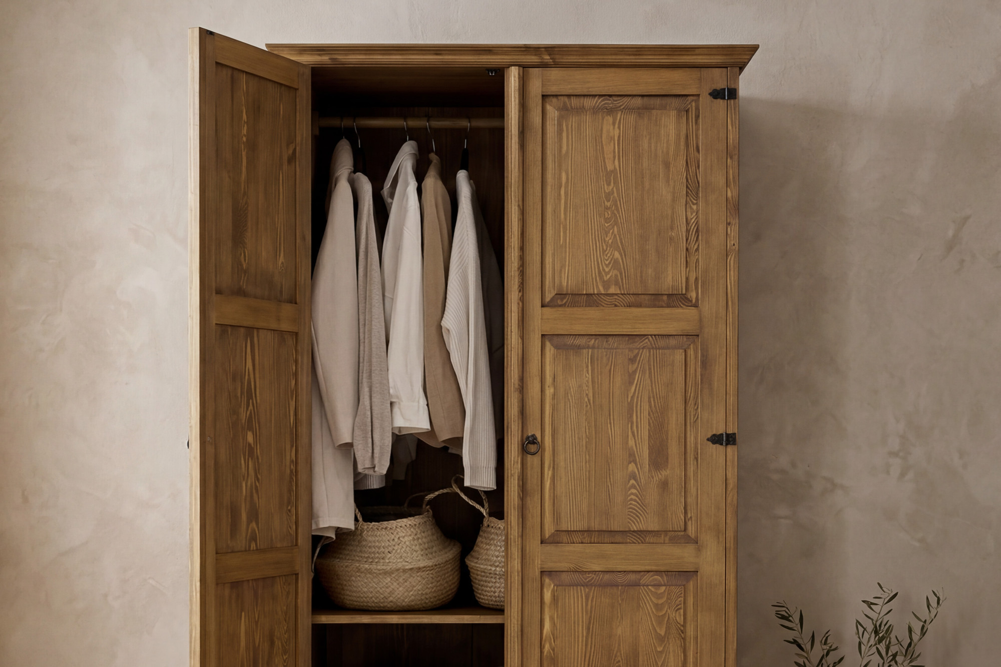 Táto šatníková skriňa z masívu je skvelou voľbou pre zákazníkov, ktorí dávajú prednosť poctivému drevenému nábytku pred sériovo vyrábanými alternatívami. Vyniká stabilnou konštrukciou, tradičným vzhľadom a praktickým využitím. Vďaka tomu je vhodná nielen do spálne, ale aj do štýlovo zariadeného vidieckeho domu, chalupy alebo apartmánu v provensálskom či francúzskom štýle.