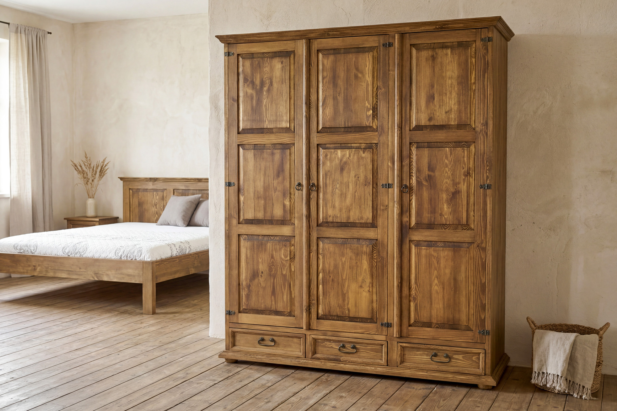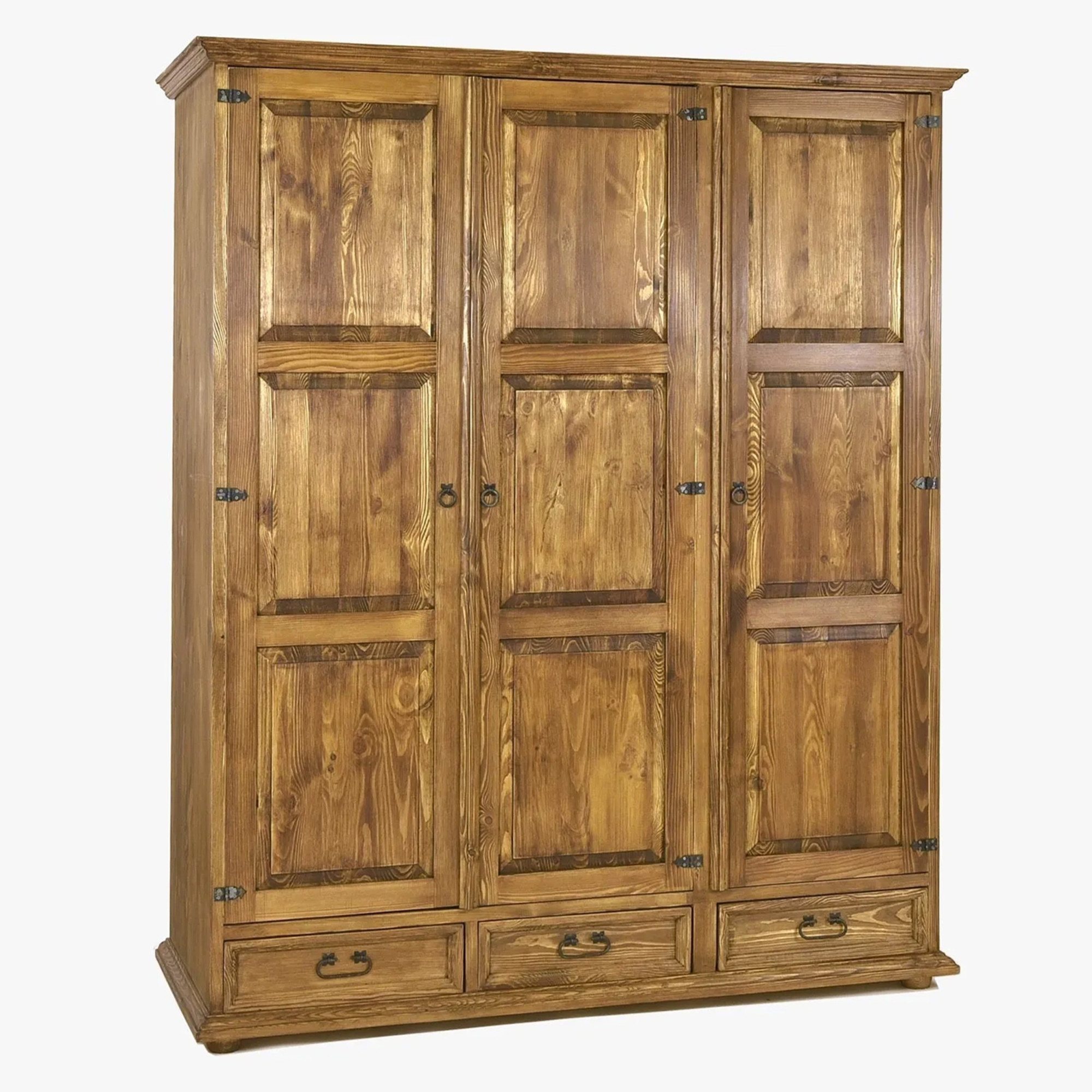 Objavte kúzlo poctivého vidieckeho nábytku s touto trojdverovou rustikálnou skriňou vo francúzskom štýle, ktorá vniesie do spálne atmosféru pravého francúzskeho vidieka. Skriňa je vyrobená z kvalitného masívneho borovicového dreva, vďaka čomu vyniká pevnosťou, dlhou životnosťou a autentickým prírodným charakterom. Elegantné rustikálne prevedenie, prepracované detaily a teplý tmavo medový odtieň robia z tejto skrine nielen praktický úložný priestor, ale aj výrazný dizajnový prvok interiéru.