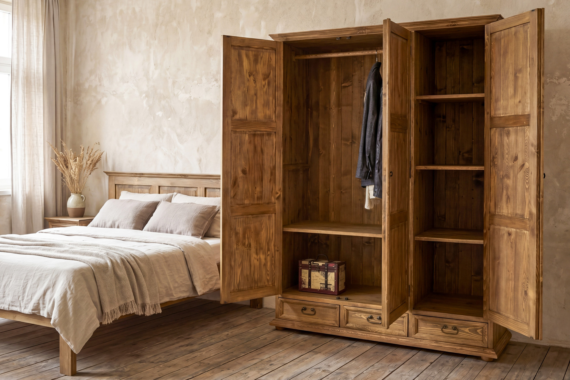 Skriňa je vyrobená z kvalitného masívneho borovicového dreva, ktoré je obľúbené pre svoju pevnosť a prírodný vzhľad.