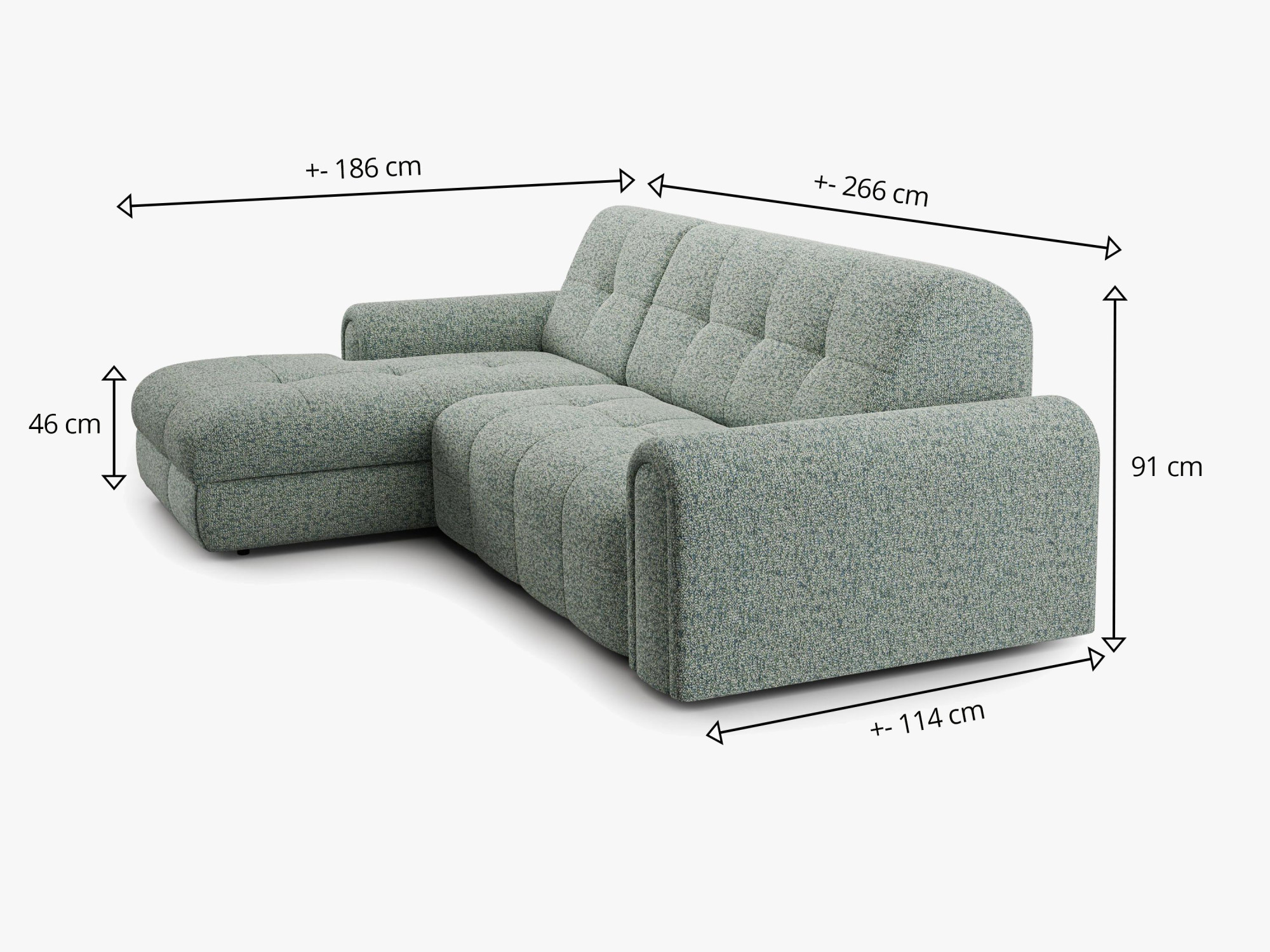 Rozmery sedačky sú šírka 266 cm, hĺbka rohu 186 cm a výška 91 cm, čo zaisťuje dostatok priestoru pre celú rodinu. Výška sedu 46 cm a hĺbka sedu 63-120 cm zaisťujú maximálne pohodlie a oporu pre vaše telo. Pevná konštrukcia zaručuje stabilitu a dlhú životnosť, zatiaľ čo moderný dizajn a kvalitné čalúnenie pridávajú sedačke estetickú hodnotu. Sedačka je tak nielen praktickým kusom nábytku, ale aj štýlovým prvkom každého domova.