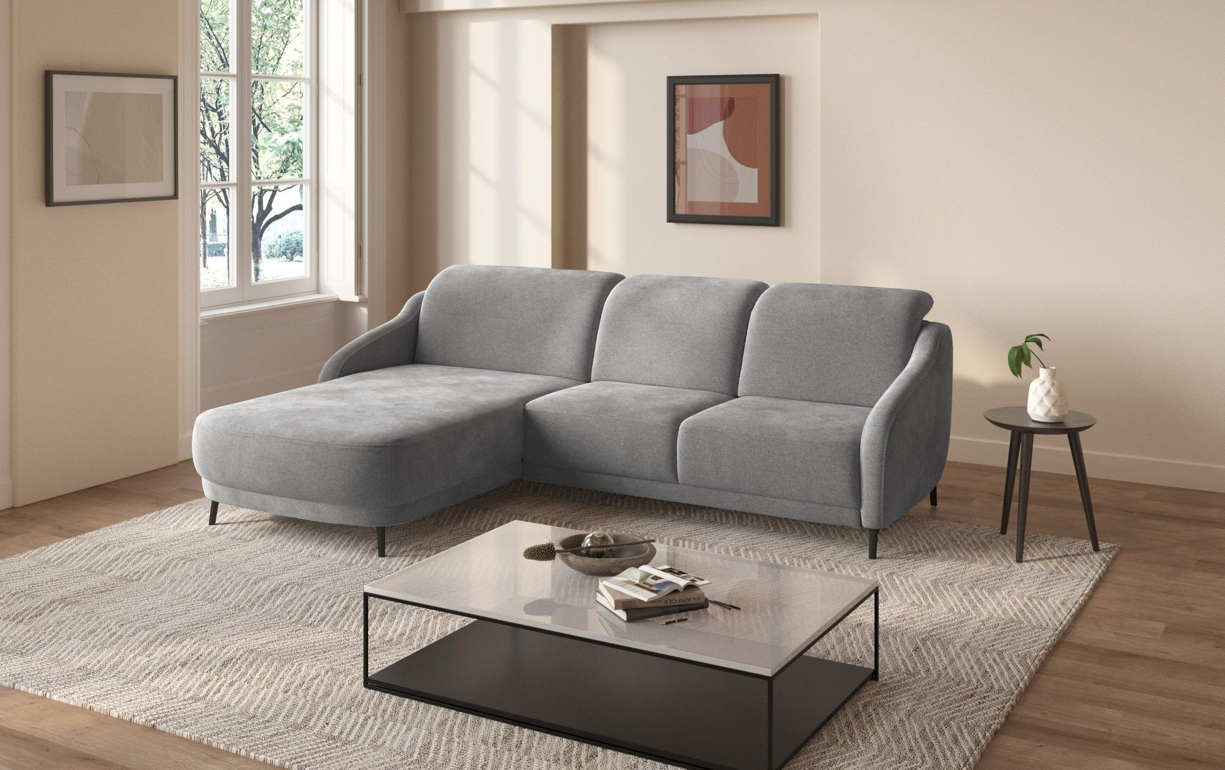 Na obrázku je rohová sedacia súprava v látke JULES Grau.