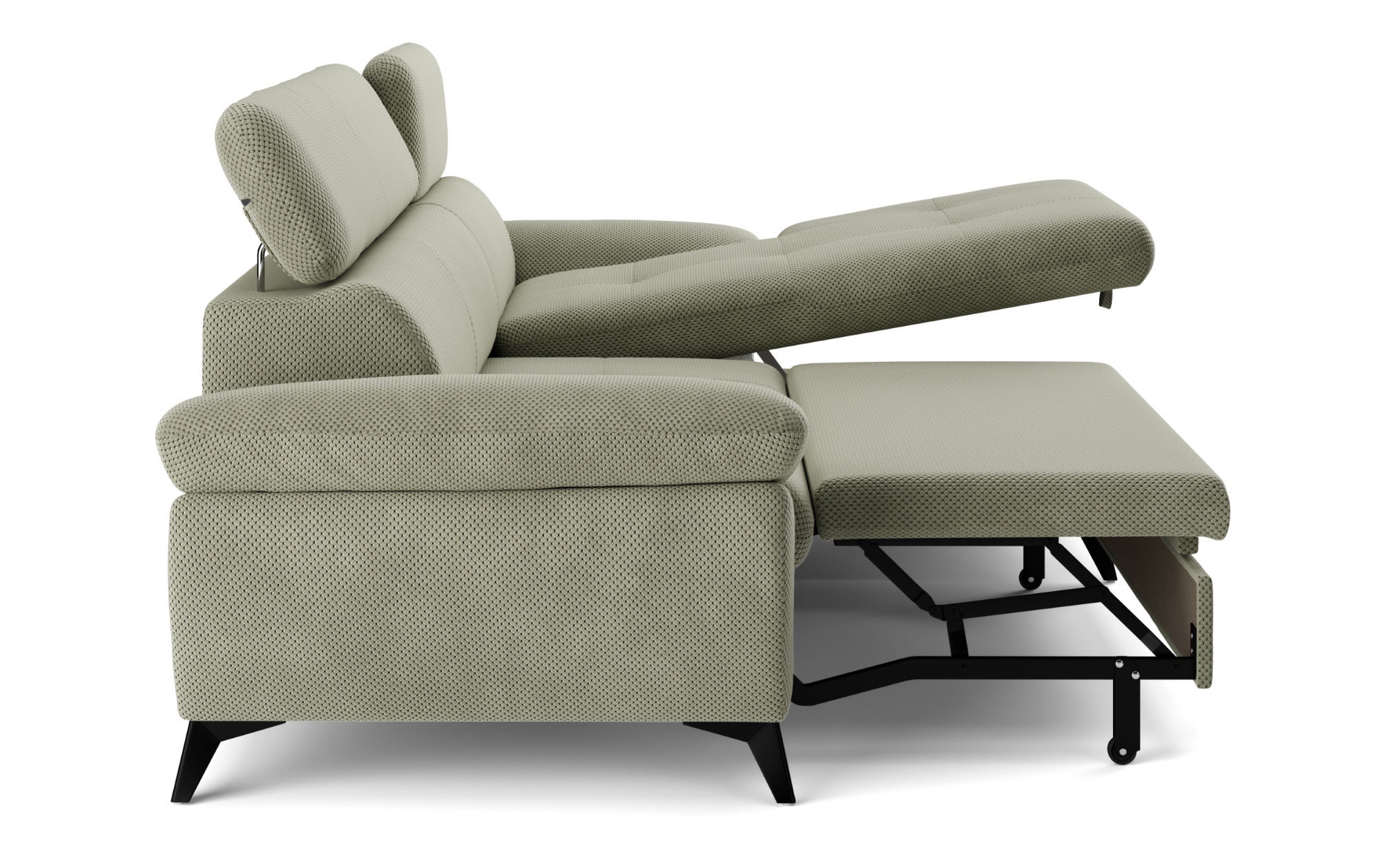 Súčasťou tejto sedacej súpravy je aj funkcia príležitostného spania, ktorú oceníte pri návštevách hostí alebo v prípade potreby rýchlo vytvoriť komfortné miesto na oddych. Pre ešte väčšie pohodlie je sedák tvorený molitanovou penou rôznych hustôt a oceľovými zvlnenými pružinami, čo zabezpečuje rovnováhu medzi mäkkosťou a stabilnou oporou. Vďaka vyšším kovovým nohám nie je upratovanie pod sedačkou nijako náročné, a naviac celok pôsobí ľahko a vzdušne.