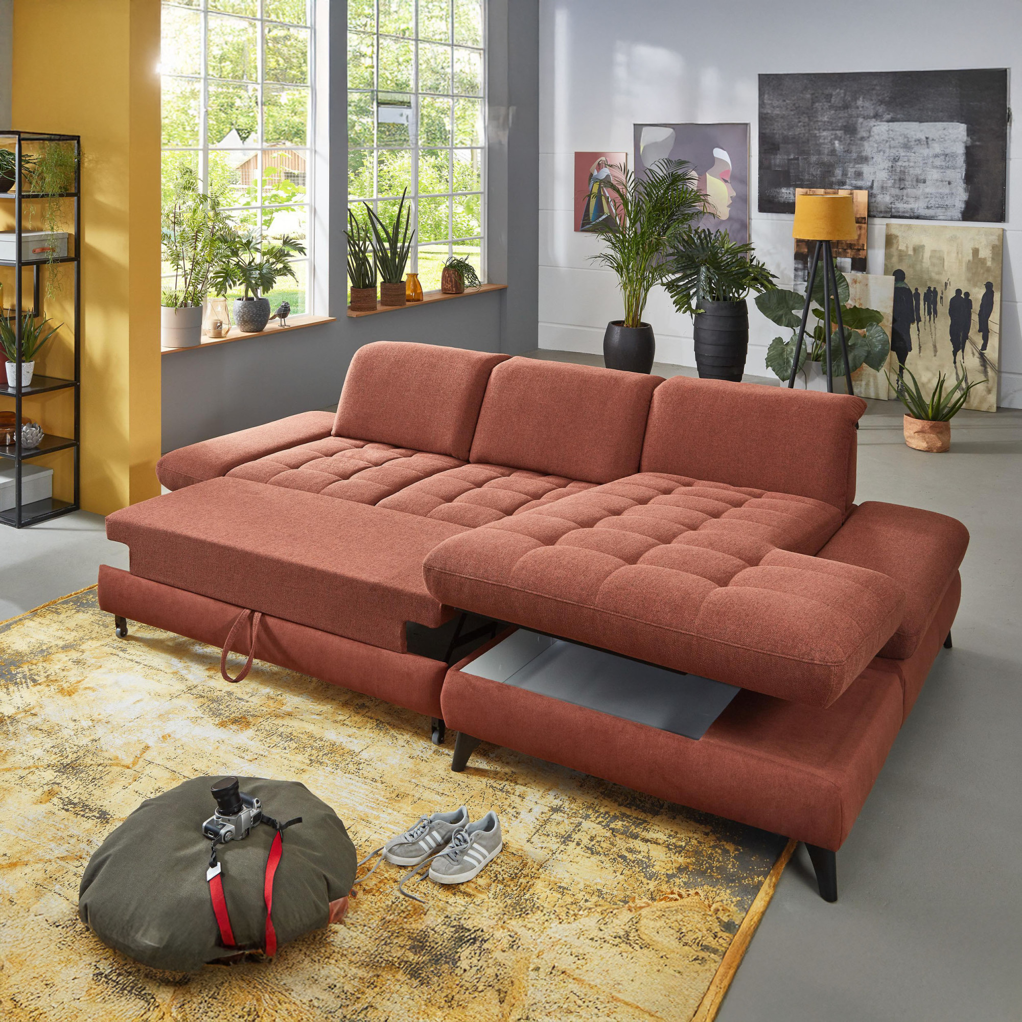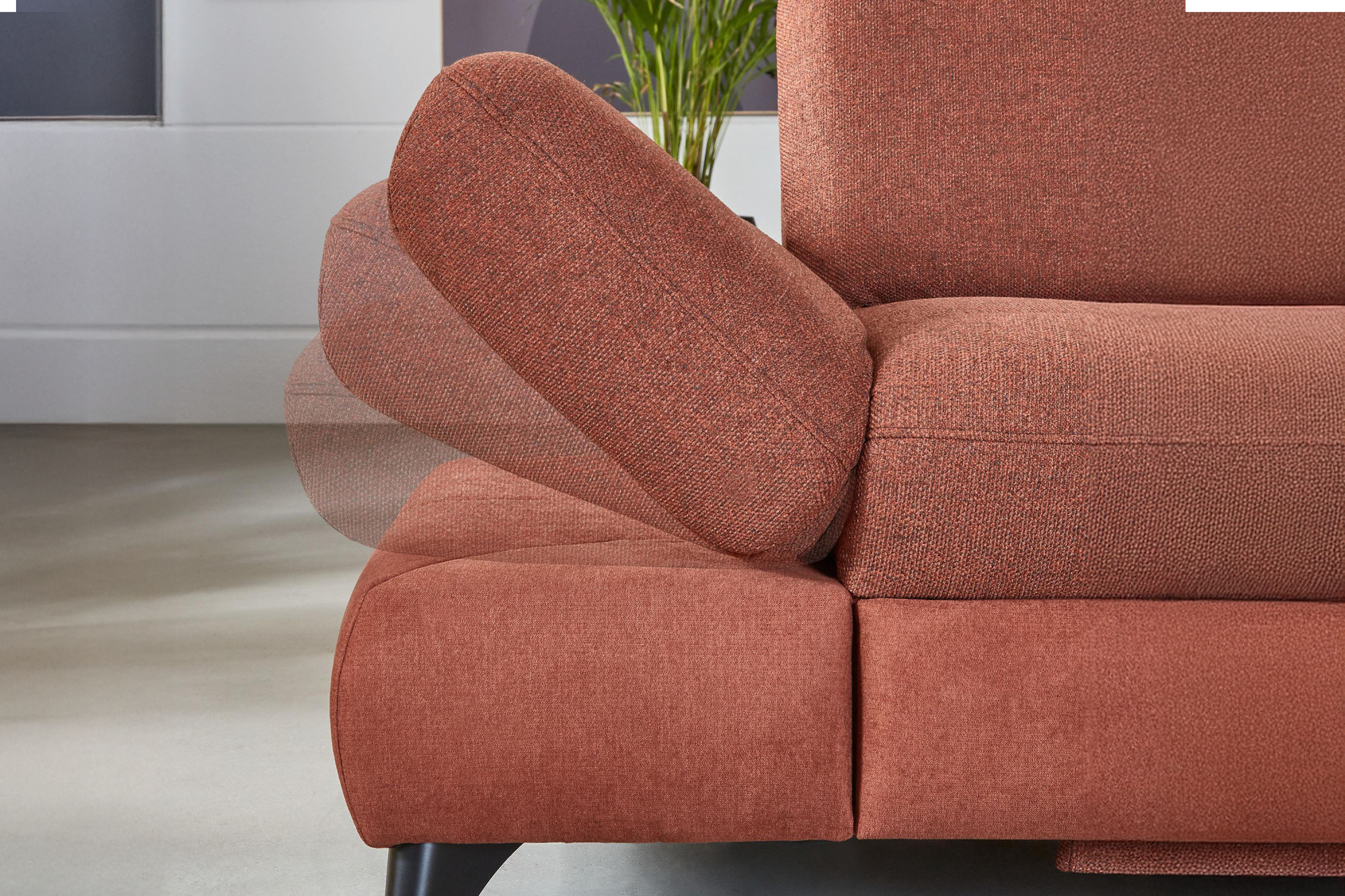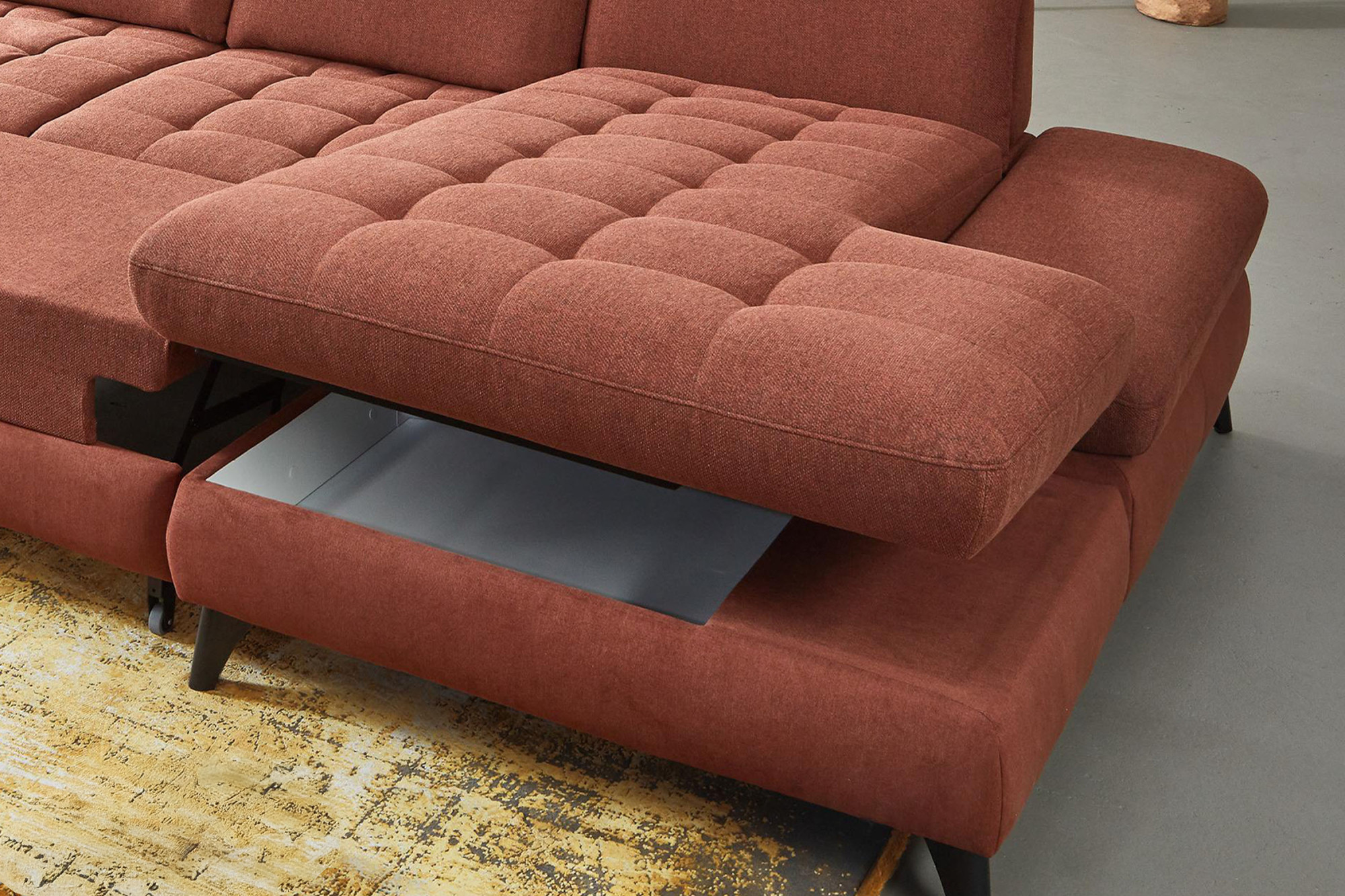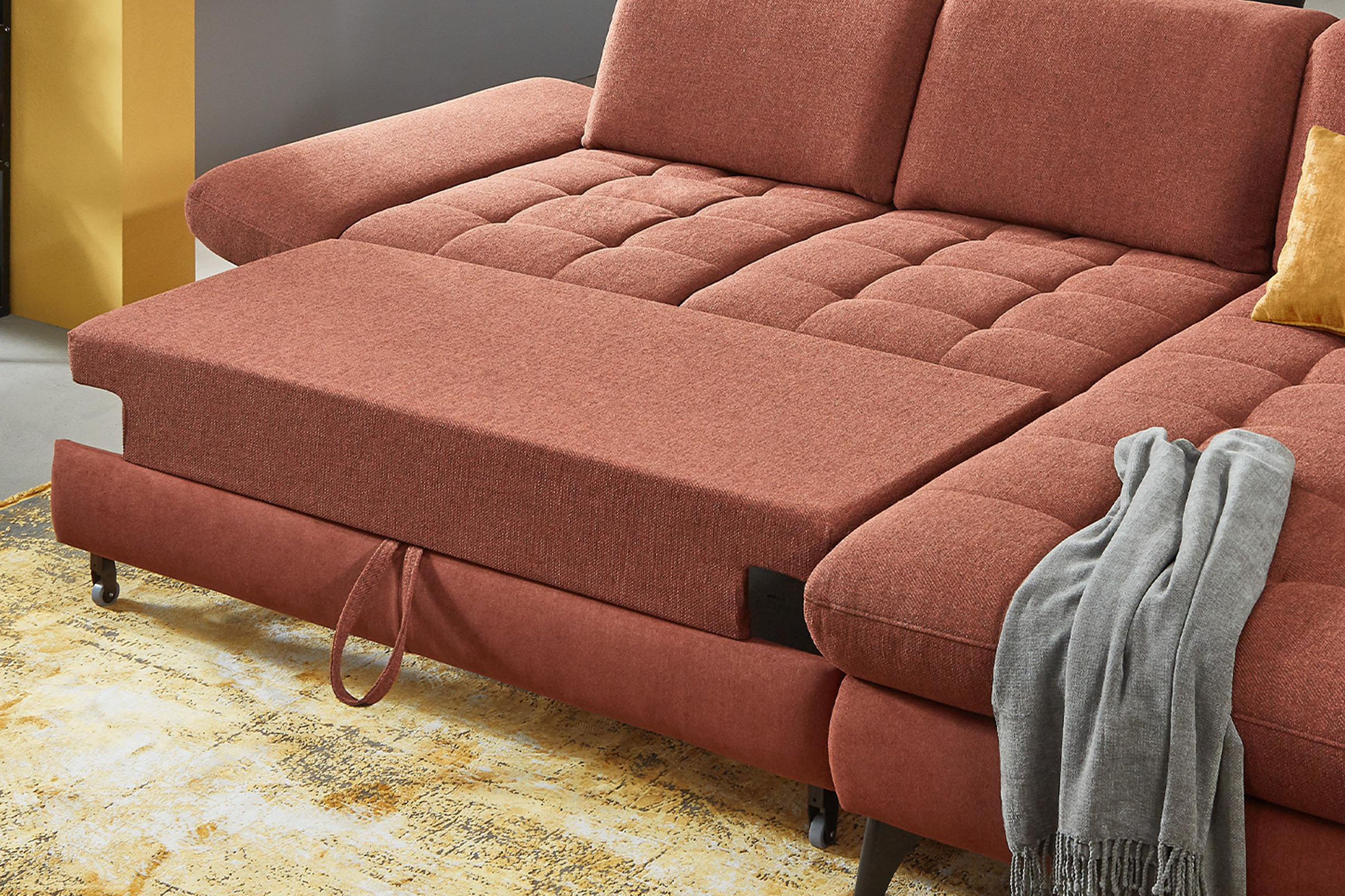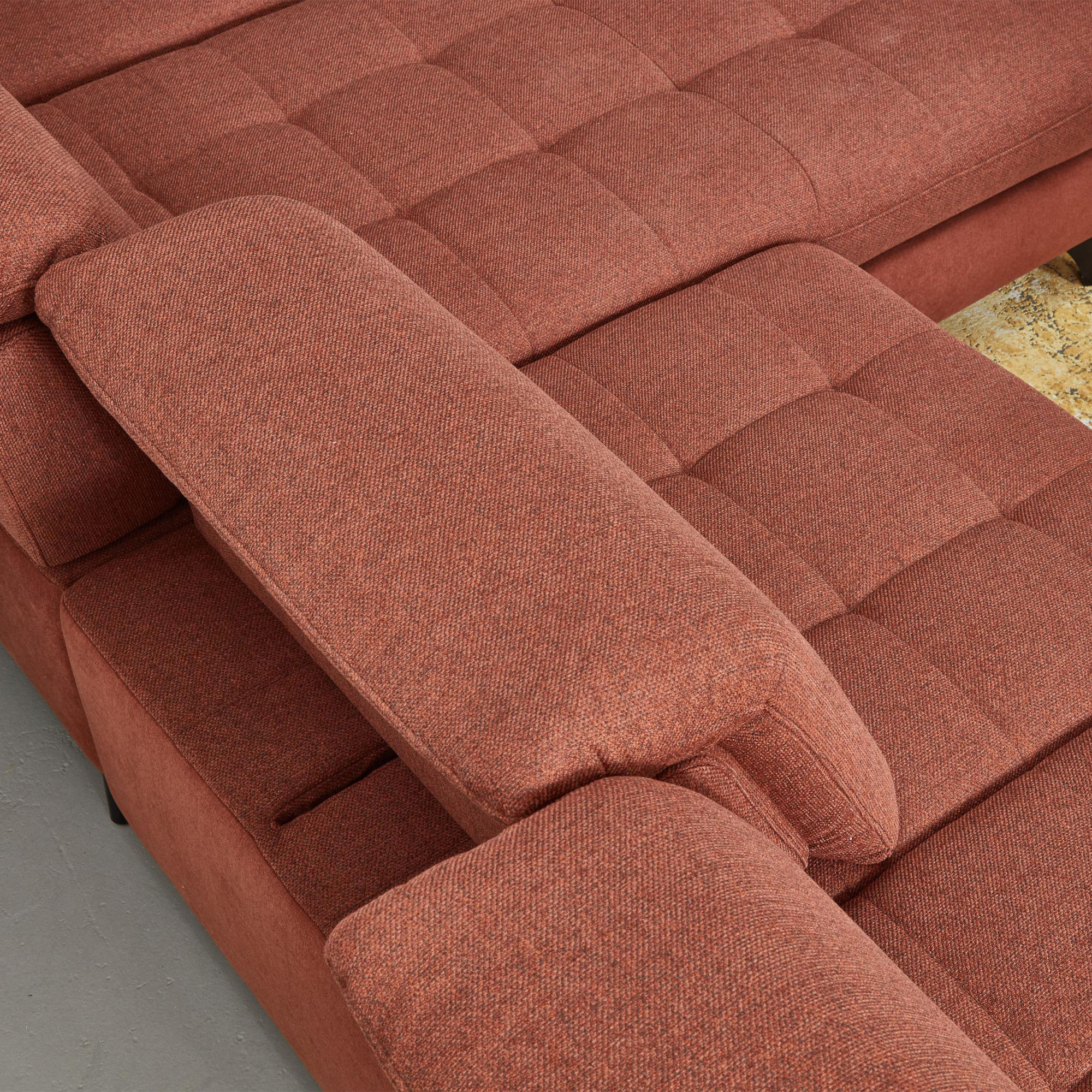 * Na fotografii je pohovka vrátane funkcie spania a úložného priestoru, označenie modelu je 2100_68.BETT.E 8142_68_BK, typ opierky B, nožičky typ 1 matná čierna, v látke Paris kupfer.