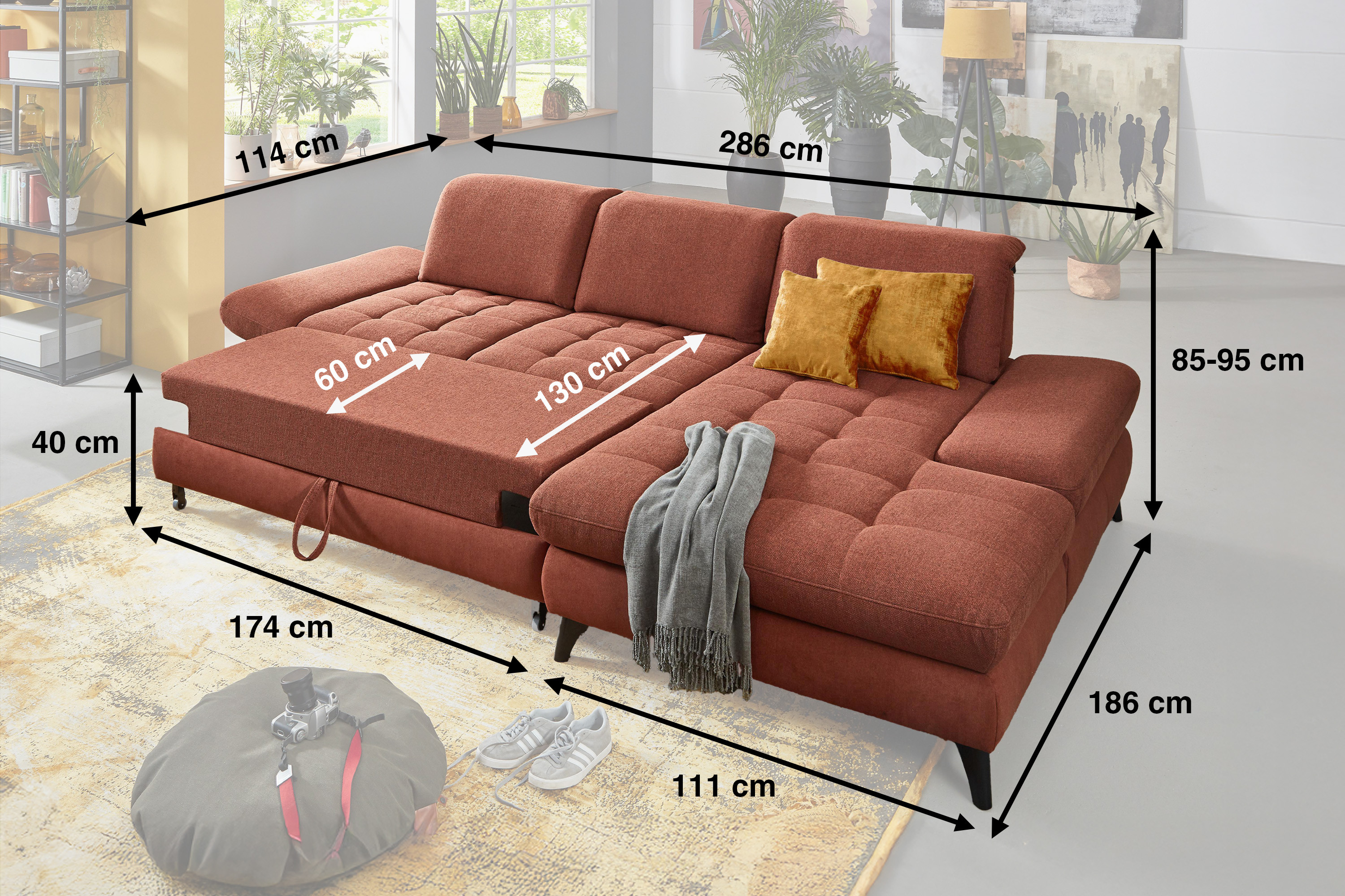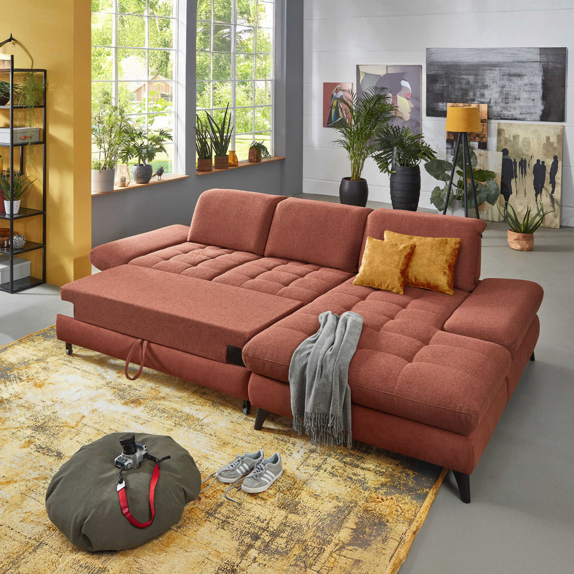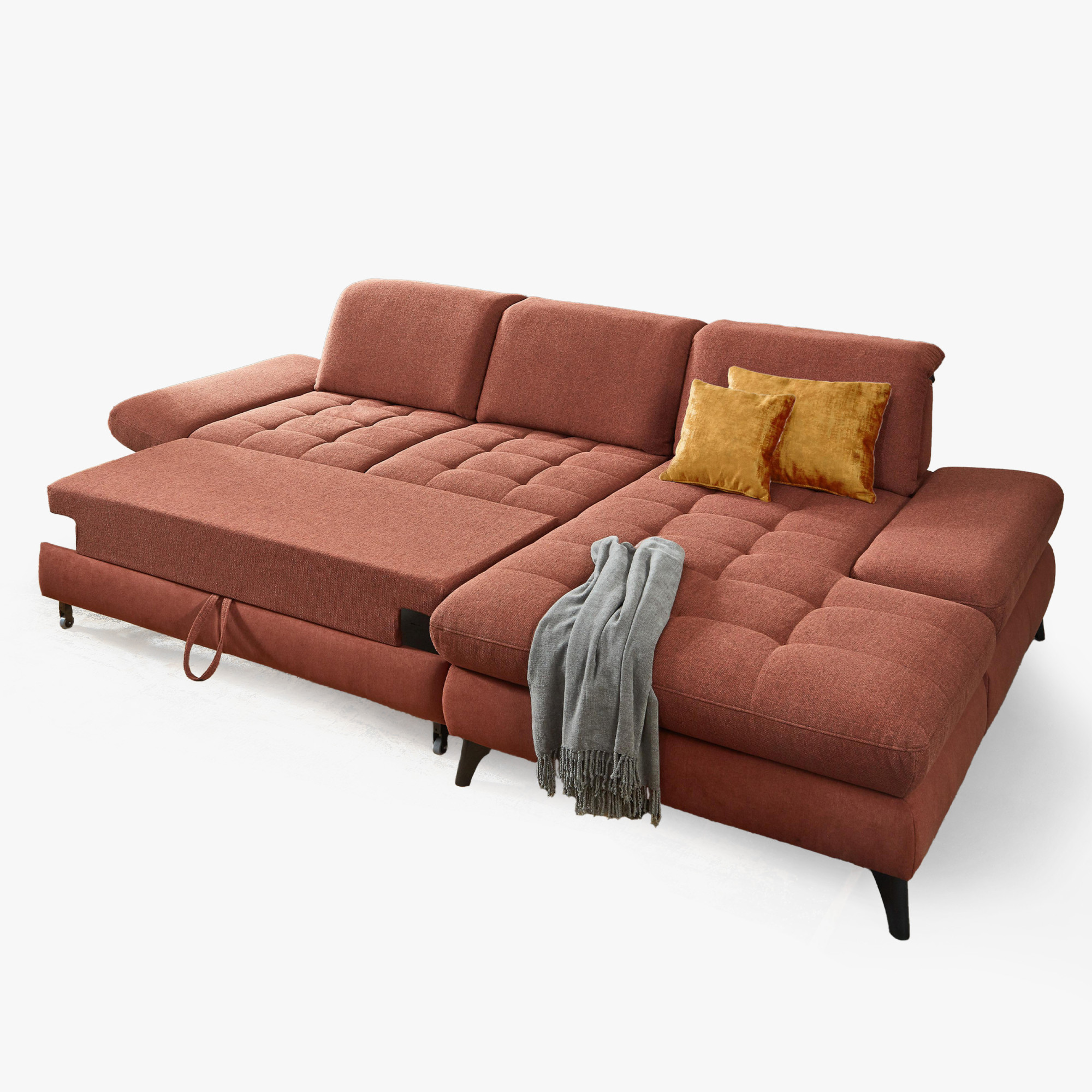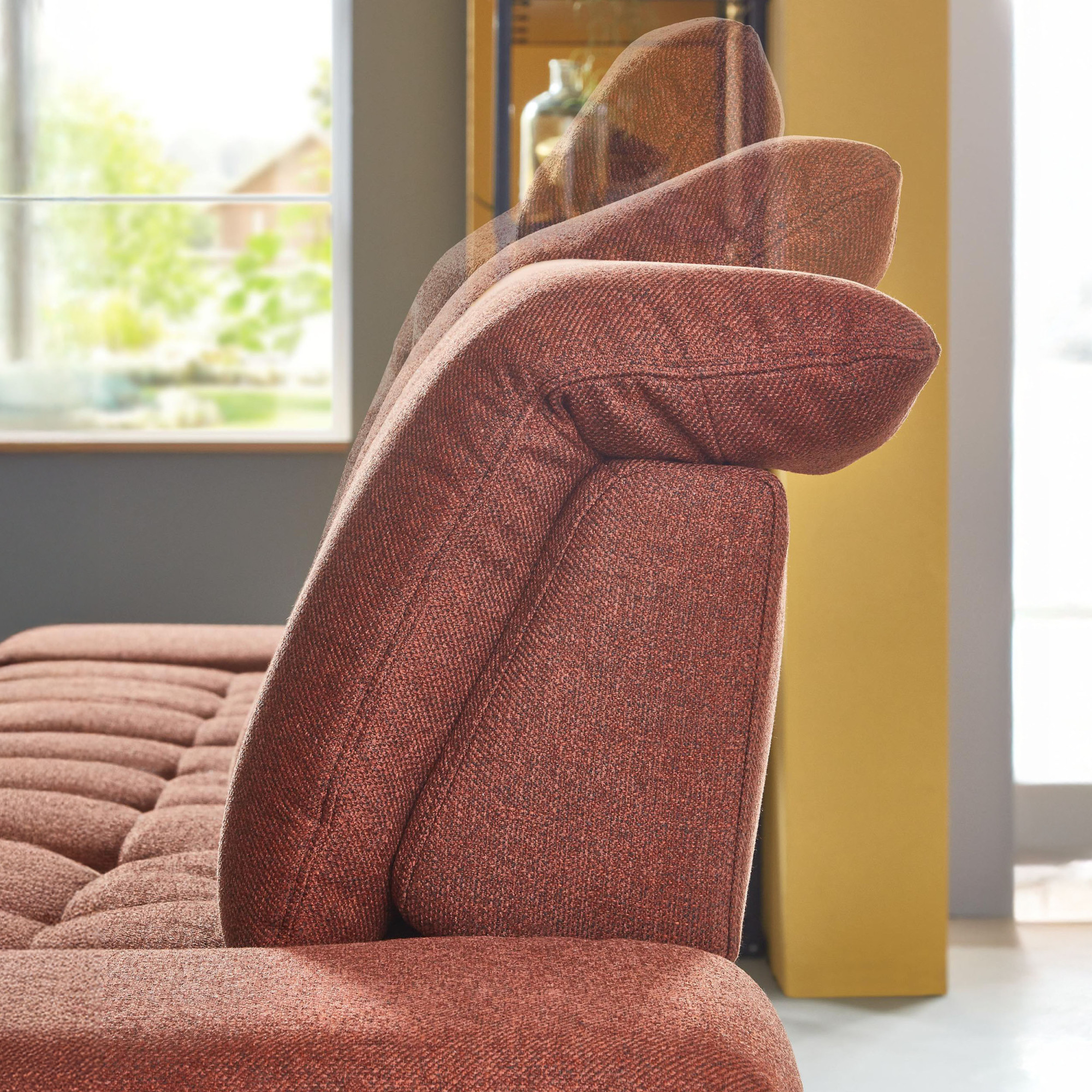 * Na fotografii je pohovka vrátane funkcie spania a úložného priestoru, označenie modelu je 2100_68.BETT.E 8142_68_BK, typ opierky B, nožičky typ 1 matná čierna, v látke Paris kupfer.