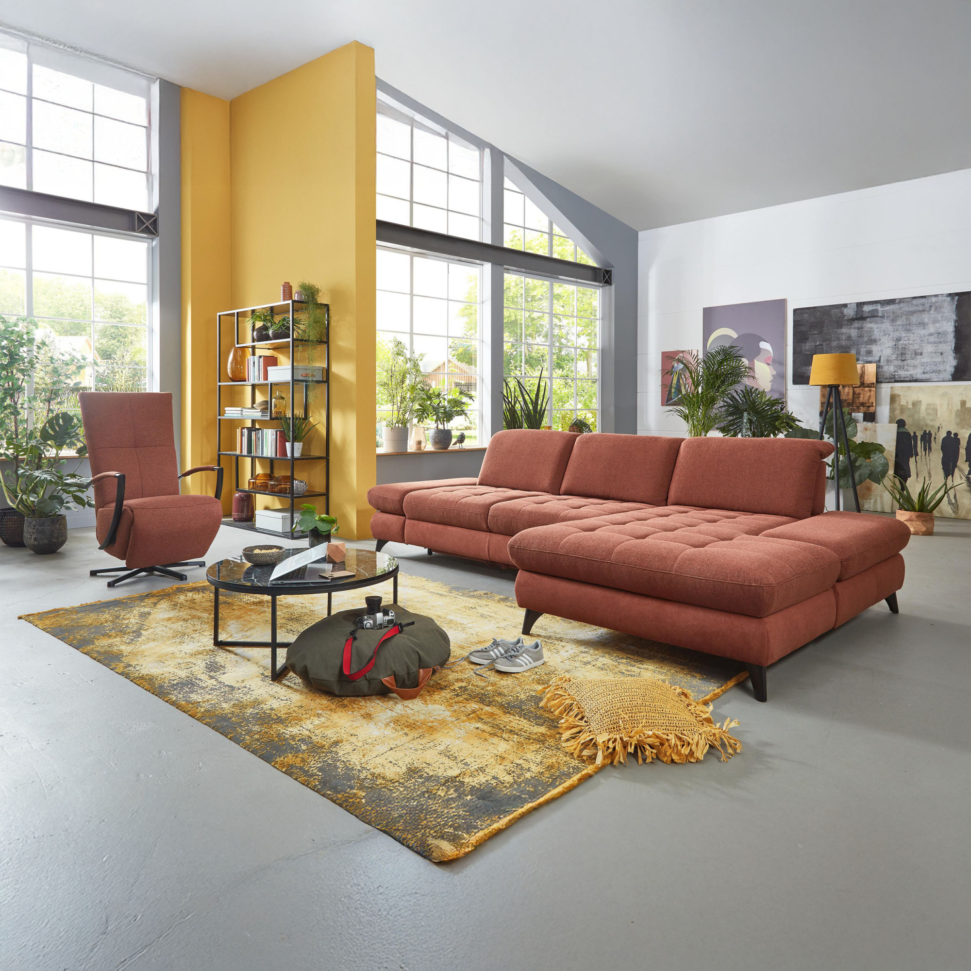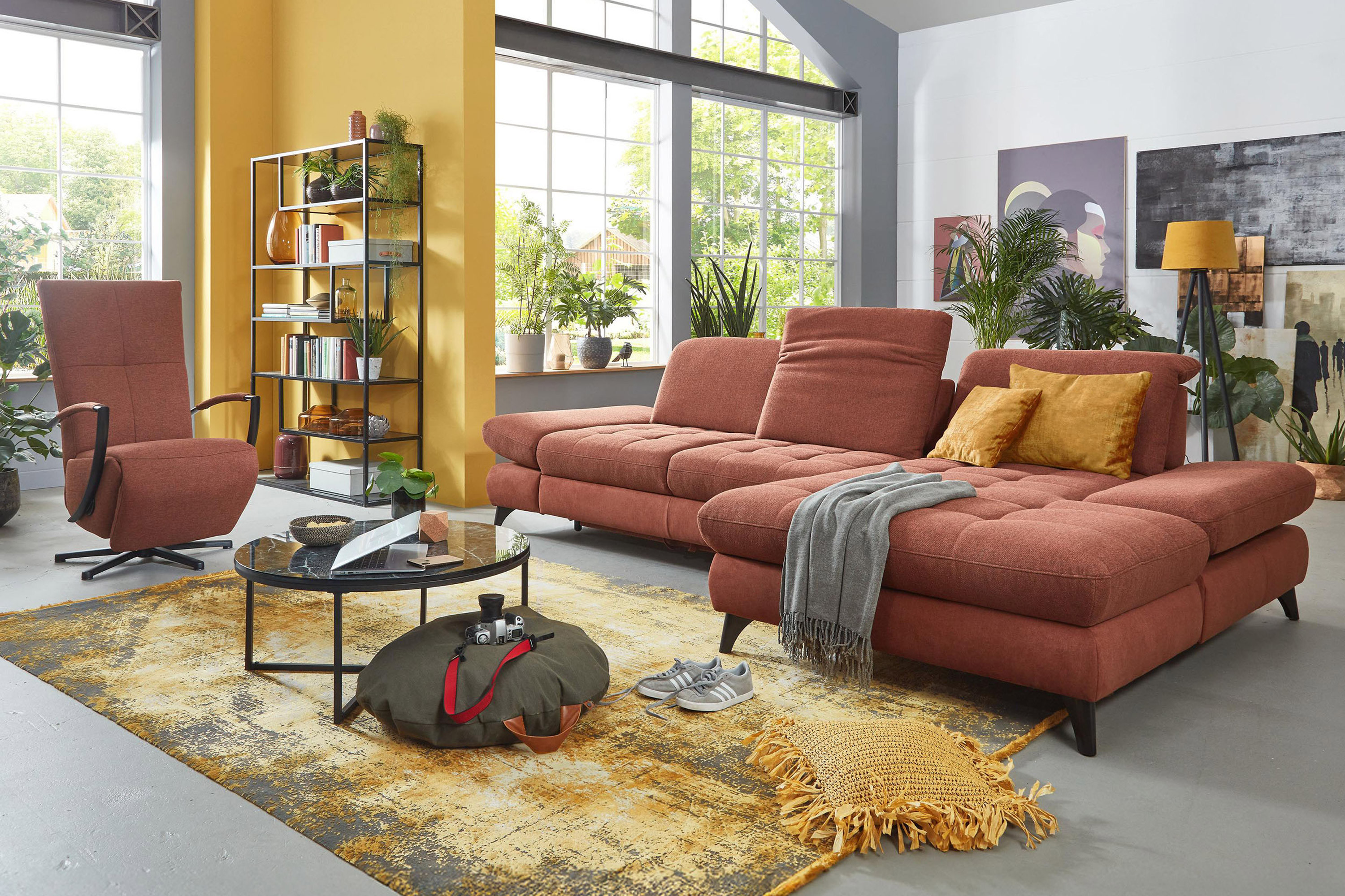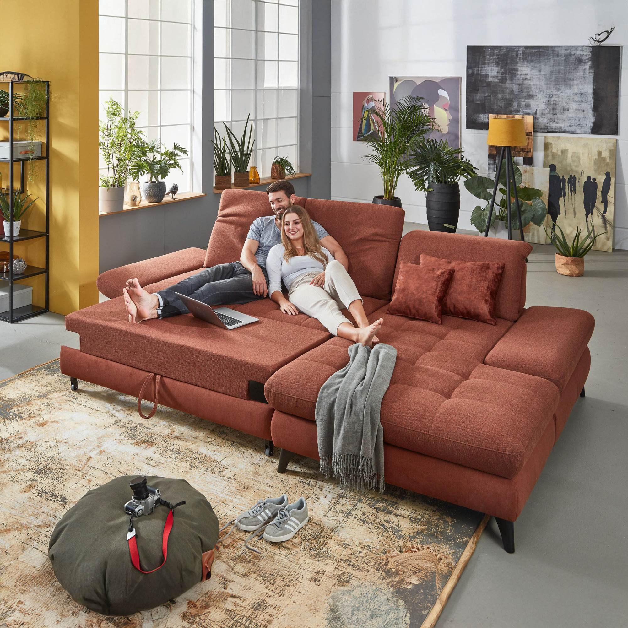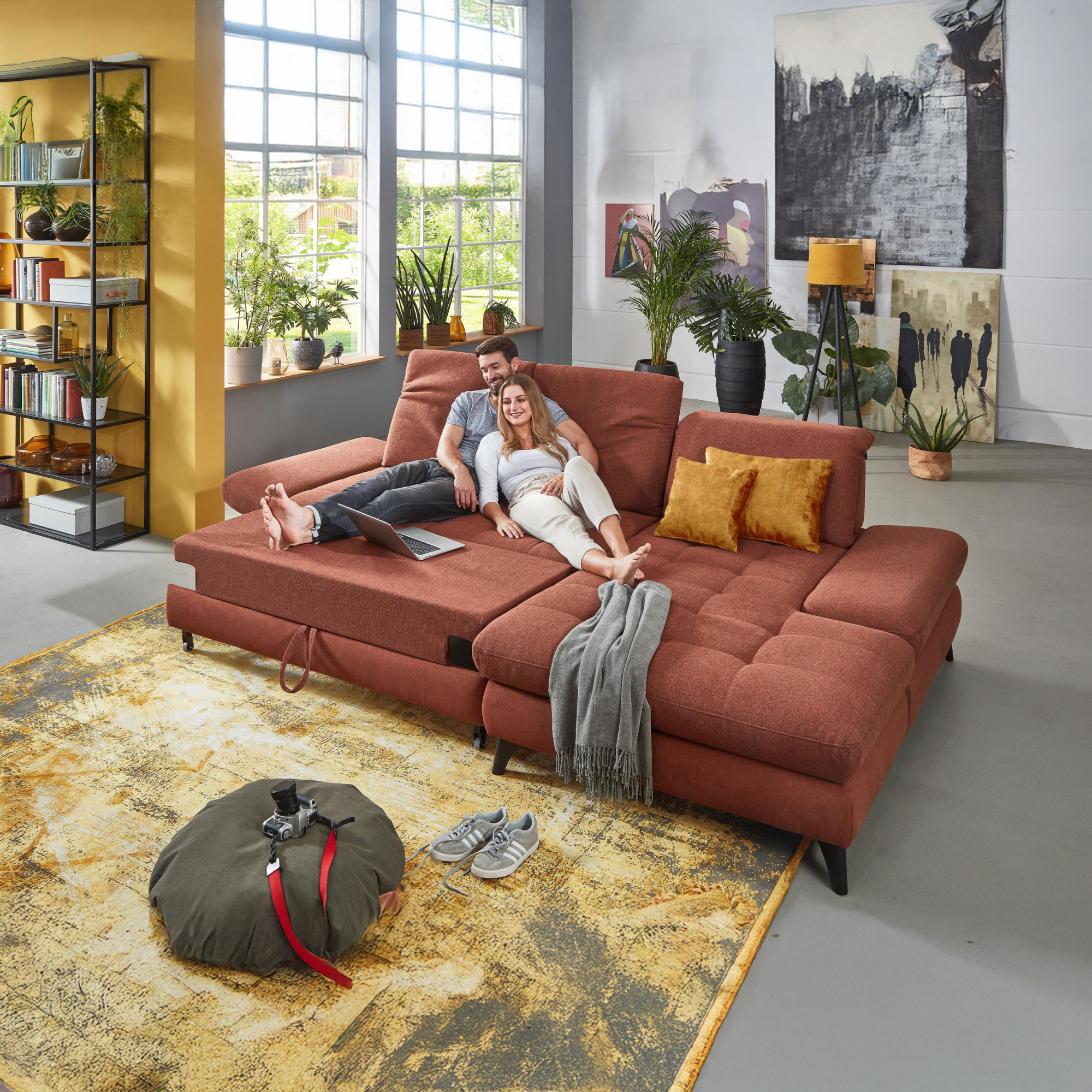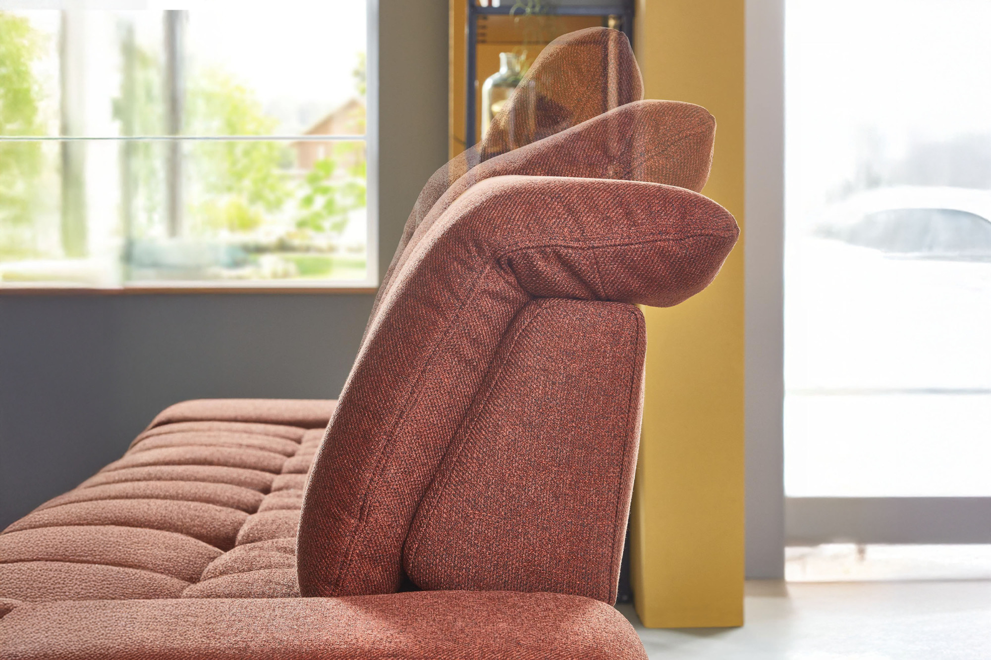 * Na fotografii je pohovka vrátane funkcie spania a úložného priestoru, označenie modelu je 2100_68.BETT.E 8142_68_BK, typ opierky B, nožičky typ 1 matná čierna, v látke Paris kupfer.