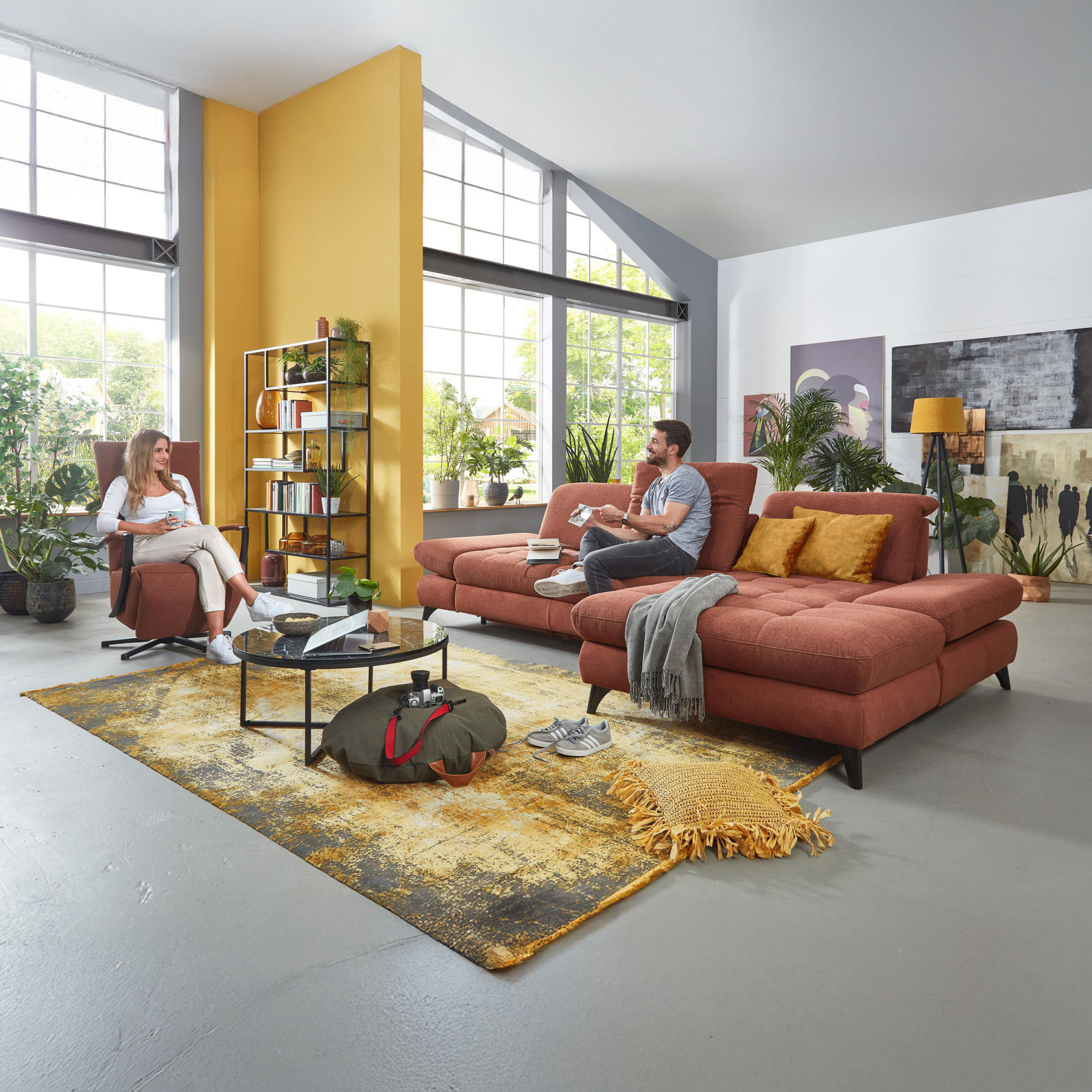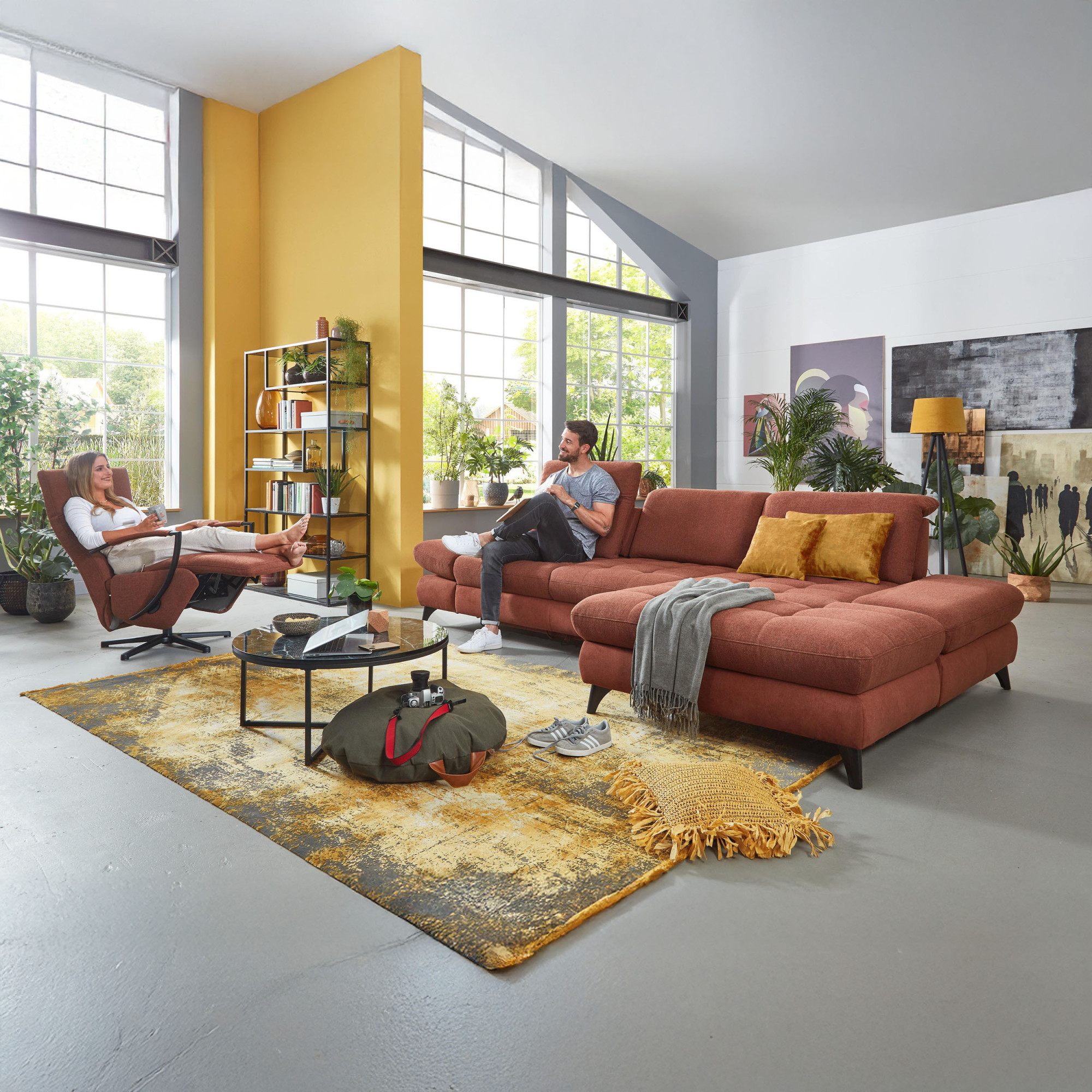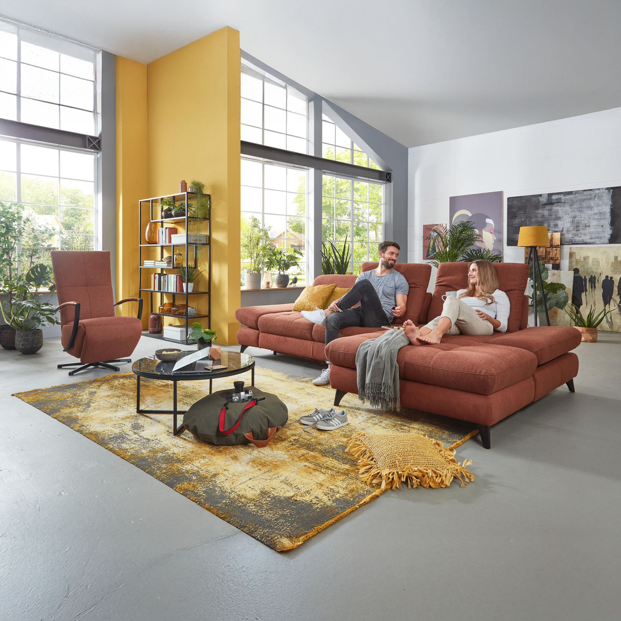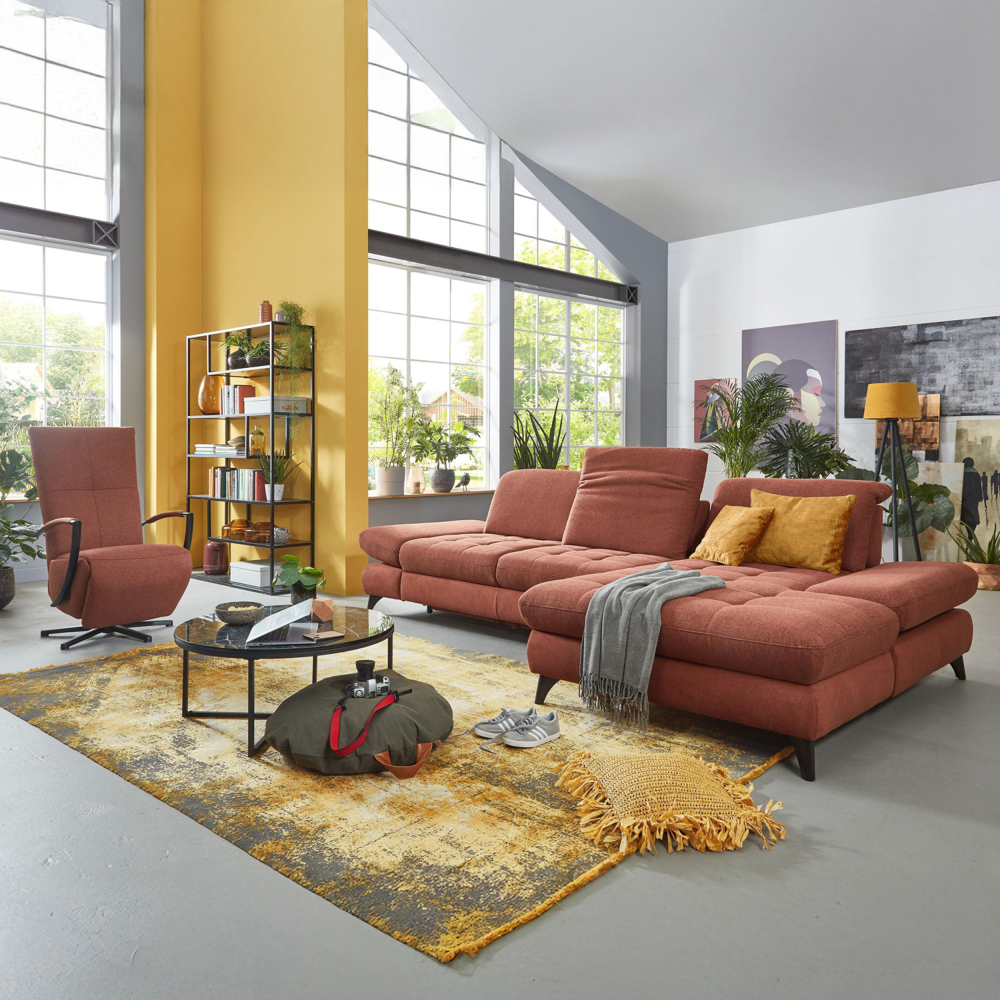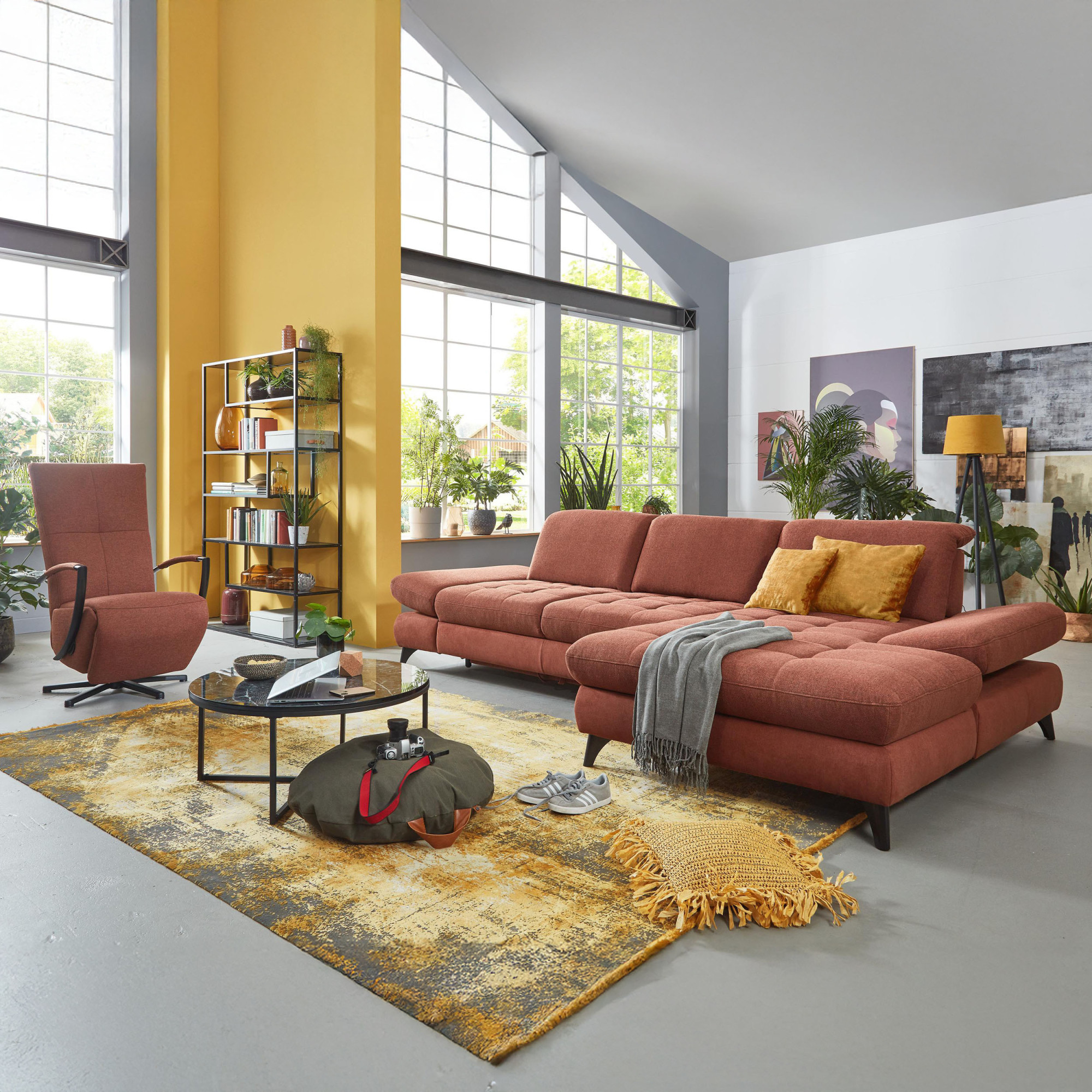 * Na fotografii je pohovka vrátane funkcie spania a úložného priestoru, označenie modelu je 2100_68.BETT.E 8142_68_BK, typ opierky B, nožičky typ 1 matná čierna, v látke Paris kupfer.