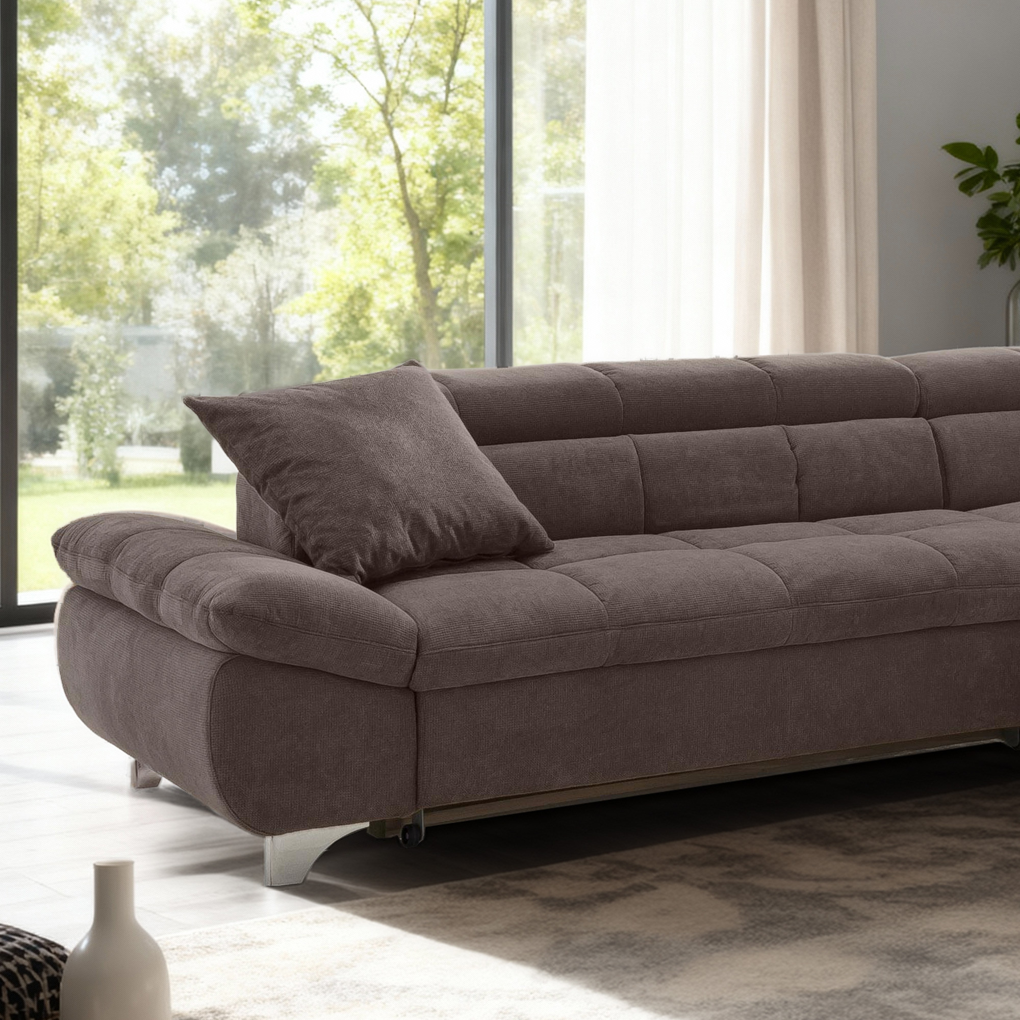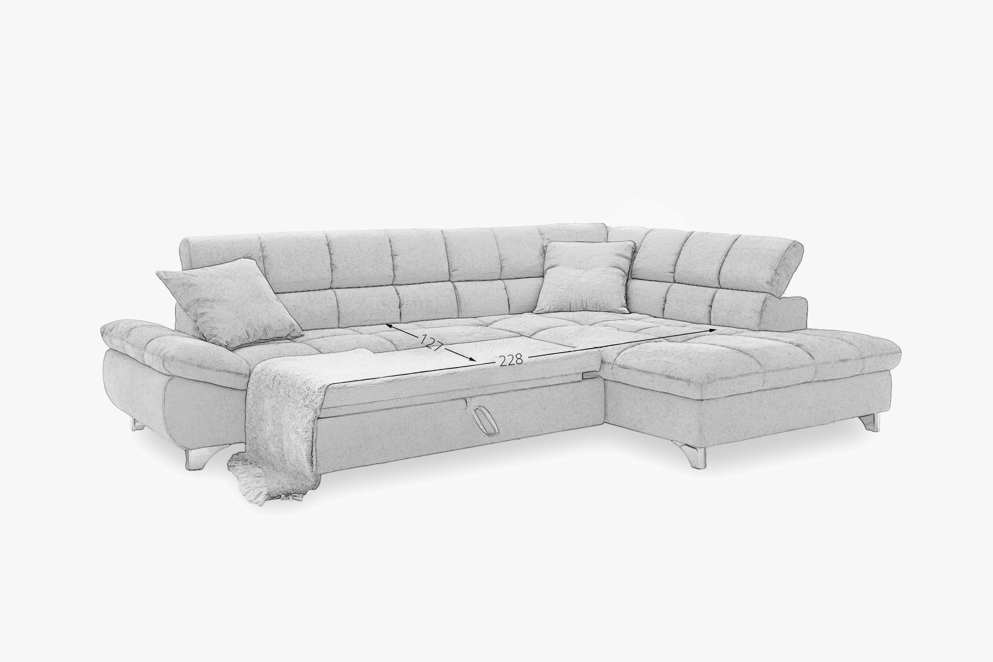 Sedacia súprava je navrhnutá s ohľadom na vaše potreby – ponúka praktickú funkciu rozkladacieho lôžka pre príležitostné spanie hostí a zabezpečuje maximálne pohodlie pri odpočinku. Nastaviteľné opierky hlavy umožnia ešte väčšiu relaxáciu pri sledovaní televízie alebo čítaní. Rozmery sedačky sú šírka 312 cm a hĺbka 234 cm, k dispozícii je varianta s rohom vľavo alebo vpravo podľa usporiadania vášho priestoru. Kovové nohy vo výške 10 cm dodávajú súprave ľahký a vzdušný vzhľad a umožňujú jednoduchú údržbu podlahy pod sedačkou. Táto rohová sedacia súprava s funkciou spania je perfektnou voľbou pre rodiny aj milovníkov pohodlia, ktorí oceňujú kvalitné spracovanie a nadčasový dizajn.