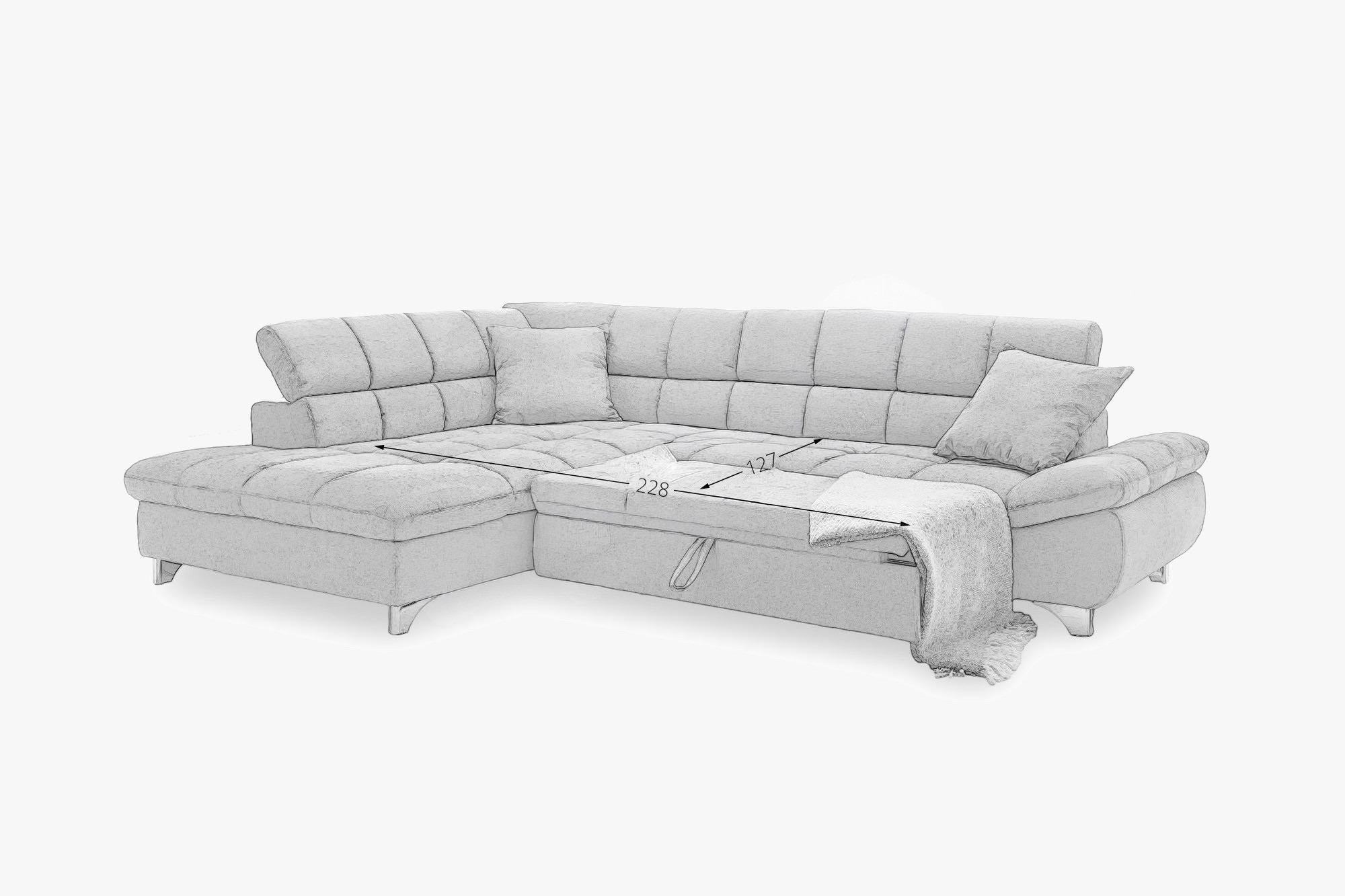 Sedacia súprava je navrhnutá s ohľadom na vaše potreby – ponúka praktickú funkciu rozkladacieho lôžka pre príležitostné spanie hostí a zabezpečuje maximálne pohodlie pri odpočinku. Nastaviteľné opierky hlavy umožnia ešte väčšiu relaxáciu pri sledovaní televízie alebo čítaní. Rozmery sedačky sú šírka 312 cm a hĺbka 234 cm, k dispozícii je varianta s rohom vľavo alebo vpravo podľa usporiadania vášho priestoru. Kovové nohy vo výške 10 cm dodávajú súprave ľahký a vzdušný vzhľad a umožňujú jednoduchú údržbu podlahy pod sedačkou. Táto rohová sedacia súprava s funkciou spania je perfektnou voľbou pre rodiny i milovníkov pohodlia, ktorí oceňujú kvalitné spracovanie a nadčasový dizajn.