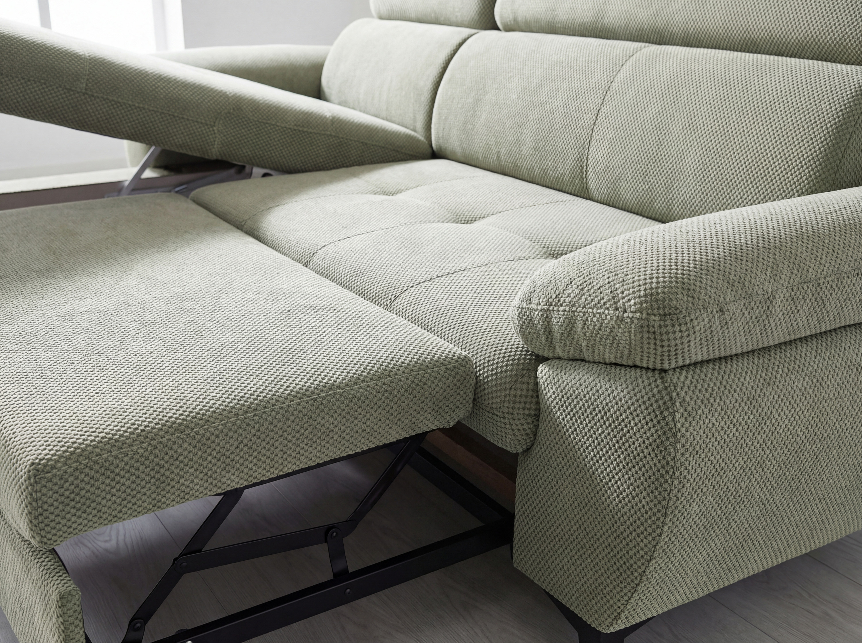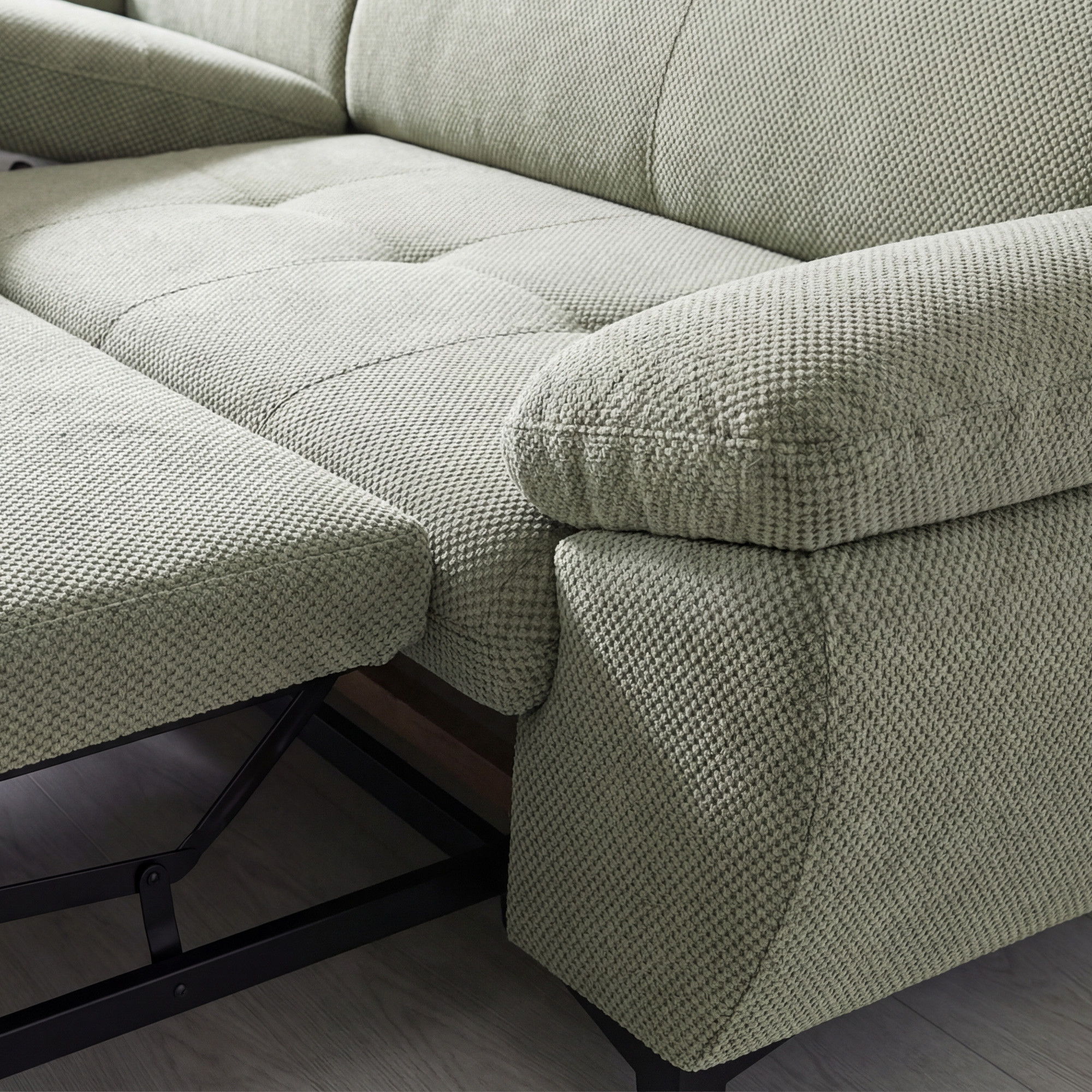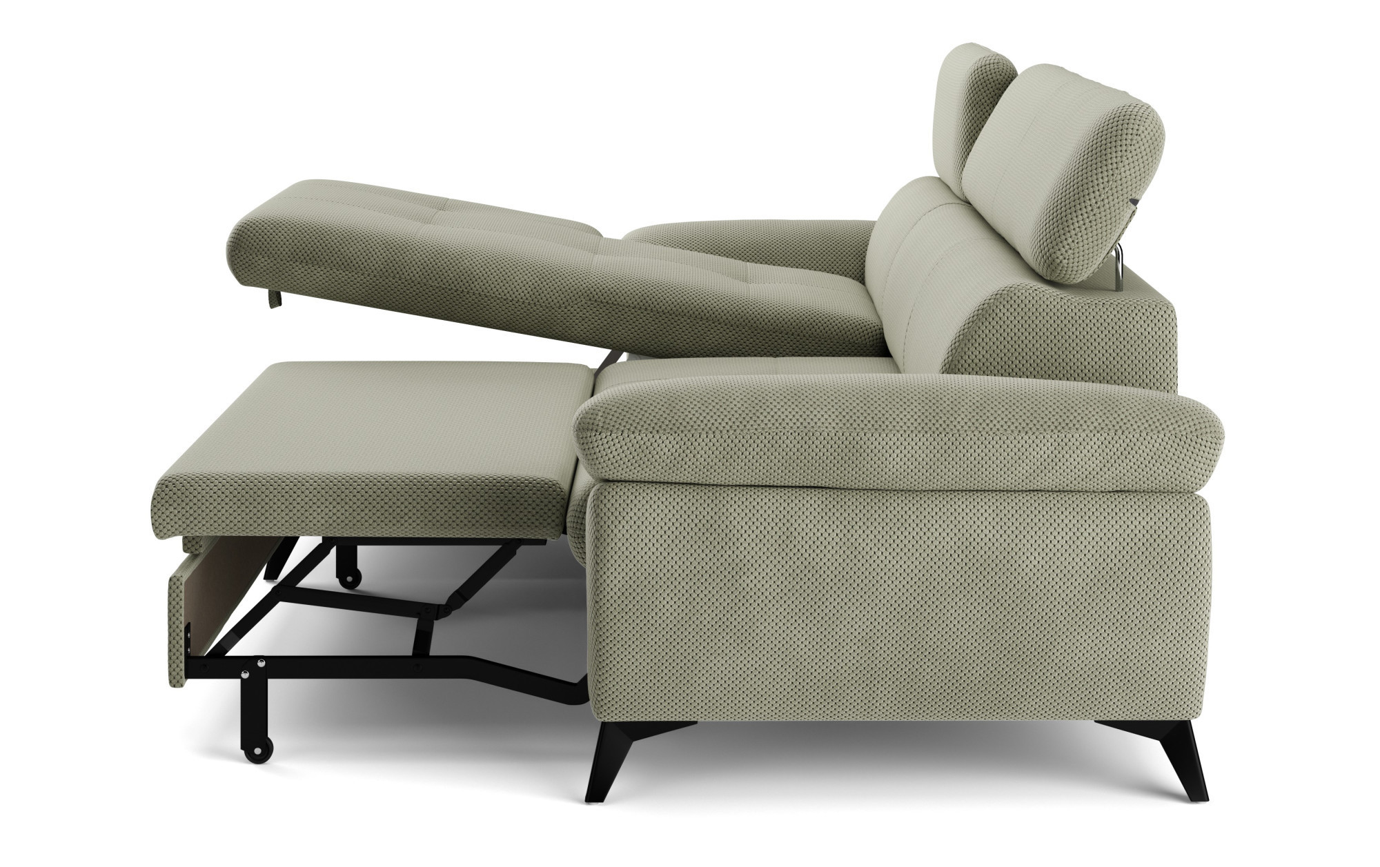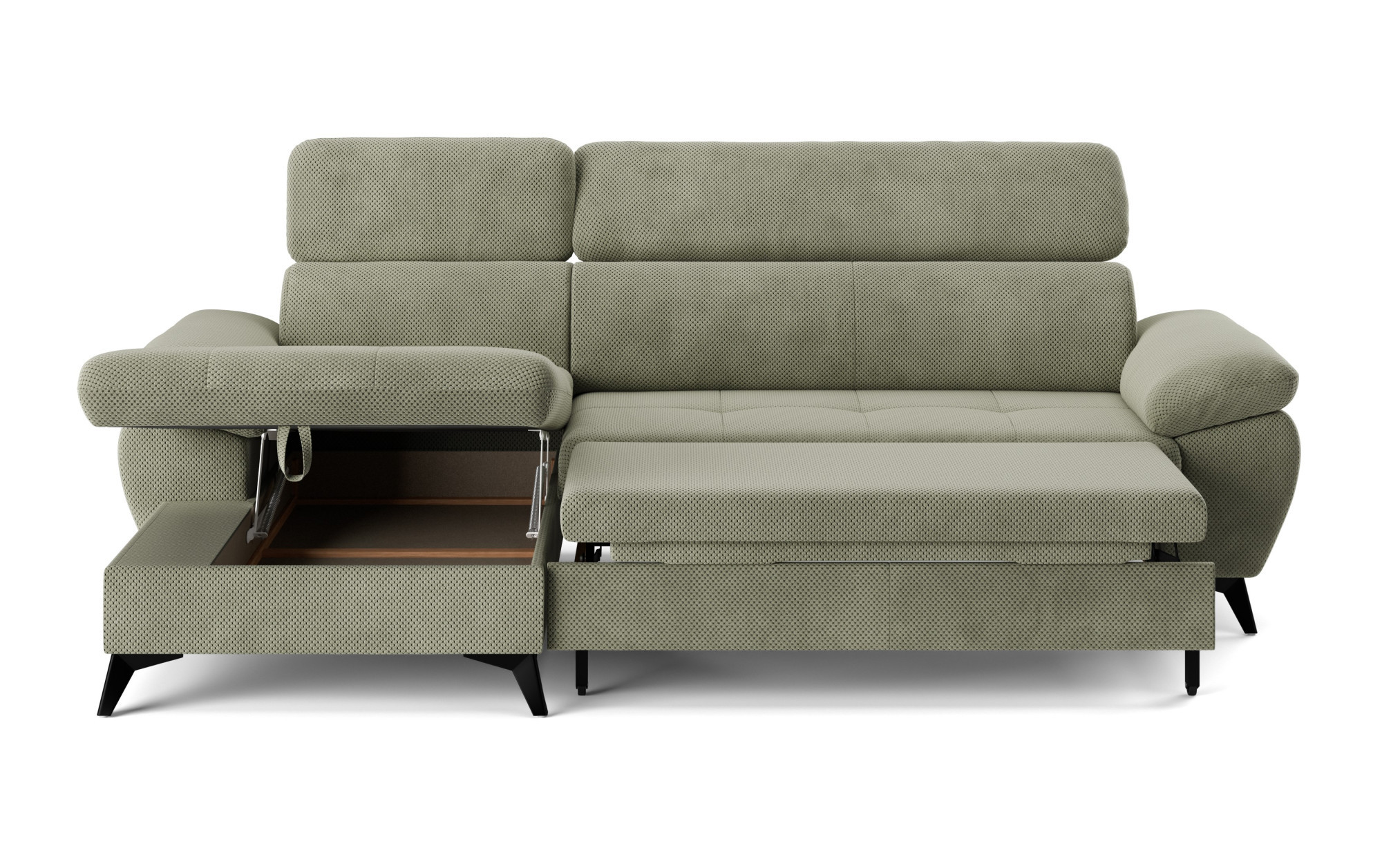 Súčasťou tejto sedacej súpravy je aj funkcia príležitostného spania, ktorú oceníte pri návštevách hostí alebo v prípade potreby rýchlo vytvoriť komfortné miesto na oddych. Pre ešte väčší komfort je sedák tvorený penou z molitanu rôznych hustôt a oceľovými zvlněnými pružinami, čo zabezpečuje rovnováhu medzi mäkkosťou a stabilnou oporou. Vďaka vyšším kovovým nohám nie je upratovanie pod sedačkou nijako náročné, a navyše celok pôsobí ľahko a vzdušne.