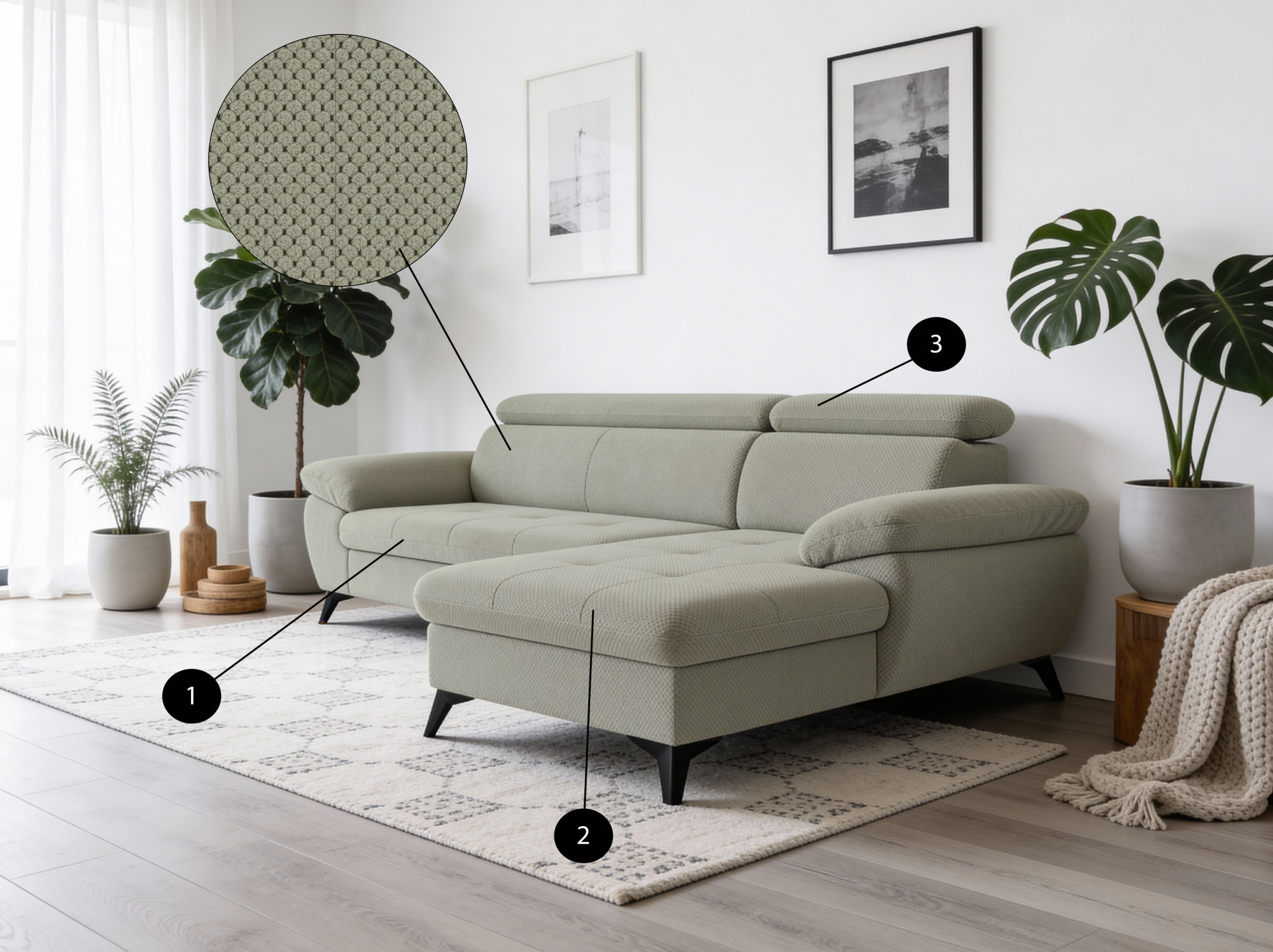 - Látka Miracle C276 Turtle – zamatový bouclé vzhľad, vysoká odolnosť 100 000 cyklov, vhodná pre domácnosti s deťmi a zvieratami.