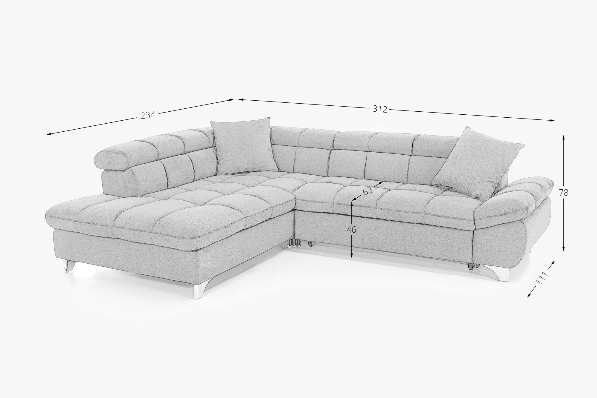 Sedacia súprava je navrhnutá s ohľadom na vaše potreby – ponúka praktickú funkciu rozkladacej postele pre príležitostné spanie hostí a zabezpečuje maximálne pohodlie pri oddychu. Nastaviteľné opierky hlavy umožnia ešte väčšiu relaxáciu pri sledovaní televízie alebo čítaní. Rozmery sedačky sú šírka 312 cm a hĺbka 234 cm, k dispozícii je varianta s rohom vľavo alebo vpravo podľa usporiadania vášho priestoru. Kovové nohy vo výške 10 cm dodávajú súprave ľahký a vzdušný vzhľad a umožňujú jednoduchú údržbu podlahy pod sedačkou. Táto rohová sedacia súprava s funkciou spania je perfektnou voľbou pre rodiny aj milovníkov pohodlia, ktorí ocenia kvalitné spracovanie a nadčasový dizajn.