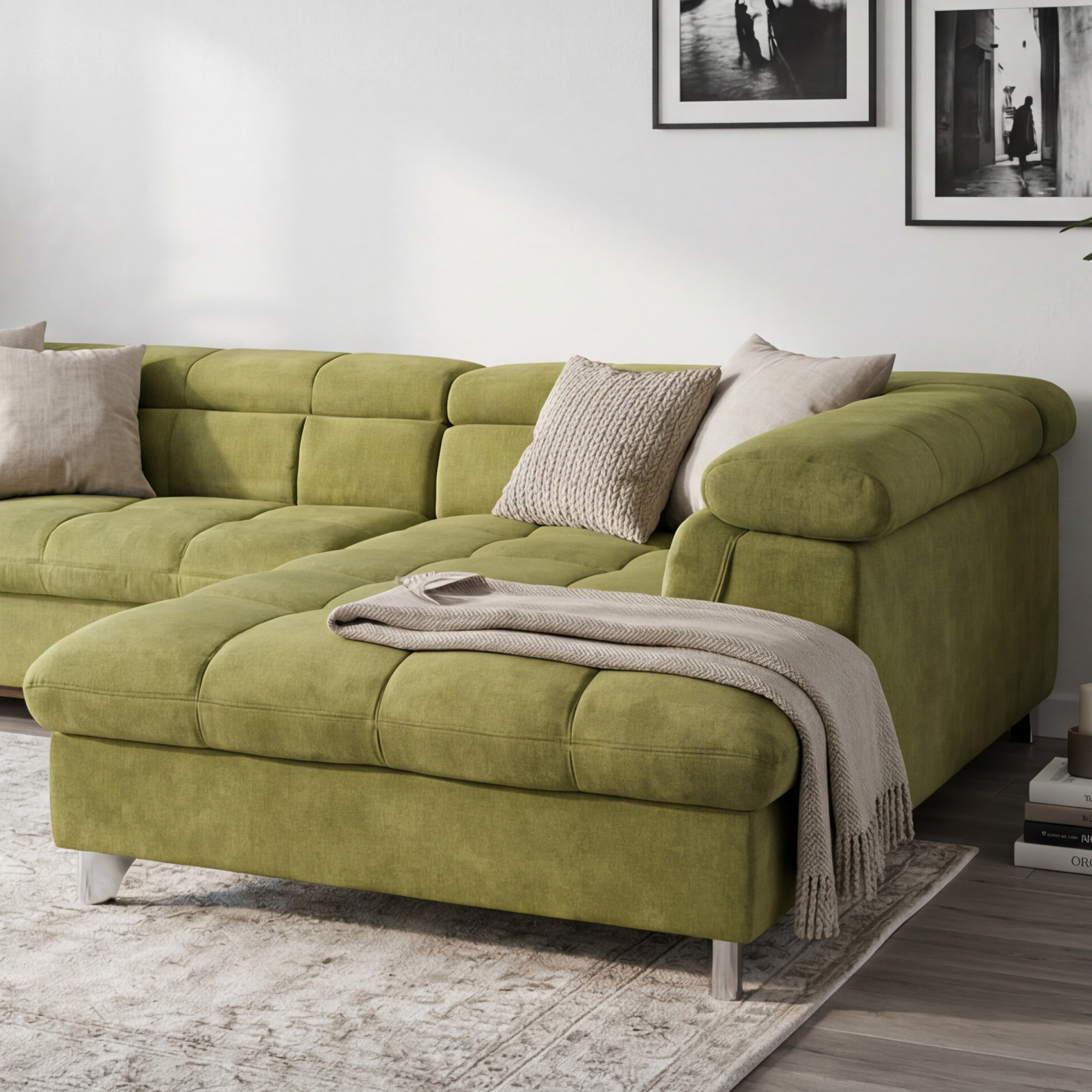 Predstavujeme vám luxusnú rohovú sedaciu súpravu v elegantnej zelenej farbe, ktorá dokonale spája moderný dizajn, komfort a praktické funkcie. Táto elegantná pohovka je ideálnou voľbou pre každú obývačku, kde hľadáte kombináciu relaxácie a funkčnosti. Vďaka robustnej konštrukcii z tvrdého dreva a borovice v kombinácii s kvalitnými čalúnnickými materiálmi získavate nábytok, ktorý vydrží dlhé roky. Čalúnenie je vytvorené z penovej peny rôznych hustôt, ktorá poskytuje perfektnú rovnováhu medzi mäkkosťou a pevným oporou pre vaše telo.