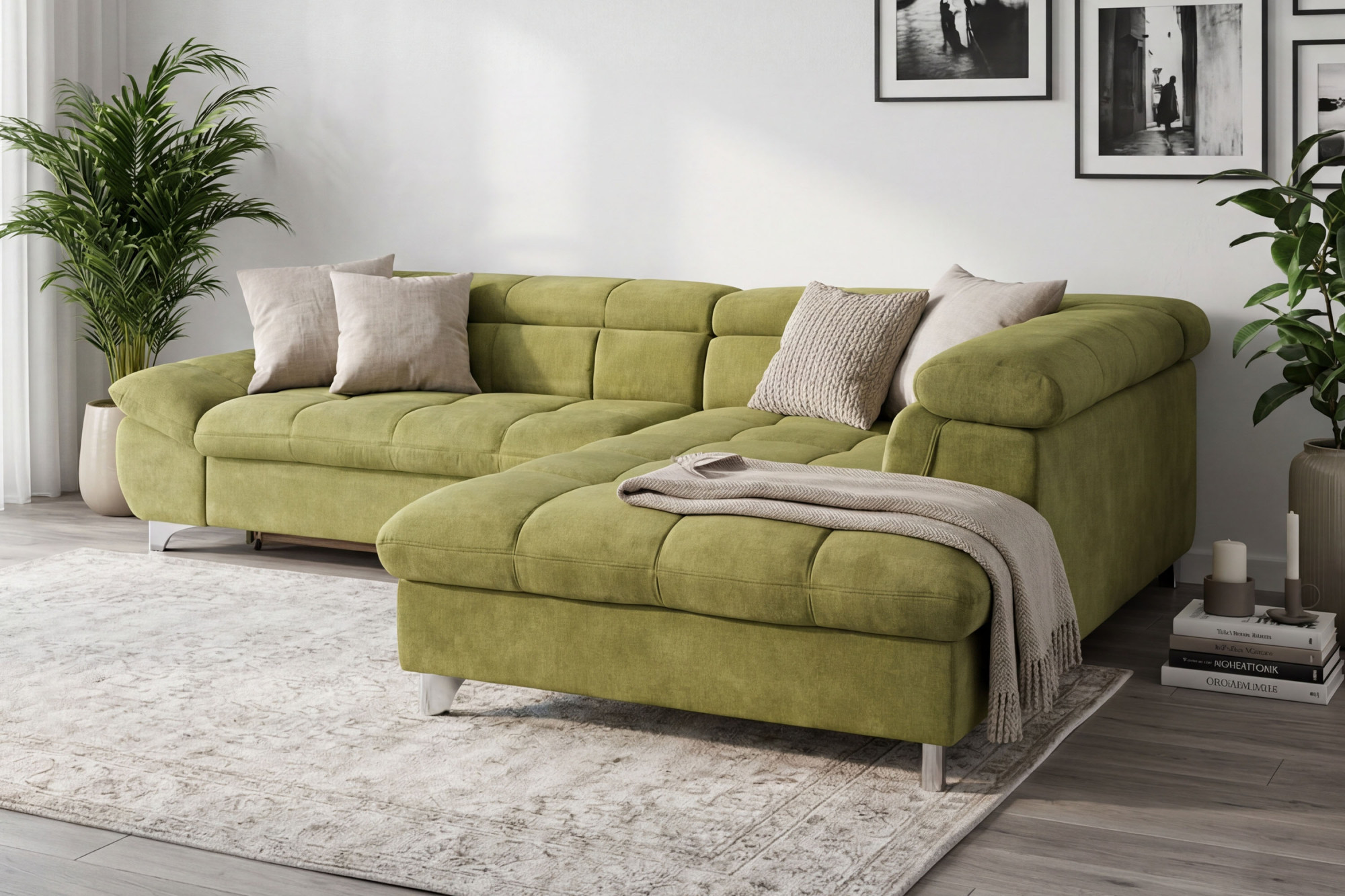 Sedacia súprava je navrhnutá s ohľadom na vaše potreby – ponúka praktickú funkciu rozkladacieho lôžka pre príležitostné prespanie hostí a zabezpečuje maximálne pohodlie pri oddychu. Nastaviteľné opierky hlavy umožnia ešte väčšiu relaxáciu pri sledovaní televízie alebo čítaní. Rozmery pohovky sú šírka 312 cm a hĺbka 234 cm, k dispozícii je varianta s rohom vľavo alebo vpravo podľa usporiadania vášho priestoru. Kovové nohy vo výške 10 cm dodávajú súprave ľahký a vzdušný vzhľad a umožňujú jednoduchú údržbu podlahy pod sedačkou. Táto rohová sedacia súprava s funkciou spania v nadčasovej zelenej farbe je perfektnou voľbou pre rodiny aj milovníkov pohodlia, ktorí oceňujú kvalitné spracovanie a nadčasový dizajn.