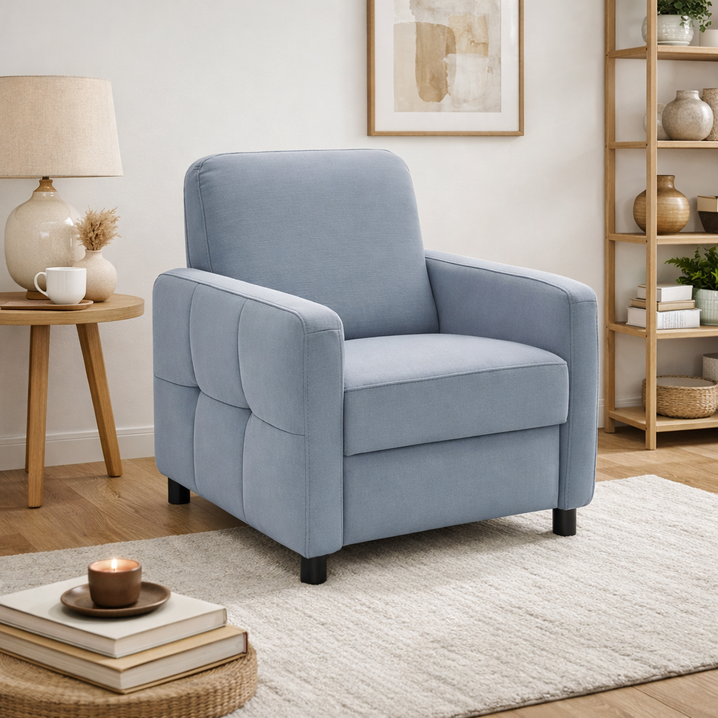 Kreslo Ema je ideálnym riešením pre moderné domácnosti, ktoré hľadajú kompaktné rozmery, vysoký komfort a praktické využitie. Vďaka svojmu minimalistickému dizajnu a jemnému geometrickému prešívaniu pôsobí nadčasovo a ľahko zapadne do obývačky, pracovne aj študentskej izby.