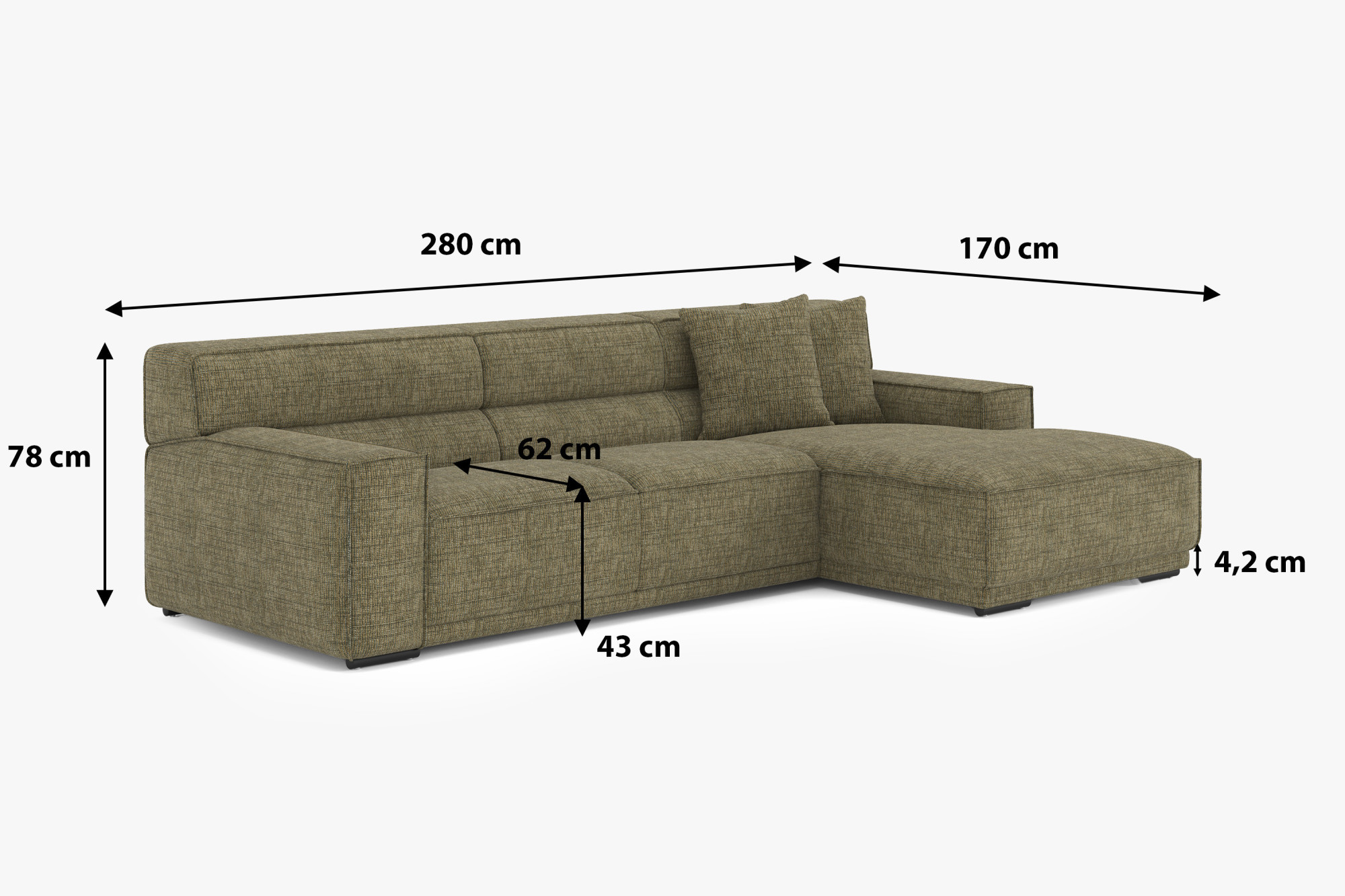- Hĺbka sedu cca 62 cm, výška sedu cca 43 cm