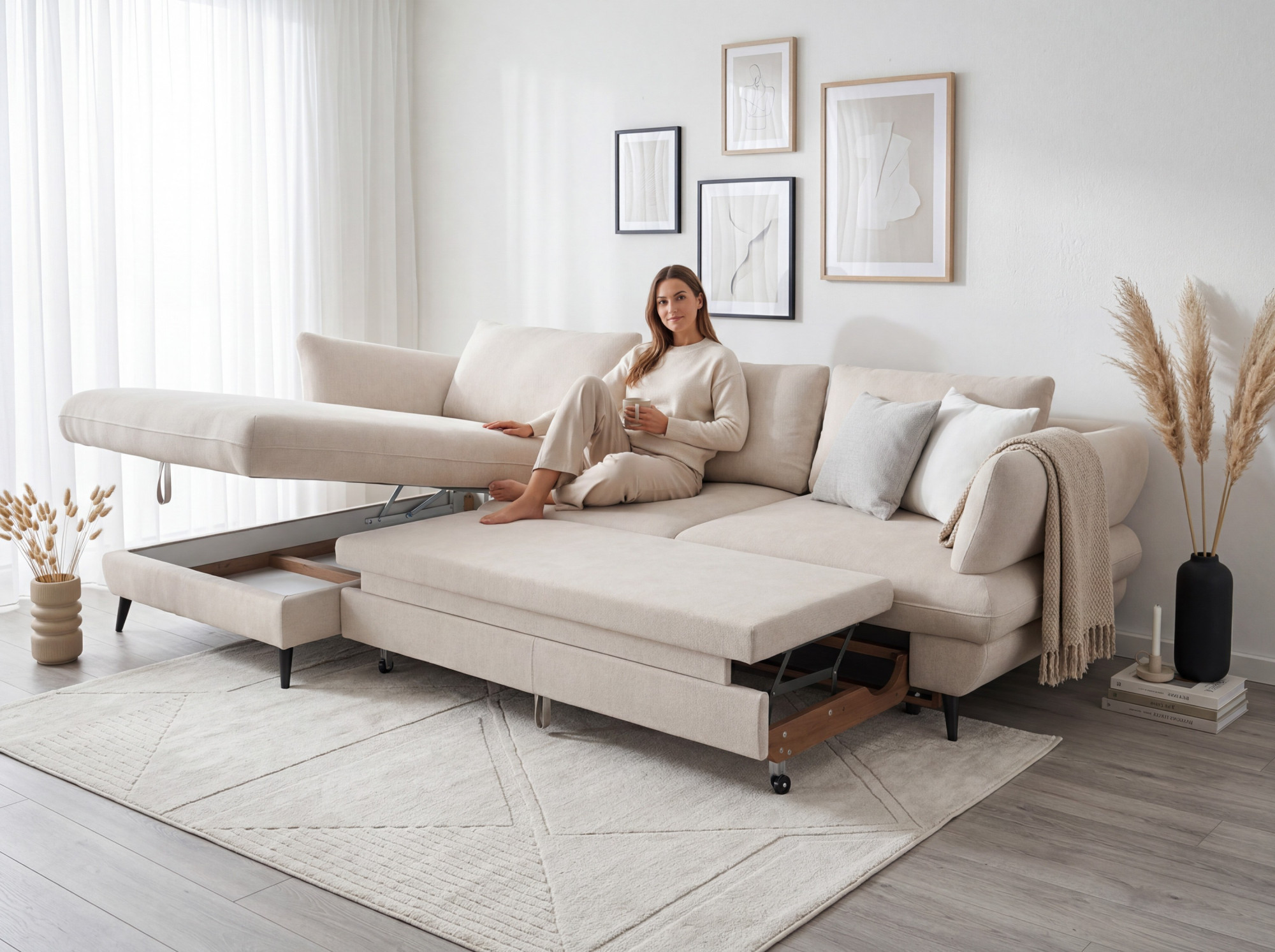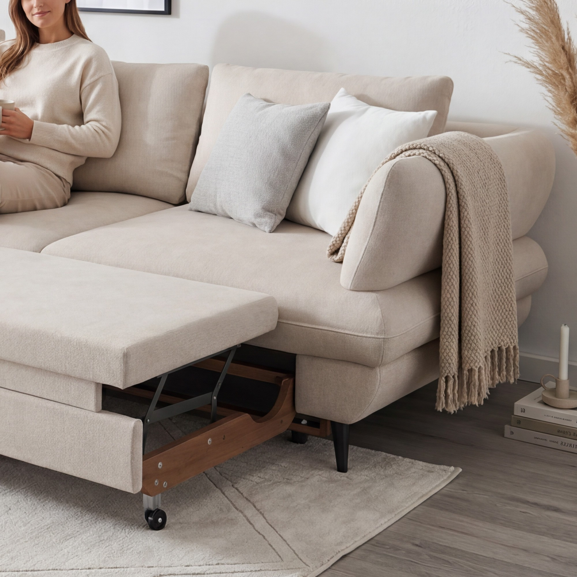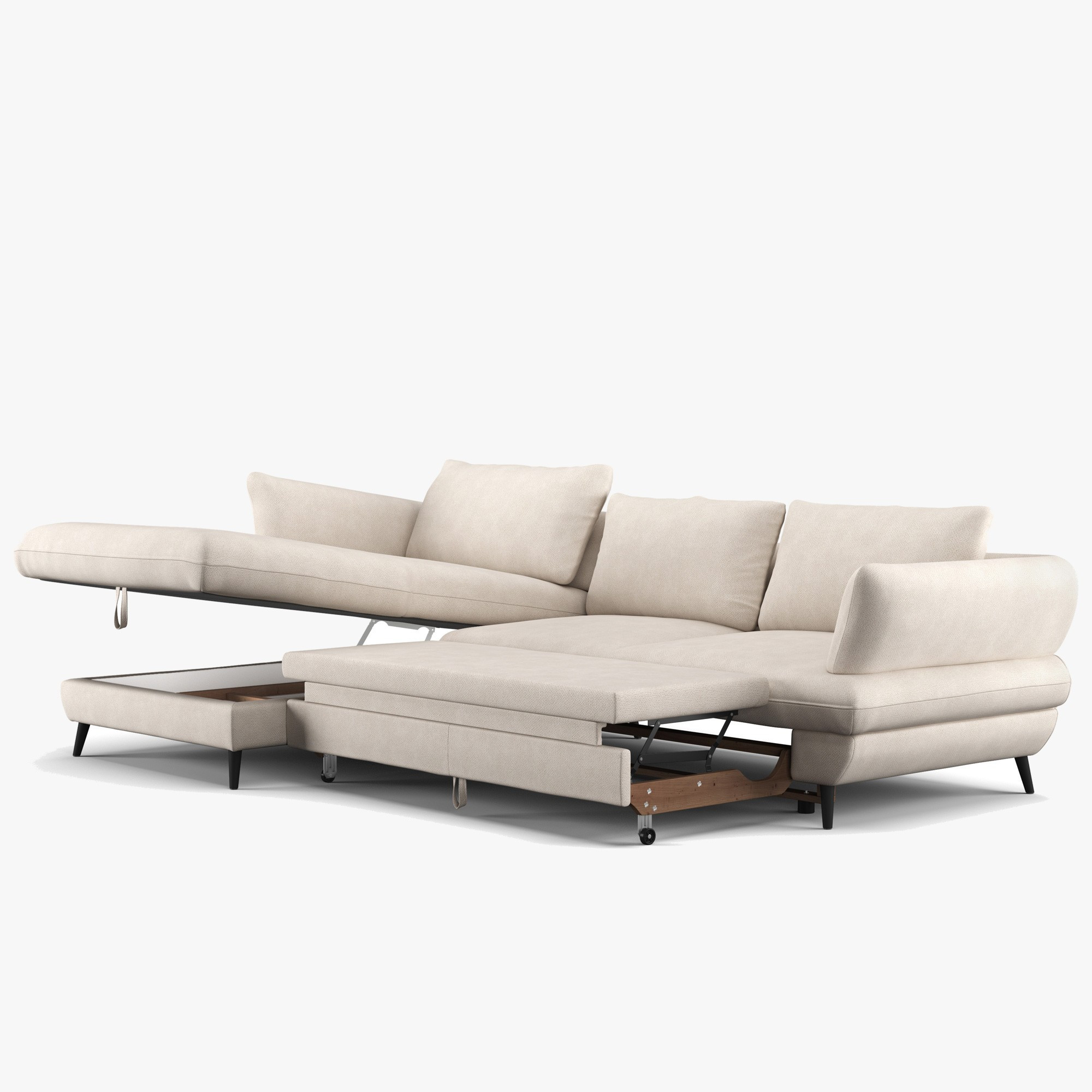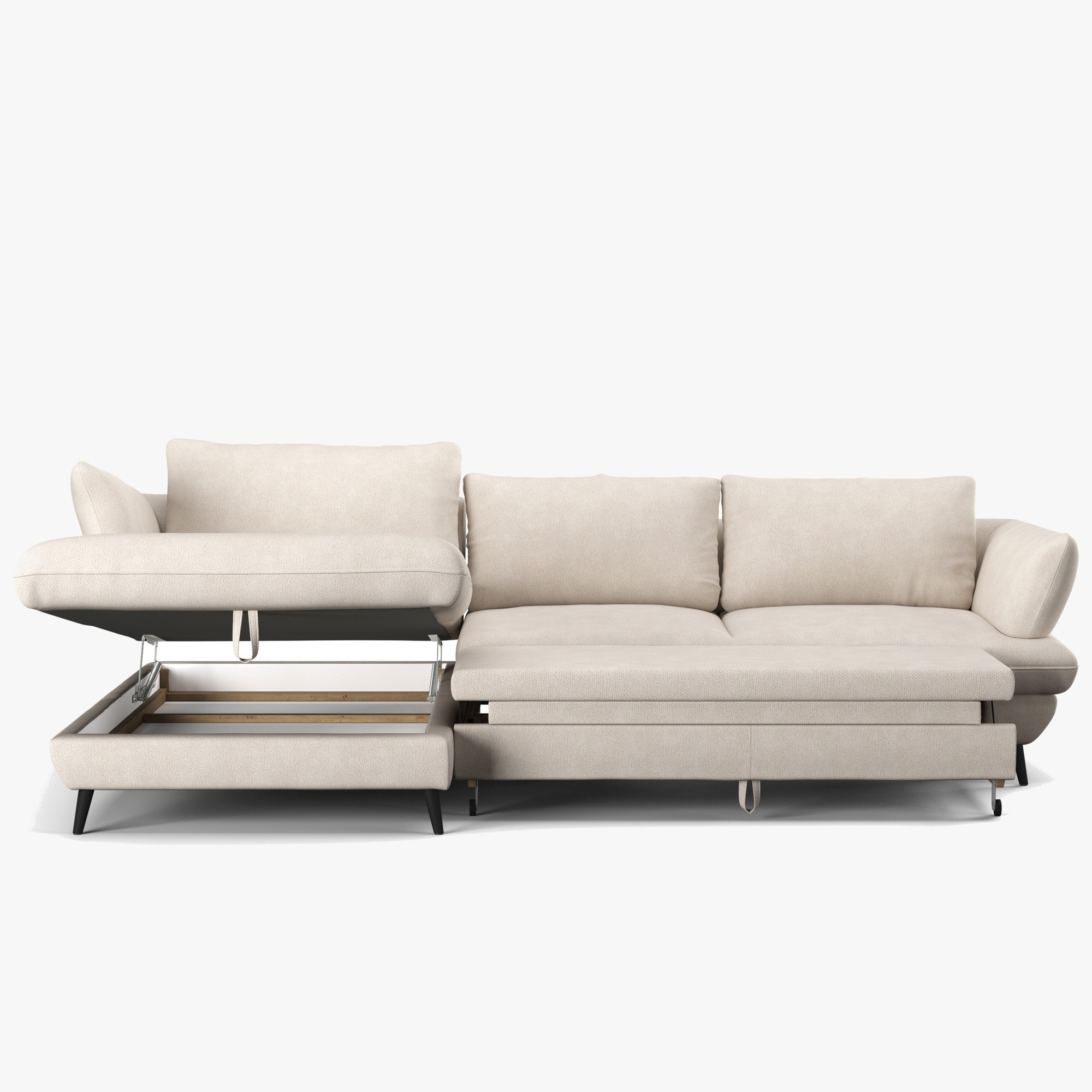 Kostra je vyrobená z tvrdého dreva a borovice, doplnená o drevotriesku bez formaldehydu a kvalitné PU peny bez freónov. Sedák je osadený oceľovými vlnitými pružinami, operadlo tvoria čalúnnické popruhy pre príjemnú oporu chrbta. Praktická je funkcia lôžka i úložný priestor na posteľnú bielizeň. Voľne ložené zadné vankúše a čierna kovová podnož (výška 12,5 cm) dodávajú moderný charakter a uľahčujú upratovanie.