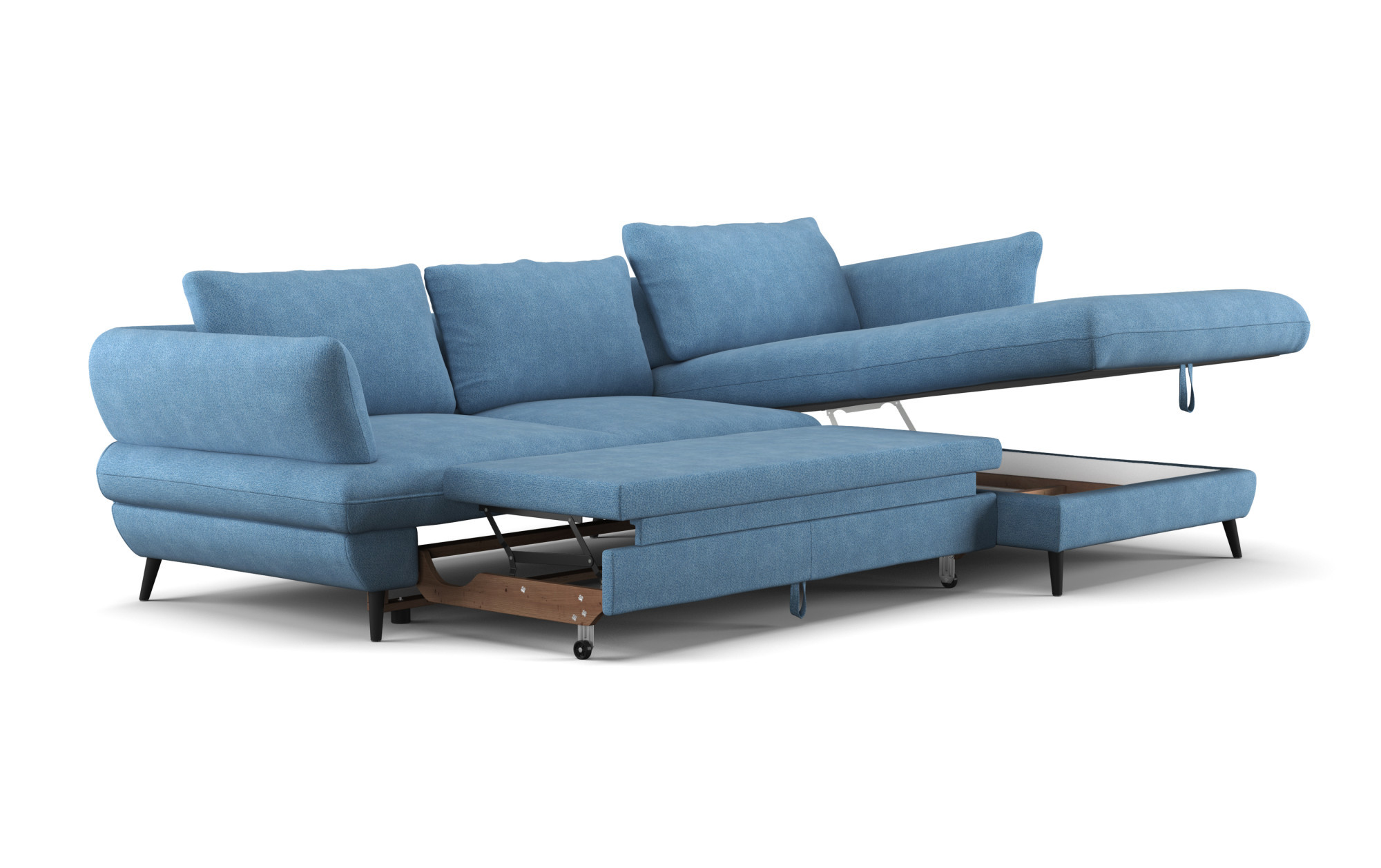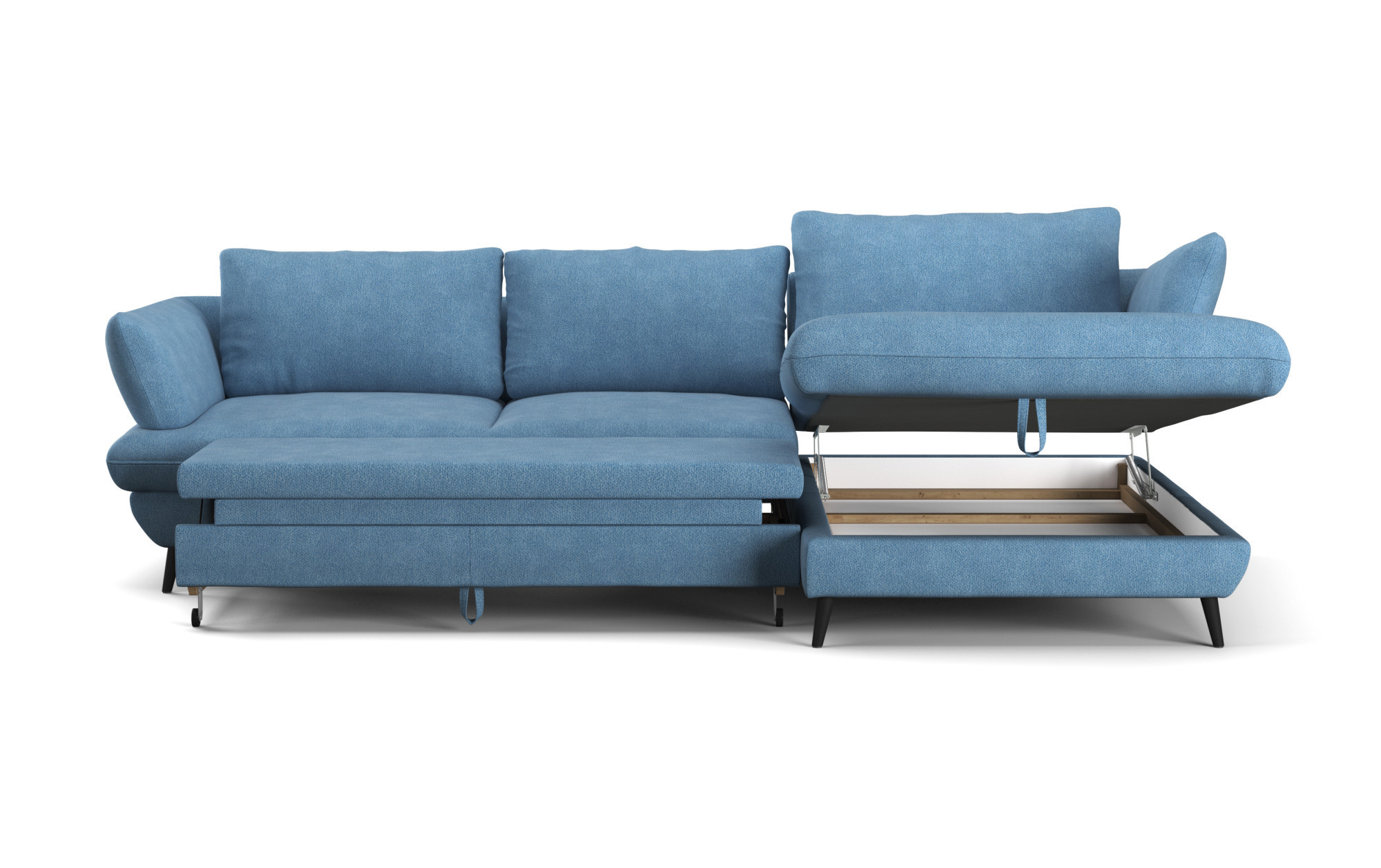 Kostra je vyrobená z tvrdého dreva a borovice, doplnená o drevoštiepkovú dosku bez formaldehydu a kvalitné PU peny bez freónov. Sedák je osadený oceľovými vlnitými pružinami, operadlo tvoria čalúnnické popruhy pre príjemnú oporu chrbta. Praktická je funkcia lôžka aj úložný priestor pre posteľnú bielizeň. Voľne ložené zadné vankúše a čierna kovová podnož (výška 12,5 cm) dodávajú moderný charakter a uľahčujú upratovanie.