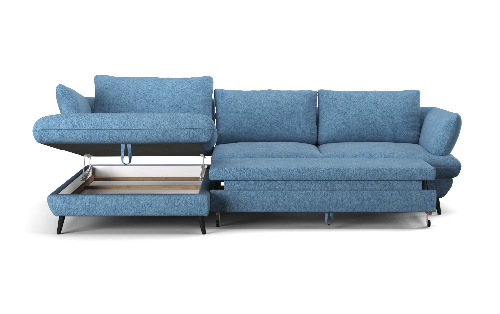 Kostra je vyrobená z tvrdého dreva a borovice, doplnená o drevootriesku bez formaldehydu a kvalitné PU peny bez freónov. Sedák je osadený oceľovými vlnitými pružinami, operadlo tvoria čalúnnické popruhy pre príjemnú oporu chrbta. Praktická je funkcia lôžka aj úložný priestor pre posteľnú bielizeň. Voľne ložené zadné vankúše a čierna kovová podnož (výška 12,5 cm) dodávajú moderný charakter a uľahčujú upratovanie.