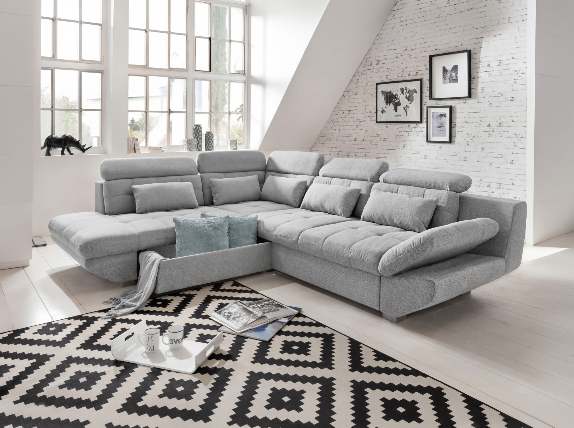 - Priestranný úložný priestor pod rohovou časťou na uloženie posteľnej bielizne.