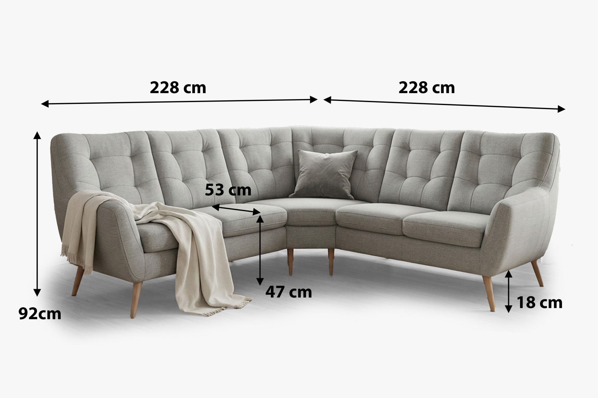 Rozmery sedačky (228 × 228 cm) poskytujú dostatok priestoru pre pohodlné sedenie celej rodiny. Drevené nožičky s výškou 18 cm dodávajú nábytku ľahkosť a umožňujú jednoduché čistenie pod sedačkou. Scandi kolekcia ponúka aj ďalšie varianty ako kreslo, dvojmiestnu alebo trojmiestnu sedačku, takže si ľahko zladíte celý interiér. Vďaka svojmu univerzálnemu štýlu sa hodí tak do moderných bytov, ako aj do priestranných rodinných domov. Ak hľadáte pohodlnú rohovú sedačku s vysokým oporným komfortom, model Scandi je tou správnou voľbou.