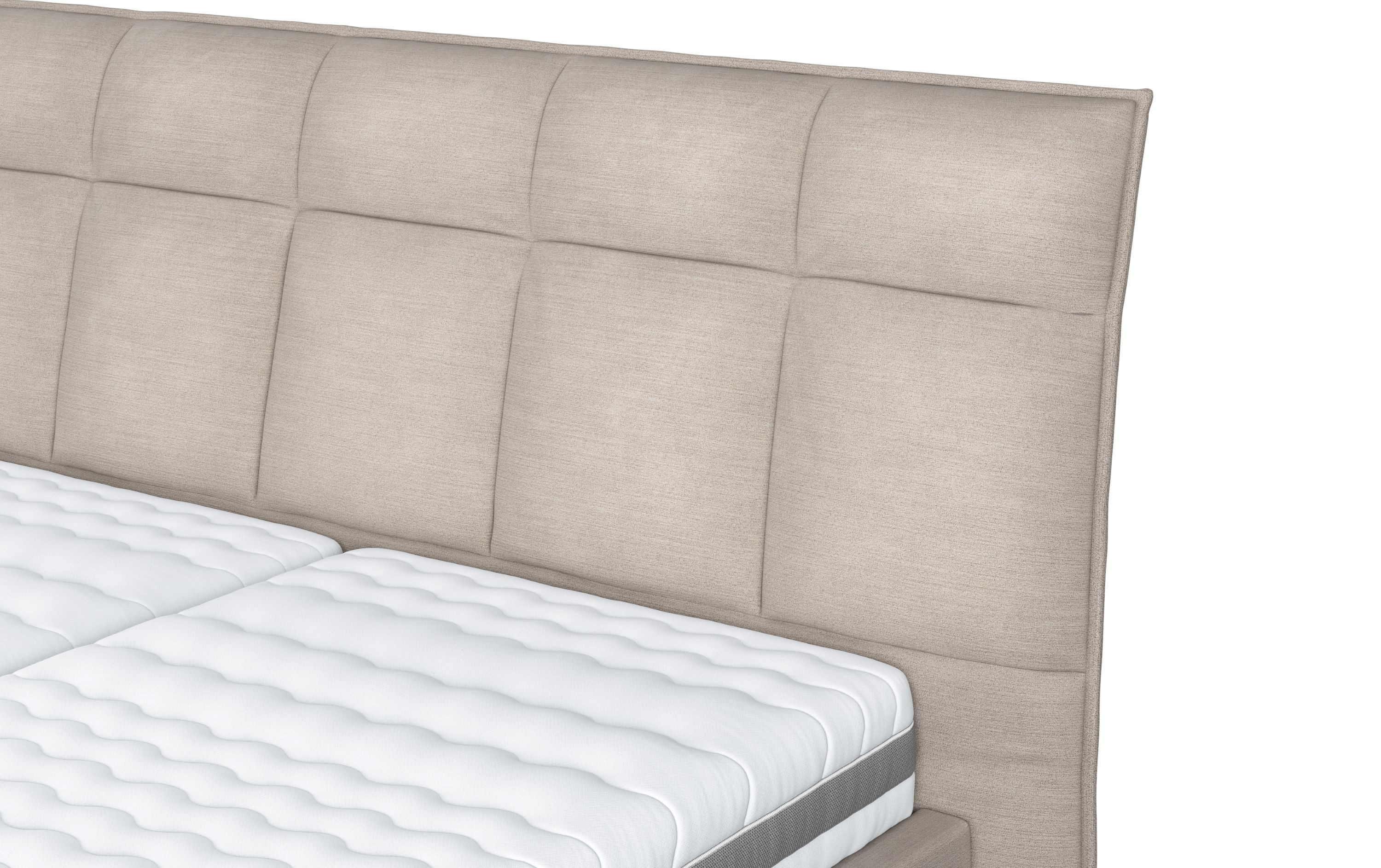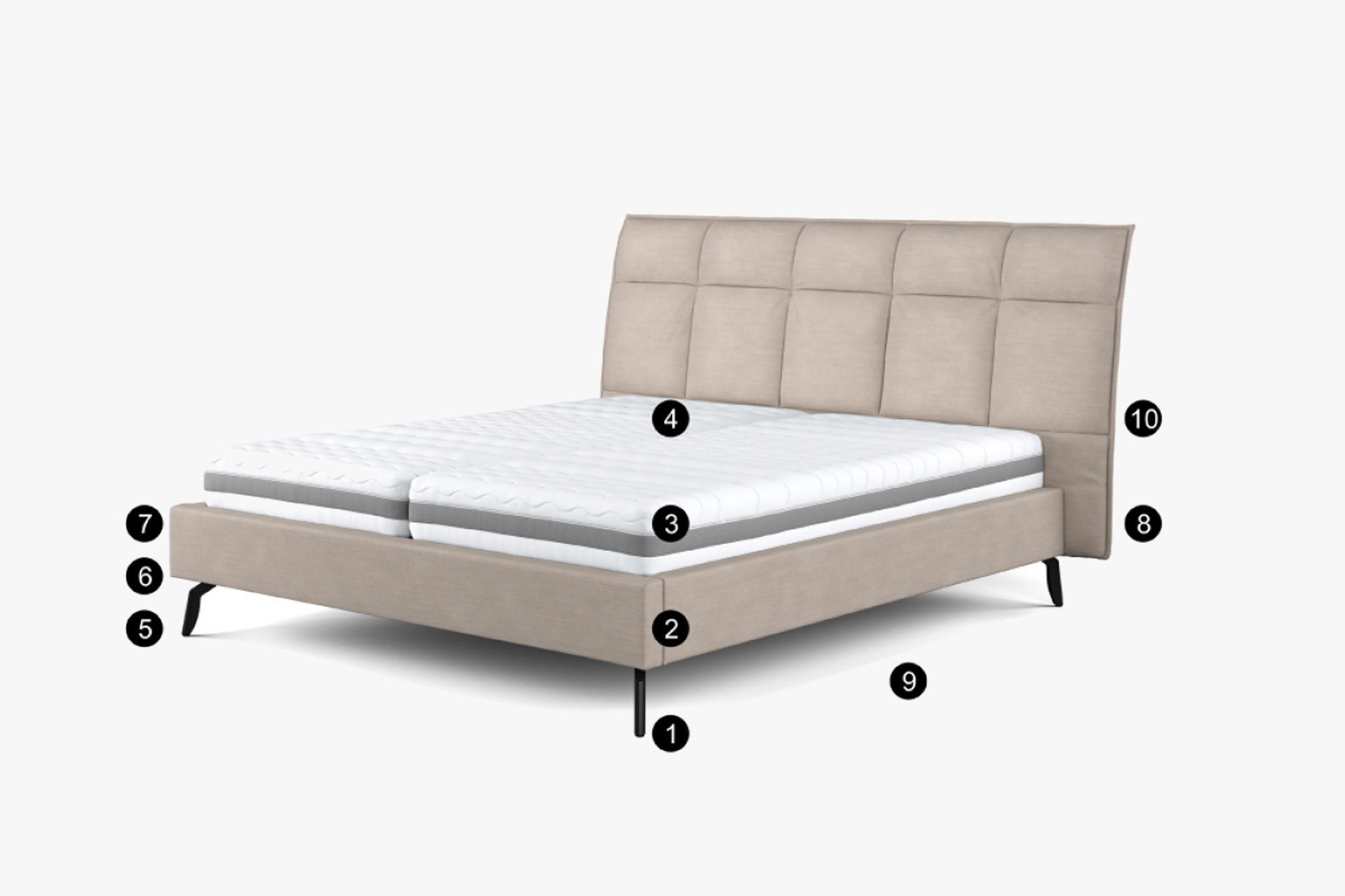 - Rám postele: Rám s nosnými časťami z masívneho dreva, odvetraný posteľový rám 10 mm, preglejka potiahnutá technickou látkou