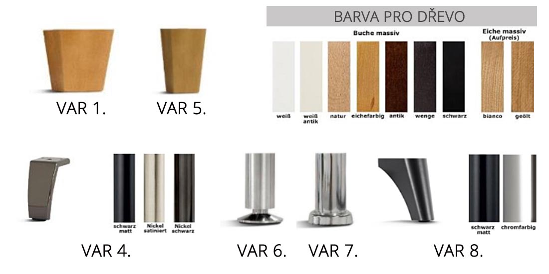 • Var. 1 a Var. 5: Drevené nožičky s možnosťou výberu farby dreva. Dostupné aj vo variante dub (za príplatok).
