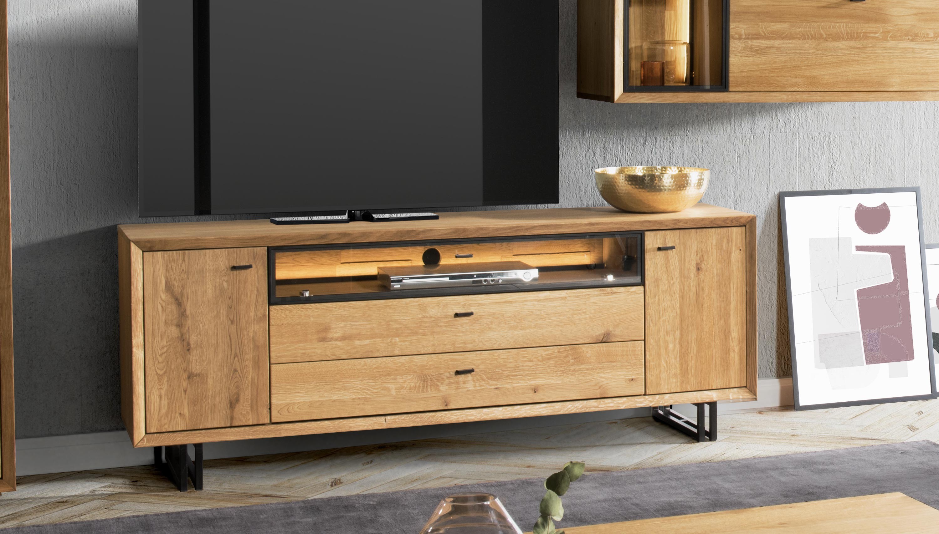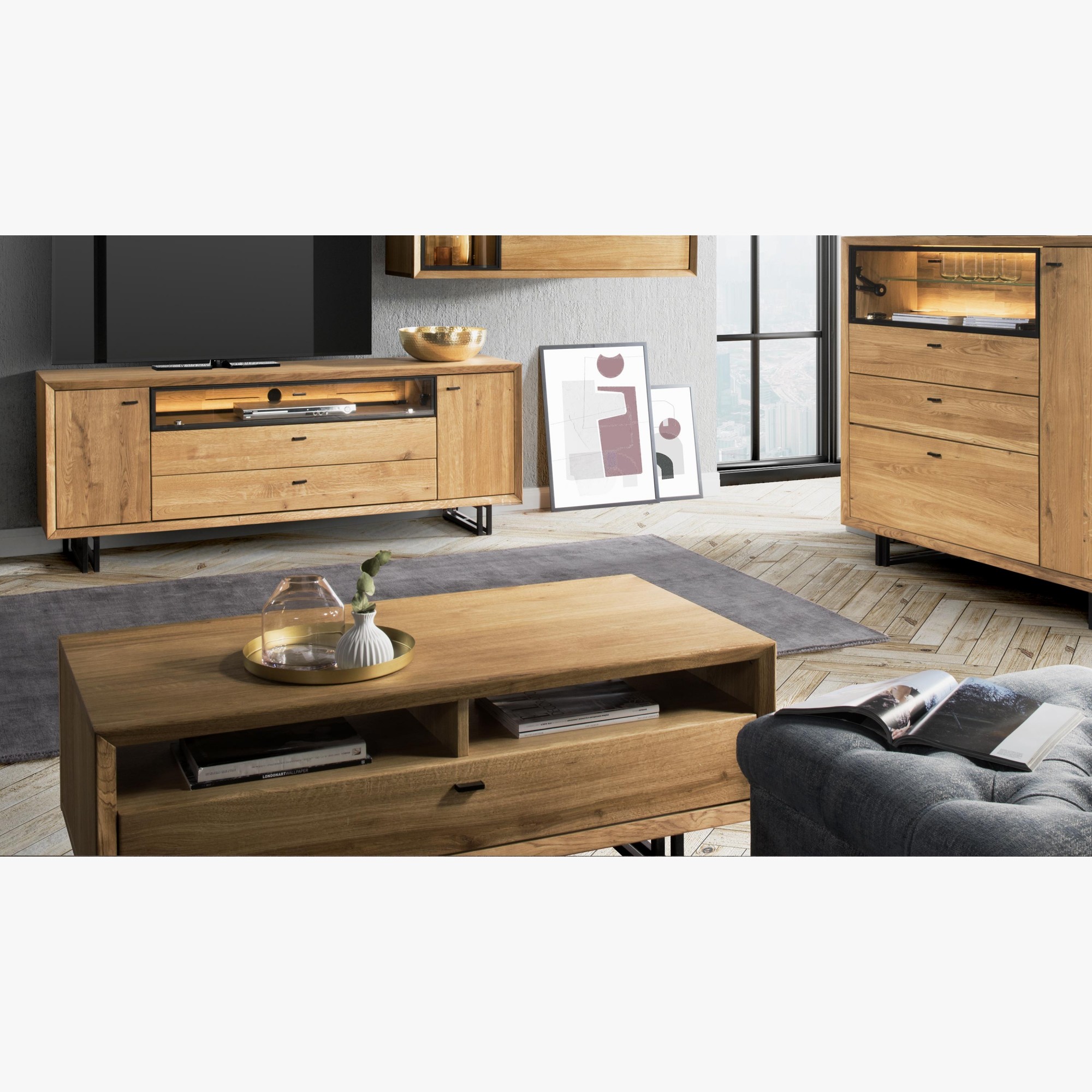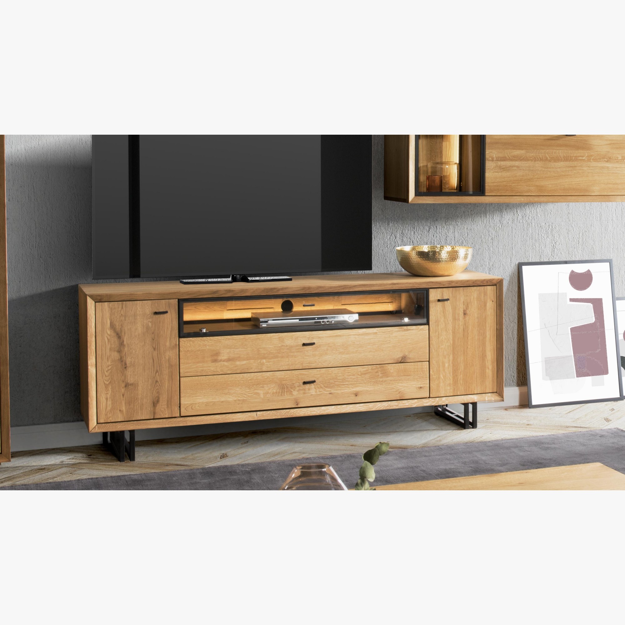 Televízna komoda v nádhernom mierne industriálnom štýle s moderným nadčasovým dizajnom. Tv komoda je z kolekcie nábytku Vilo, čo je novinka predstavená na jeseň 2020. Tv komoda sa dodáva už zmontovaná v prémiovej kvalite prevedenia. Komoda má 2 otváracie dvierka, kde vo vnútri sa nachádza jedna polica, v strednej časti je veľký otvorený priestor zakrytý presklenými dvierkami, ktorý má zo zadnej strany dieru na kabeláž. Pod ktorým sa nachádzajú 2 veľké zásuvky. Kovanie a doťahovanie je tiché soft-close. Predná strana komody je dubové drevo, s jedinečnou štruktúrou prírodného charakteru dreva s jemne štruktúrovaným povrchom. Zvyšok nábytku je prírodná dubová dyha najvyššej kvality.
