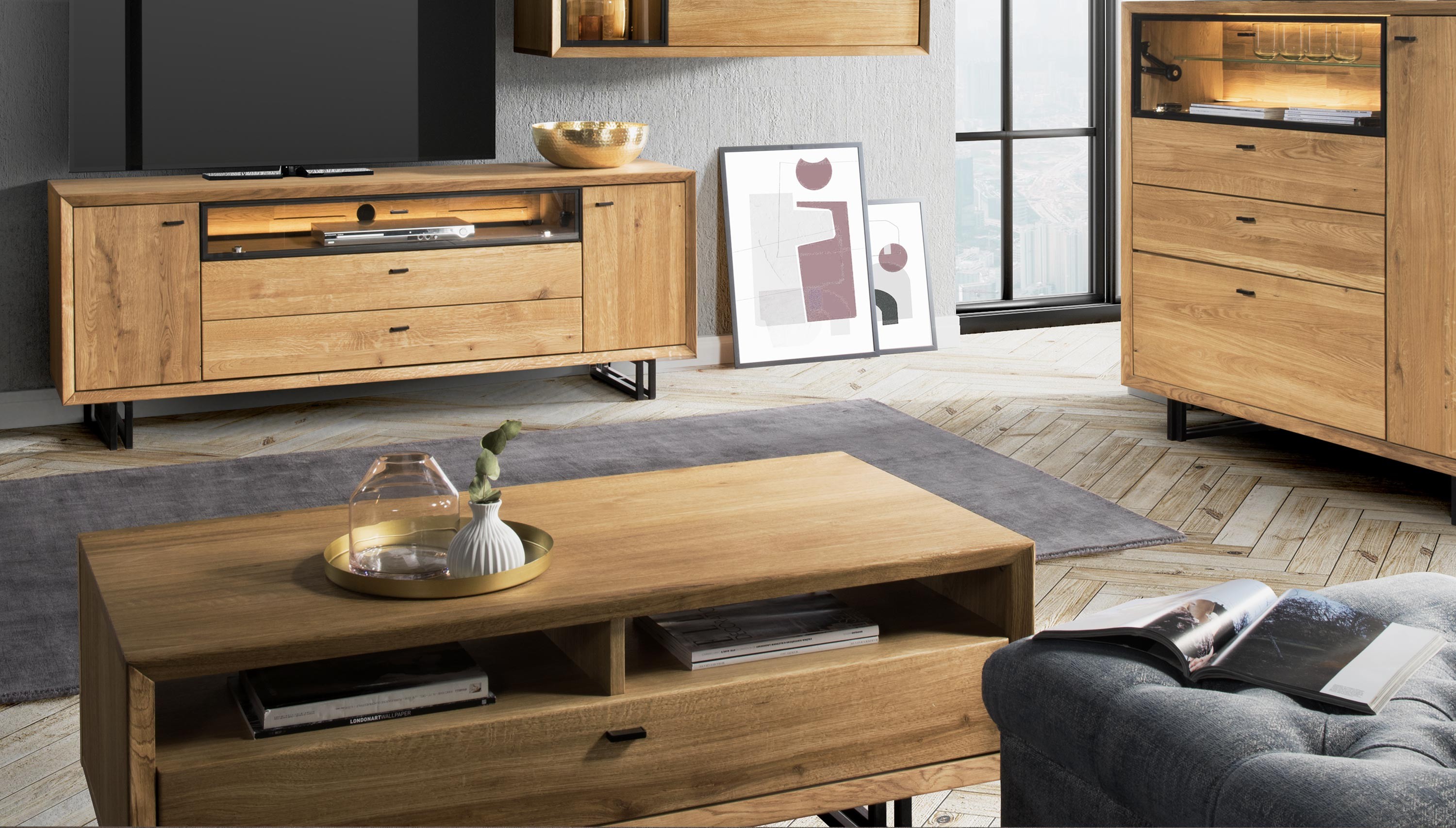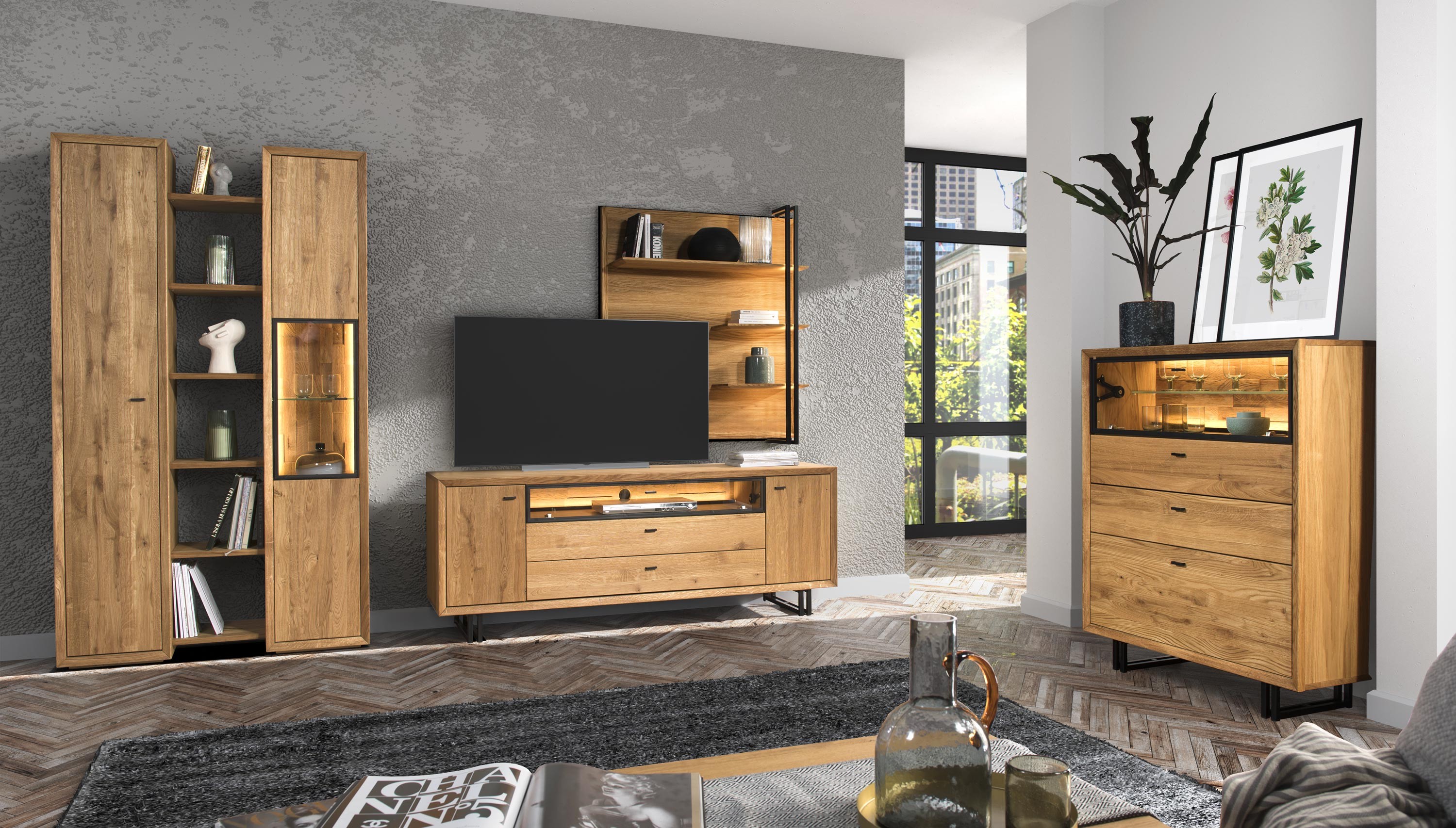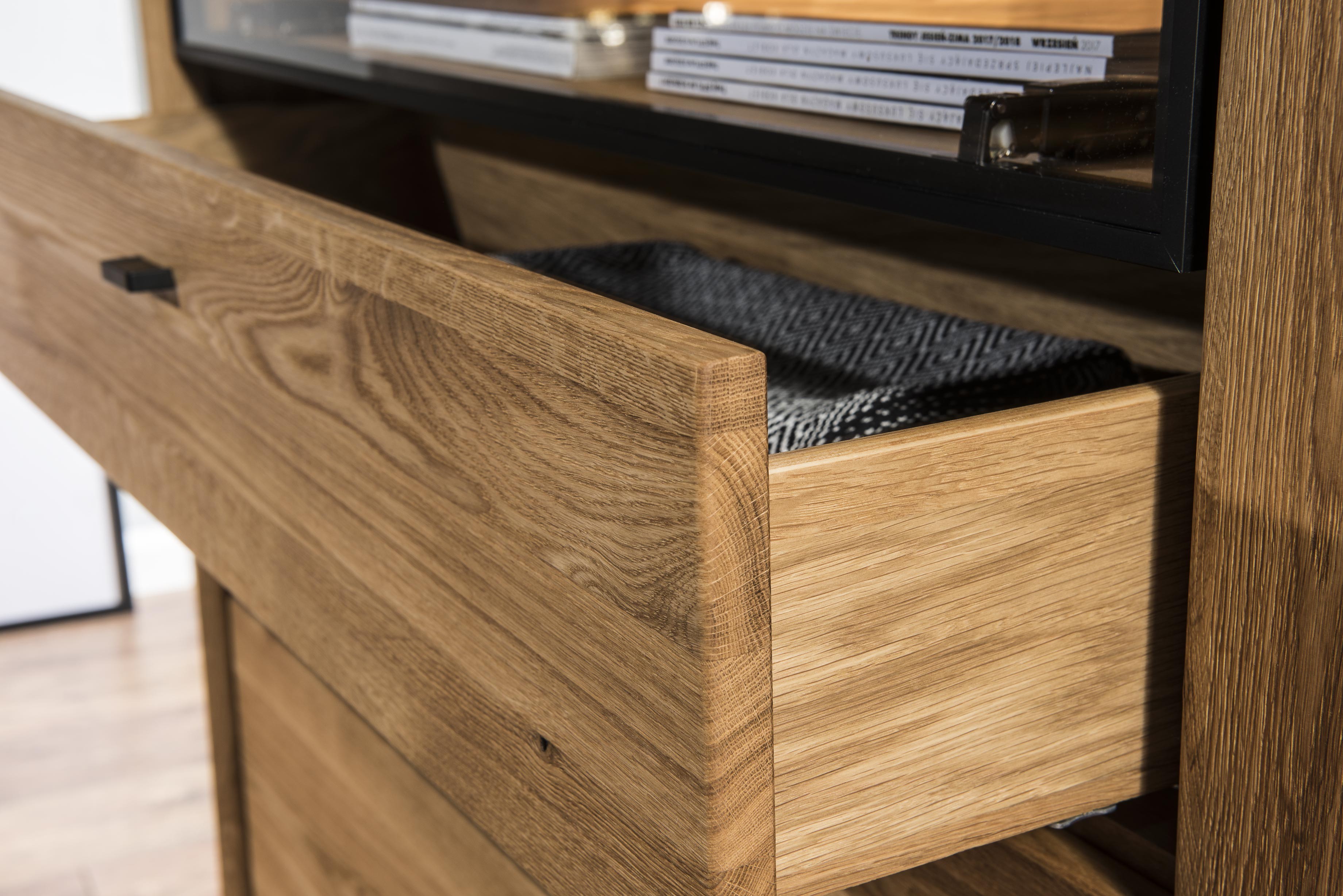 Televízna komoda v nádhernom mierne industriálnom štýle s moderným nadčasovým dizajnom. Tv komoda je z kolekcie nábytku Vilo, čo je novinka predstavená na jeseň 2020. Tv komoda sa dodáva už zmontovaná v prémiovej kvalite prevedenia. Komoda má 2 otváracie dvierka, kde vo vnútri sa nachádza jedna polica, v strednej časti je veľký otvorený priestor zakrytý presklenými dvierkami, ktorý má zo zadnej strany dieru na kabeláž. Pod ktorým sa nachádzajú 2 veľké zásuvky. Kovanie a doťahovanie je tiché soft-close. Predná strana komody je dubové drevo, s jedinečnou štruktúrou prírodného charakteru dreva s jemne štruktúrovaným povrchom. Zvyšok nábytku je prírodná dubová dyha najvyššej kvality.